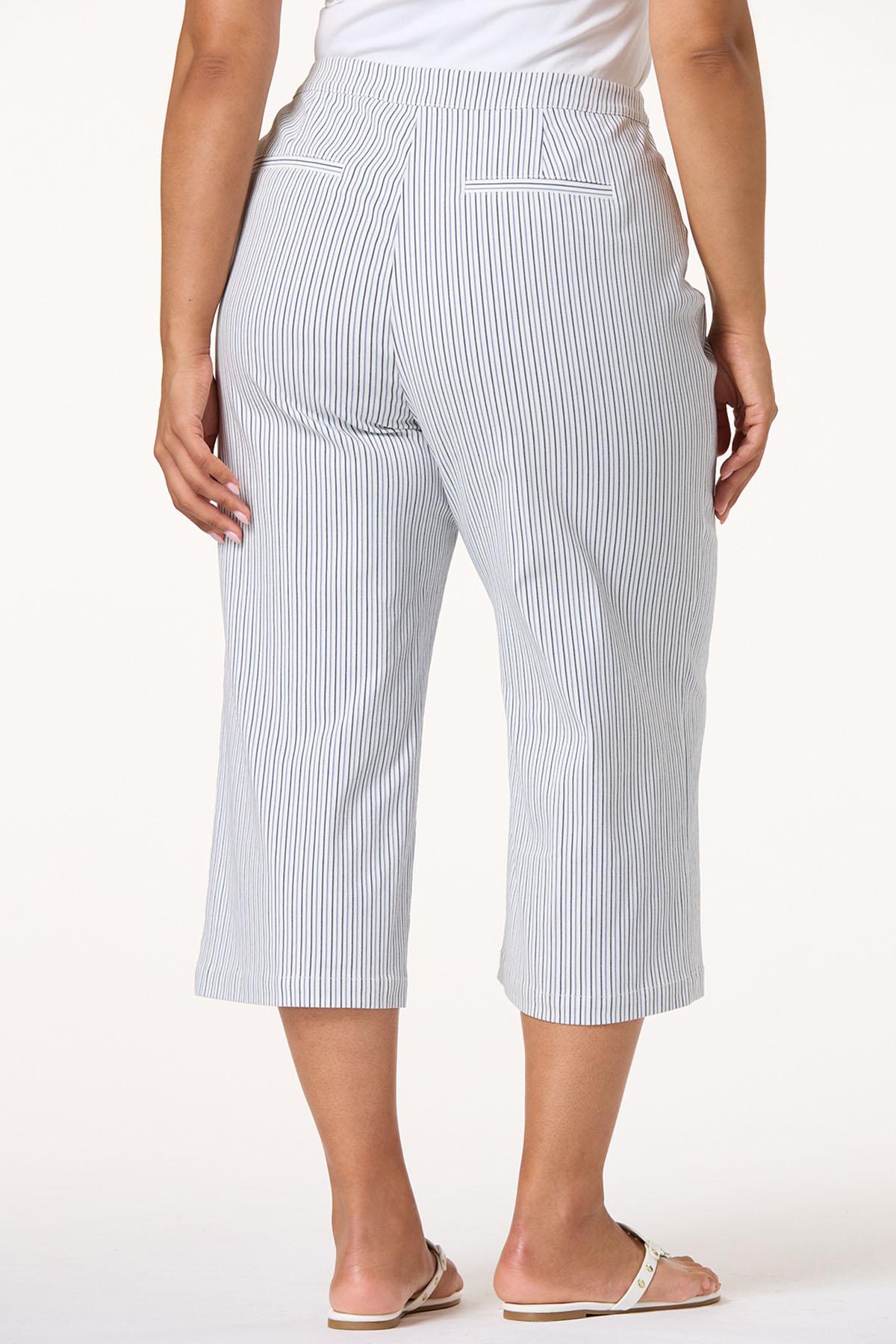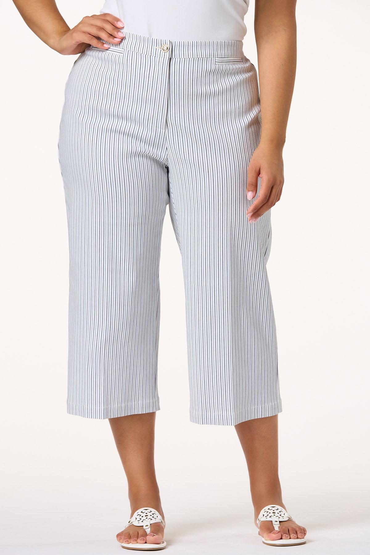 Create a classic look easily with this stretchy, knit style, featuring a button front closure, pin-stripe print and shades of blue and white for a chic, nautical feel. A cool-cropped length and slimming fit makes these a shoe-in for a look you’ll love wearing with a solid basic tank or tee.