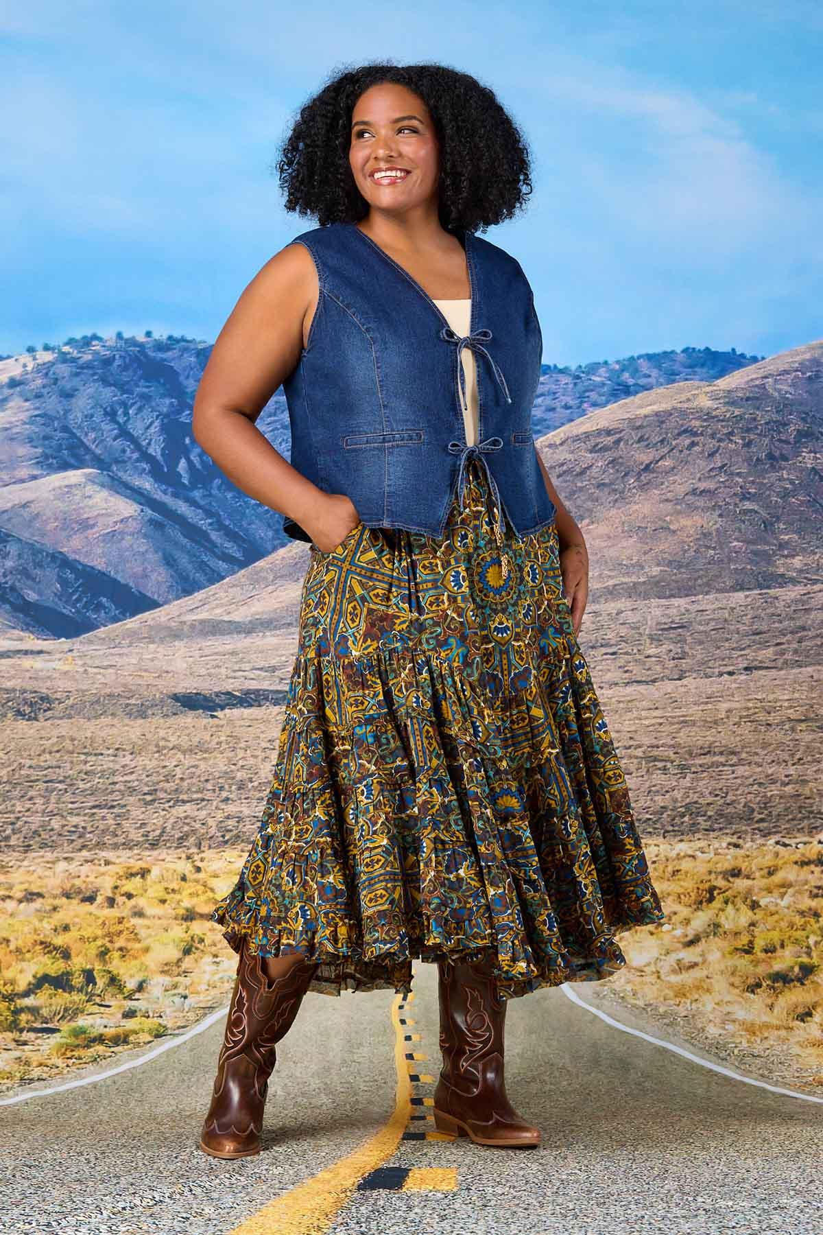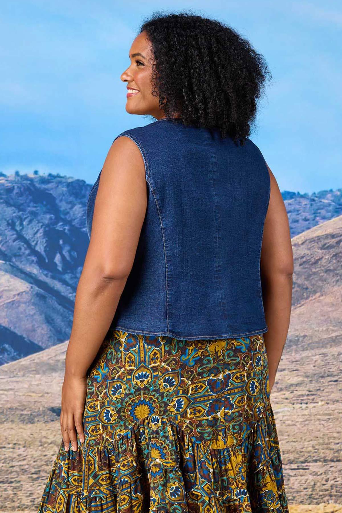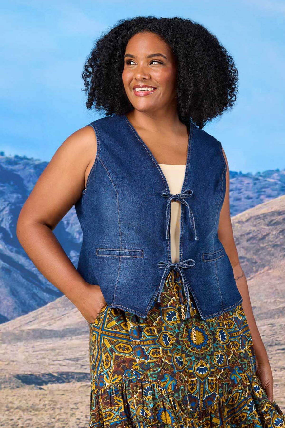 Choose fun, friends and this adorable denim vest to elevate your day. With a comfortable-stretch, flattering fit and trending, double-tie closure, this layering piece is ready for selfies, sunshine and endless good times.