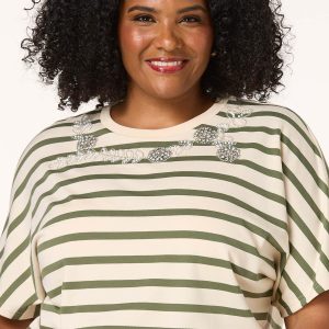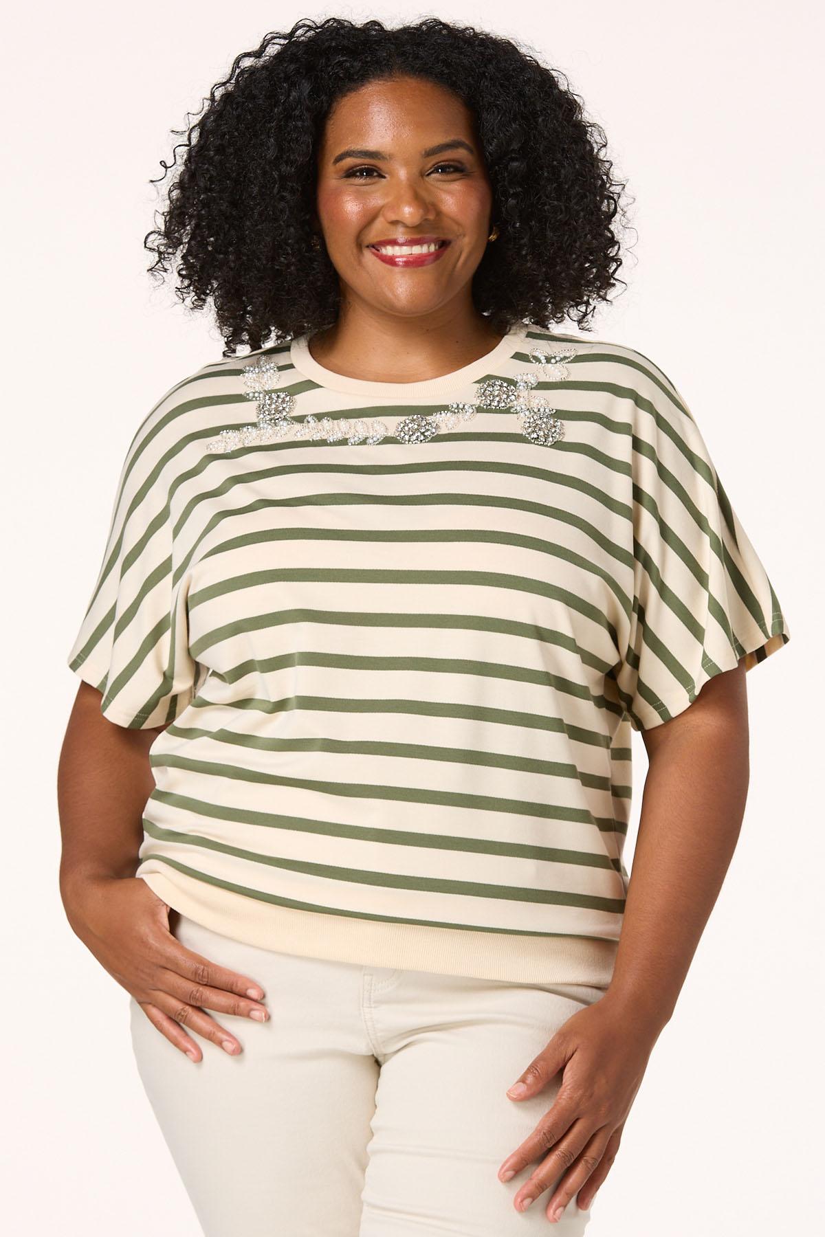 How about a little bling to go with the classic look of this limited edition style, featuring a scoop neckline, rhinestone and pearl embellished detail and a ribbed-banded hem for a casual vibe.