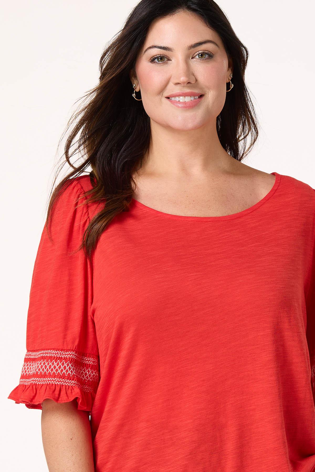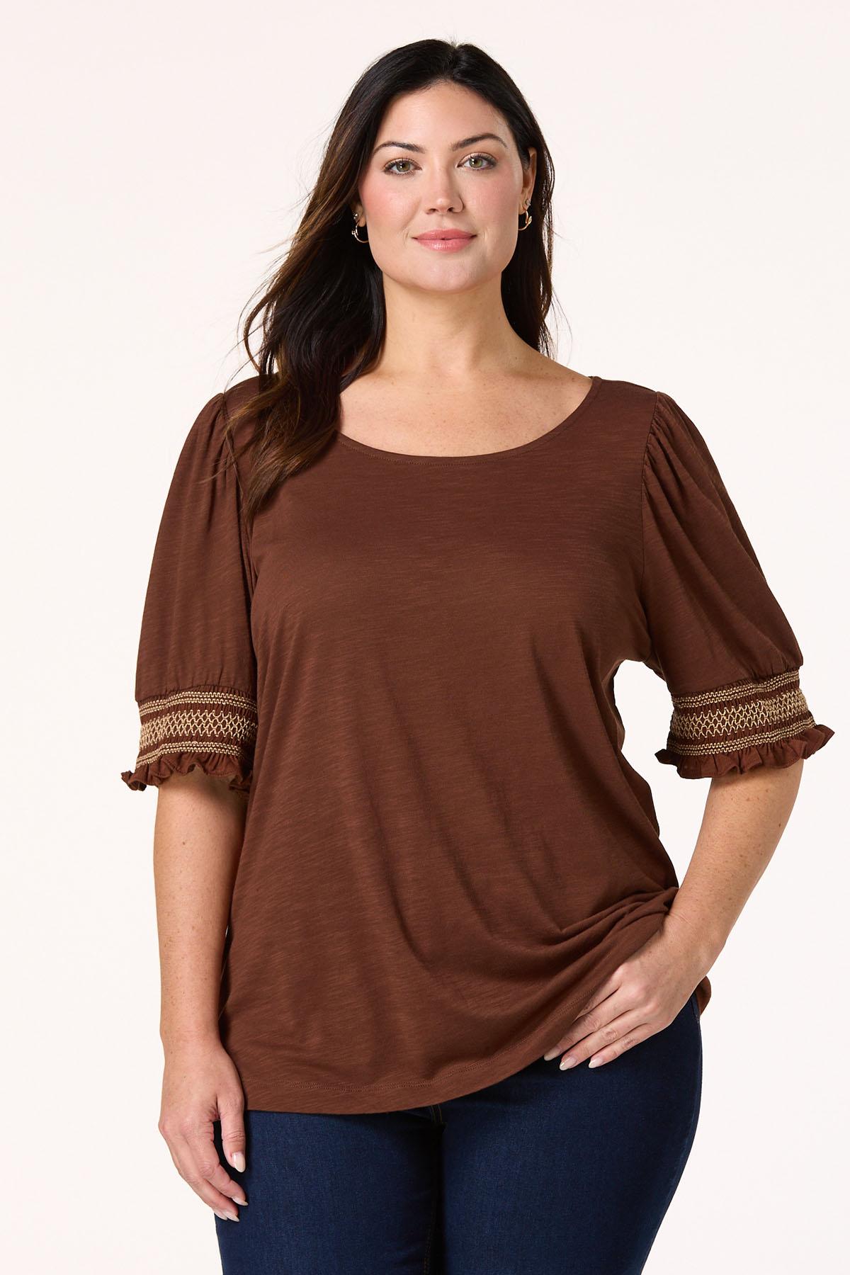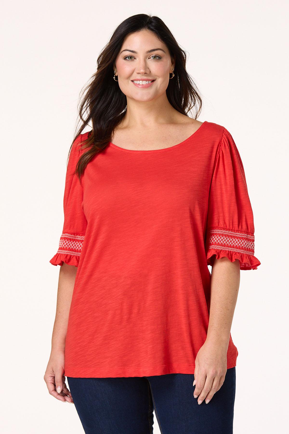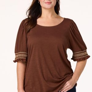 This lightweight-stretchy top is such a breathable casual look with a scoop neckline, short sleeves with smocked-embroidered cuff details and a solid hue for a super light style with delicate detailing.