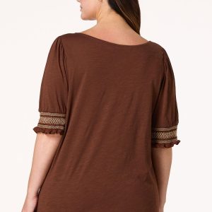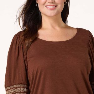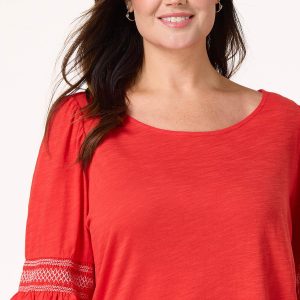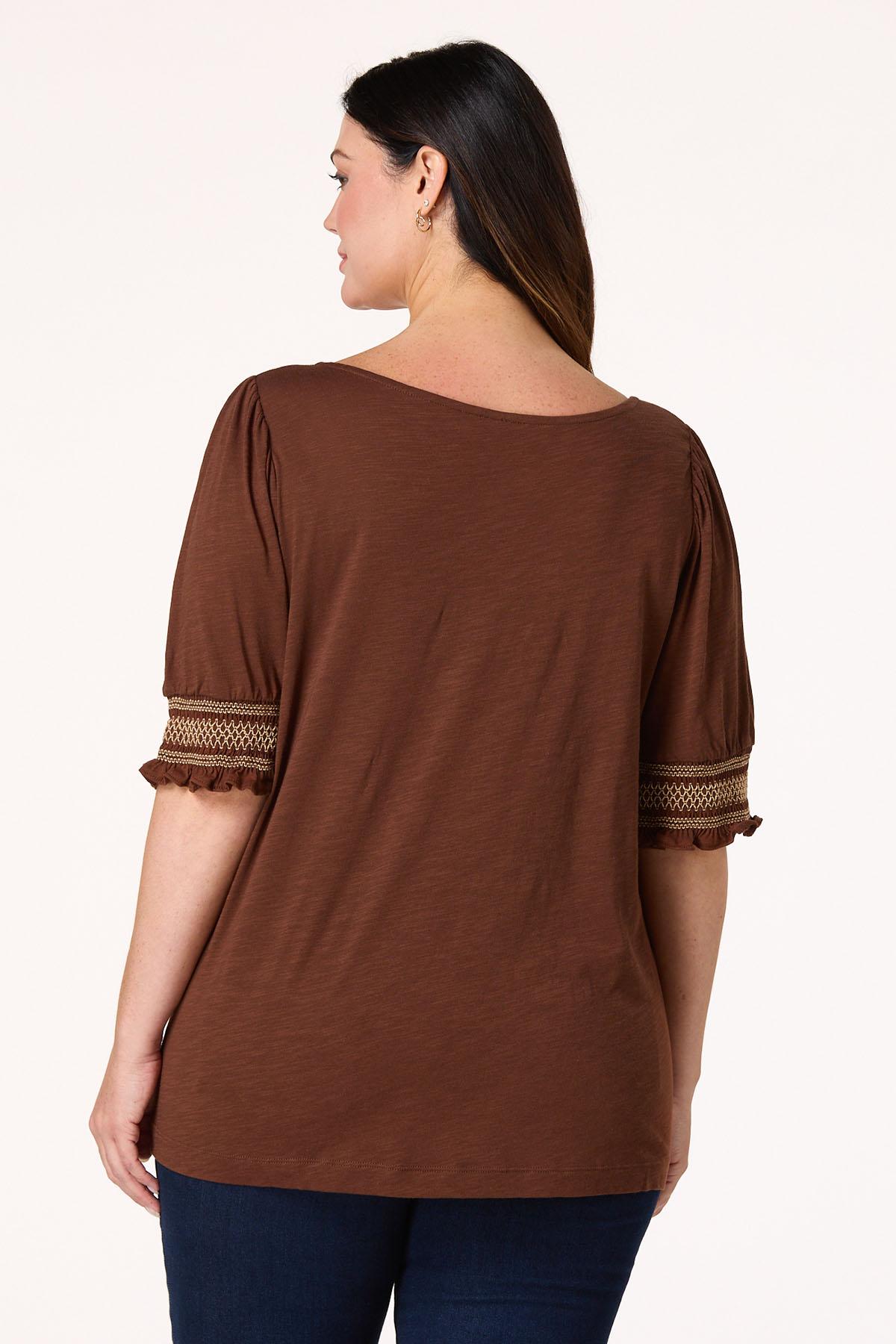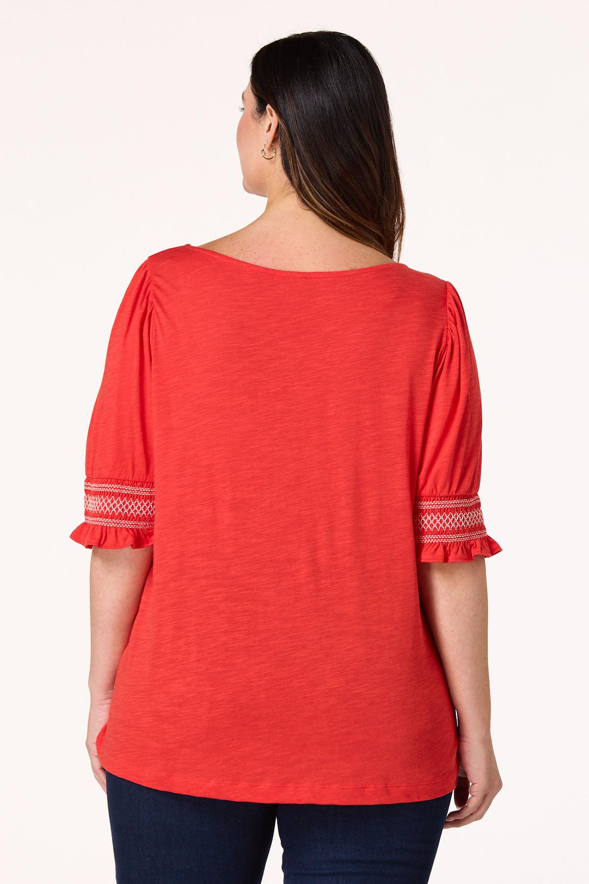 This lightweight-stretchy top is such a breathable casual look with a scoop neckline, short sleeves with smocked-embroidered cuff details and a solid hue for a super light style with delicate detailing.