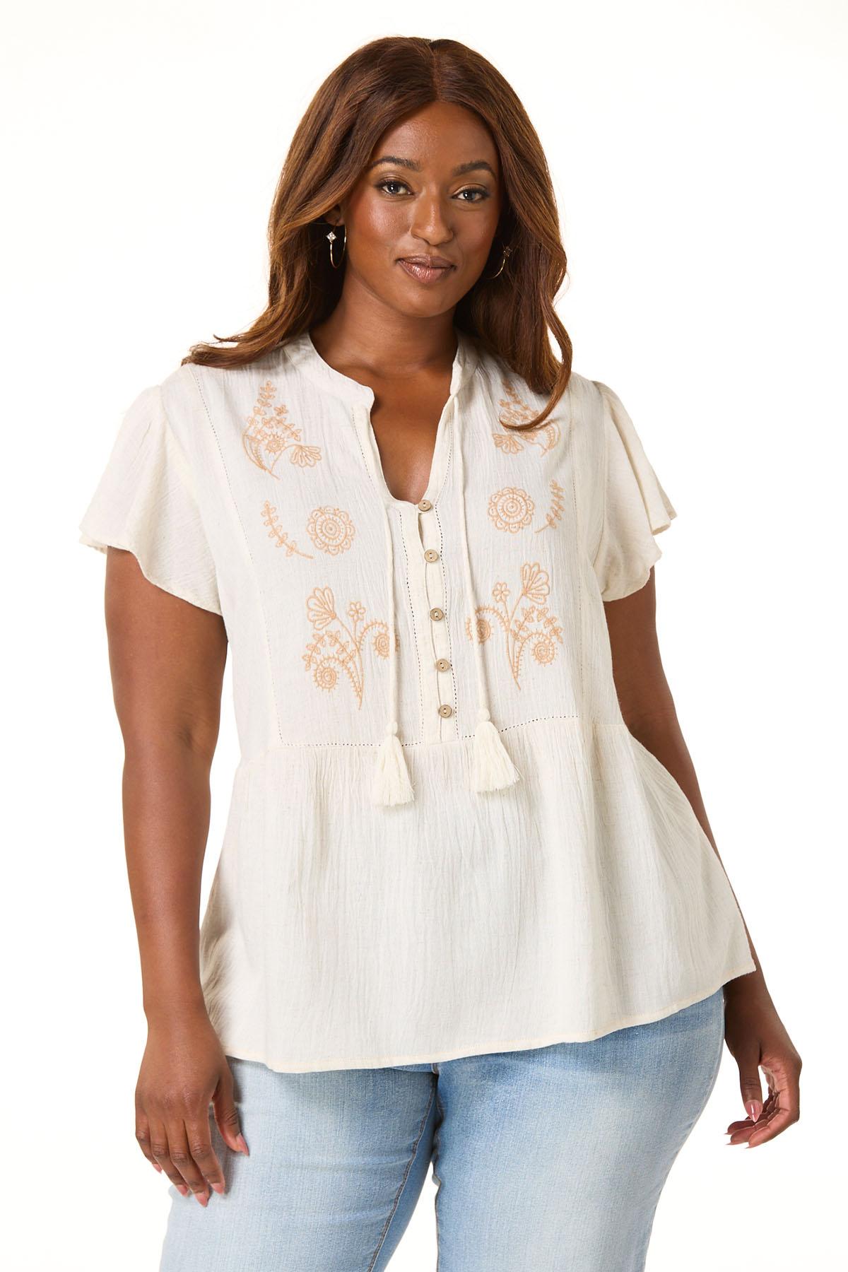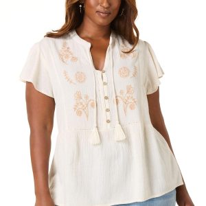 Plus Size Embroidered Tassel Tie Poet Top
