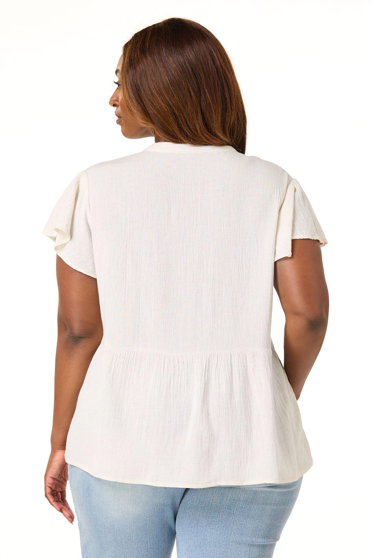 Breezy and romantic, this lightweight linen-blend poet top features delicate embroidery, a tassel-tie neckline, and short ruffle sleeves. The perfect style for warm, carefree days.