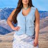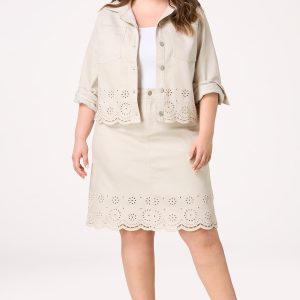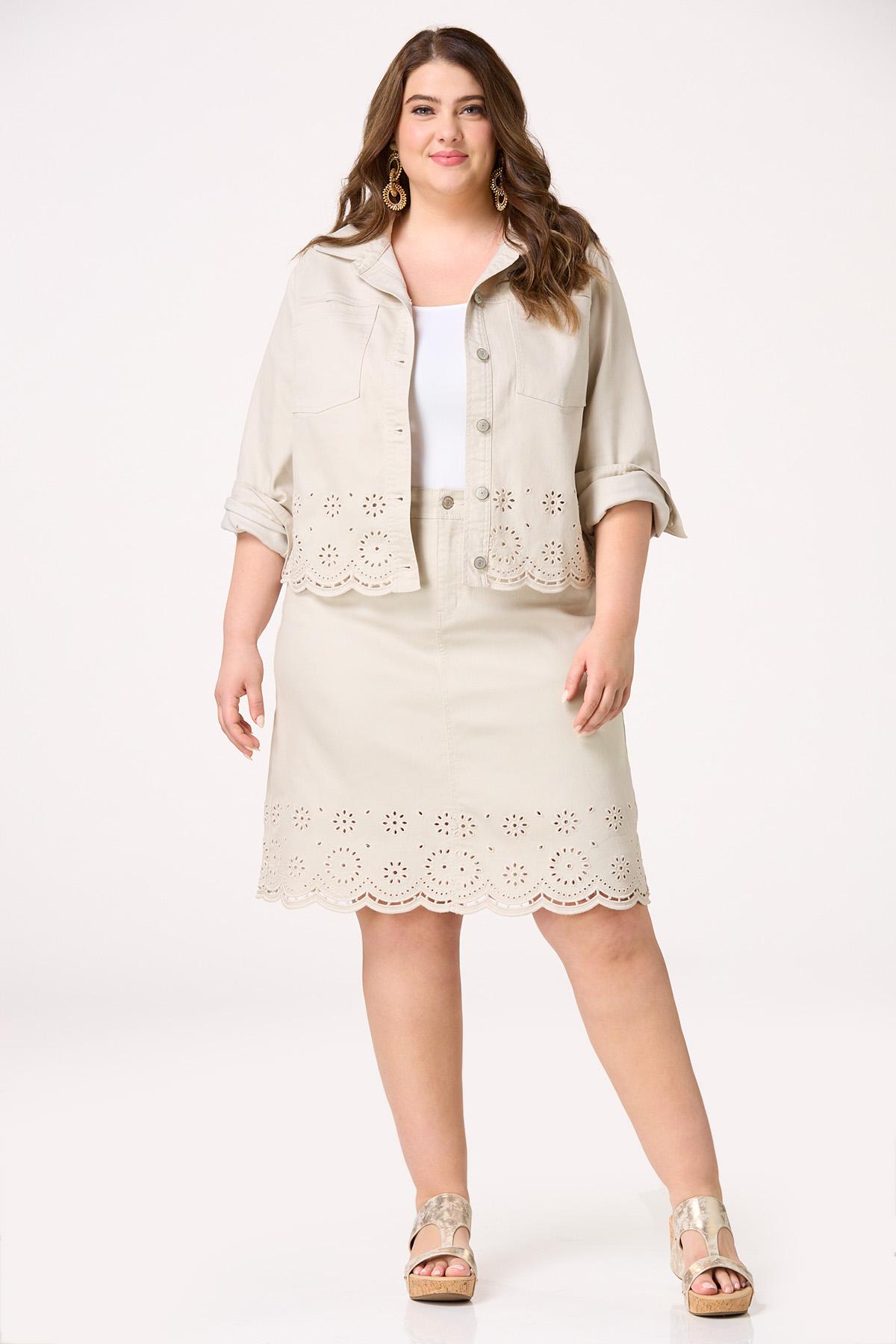 How adorable you’ll look when you show up wearing this beyond-blue denim style. The other half to our matching denim jacket, ths skirt features a button closure, tan hue, stretchy fit and scalloped-eyelet hem.
