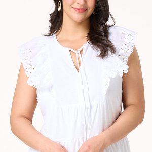 It’s happy “tiers” for sure when you choose this sweet style to add to your cart. A tasseled-tie neckline, eyelet-flutter sleeves, tiered silhouette and so-soft knit brings a comfortable and cute finish for both casual and dressier days.