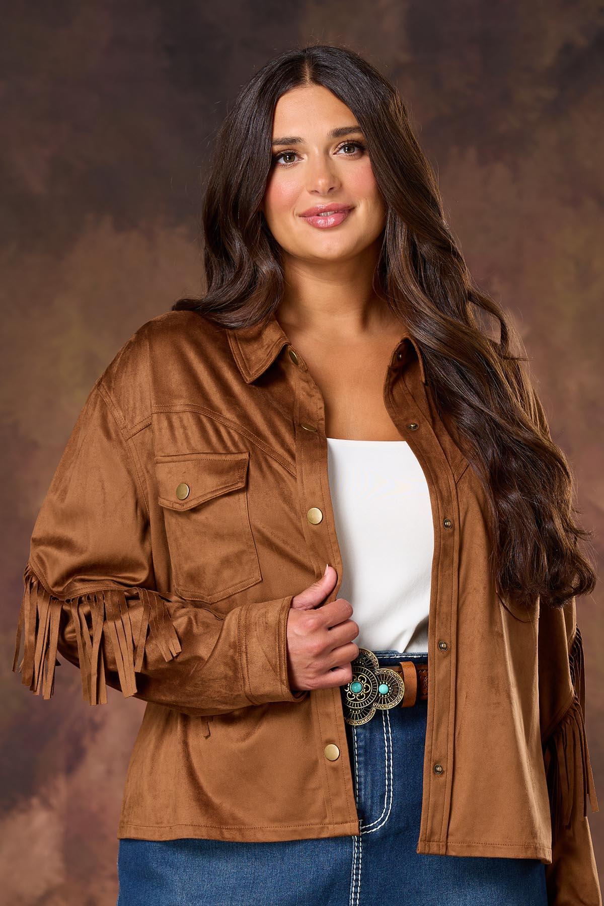 You’ll be the one they remember when you show up wearing this faux suede style, featuring a snap down closure, front pocket detail, a buttery-soft knit and fringe trim for rodeo-ready vibes and a statement finish.