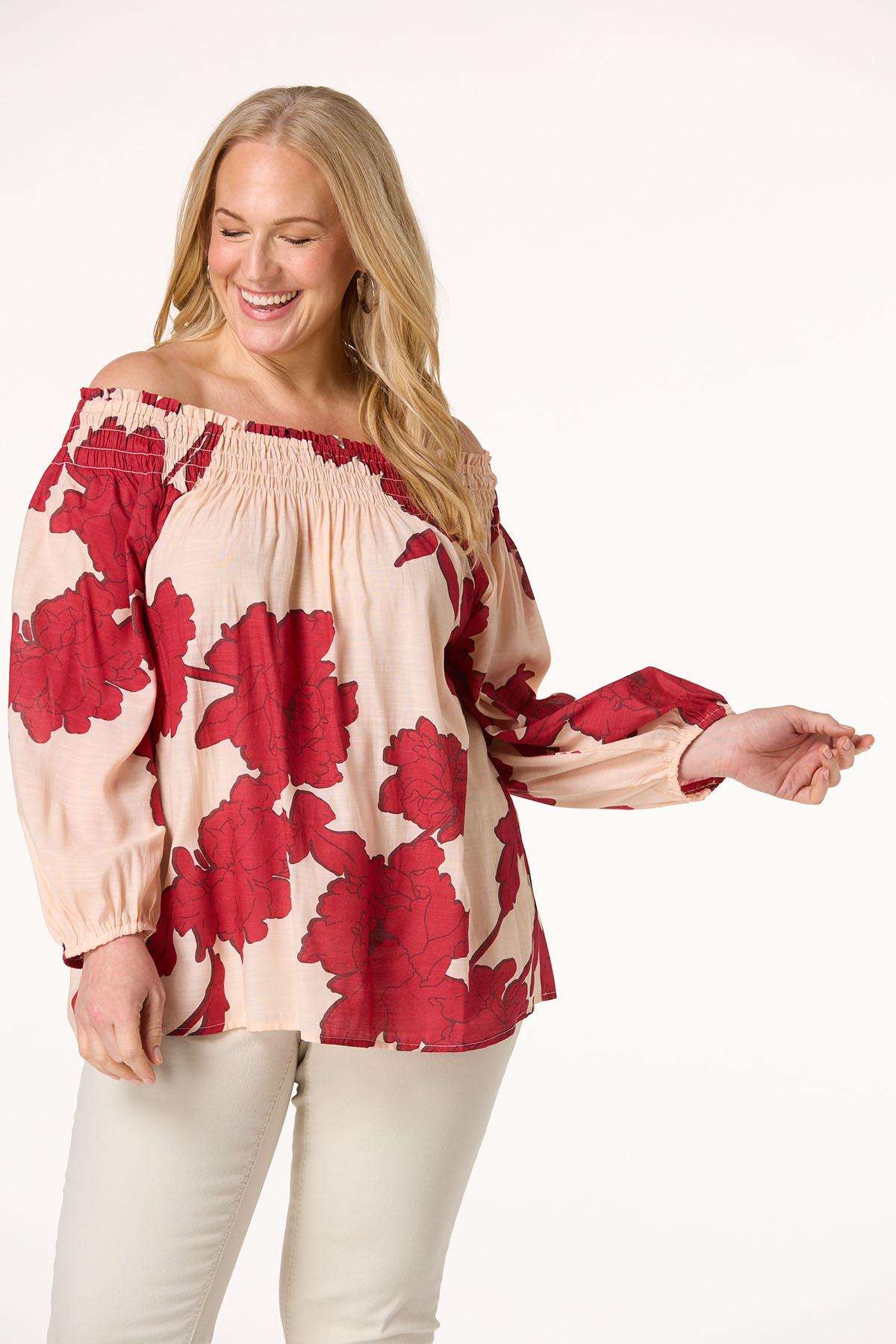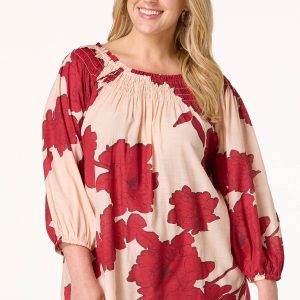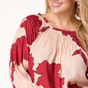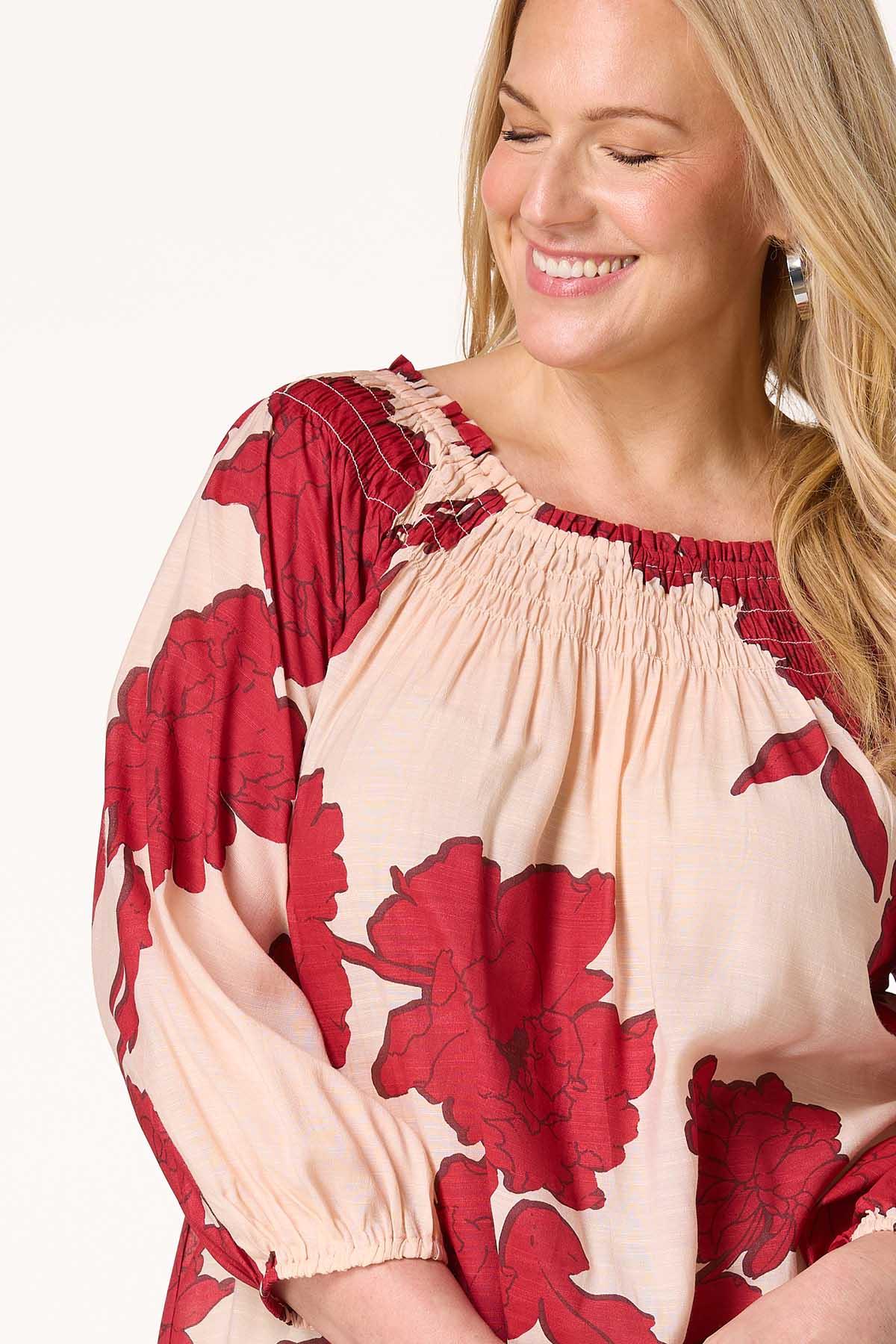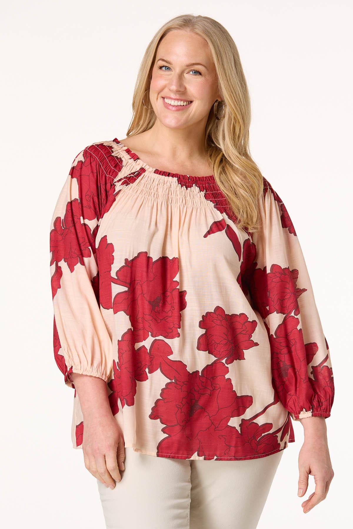 Romance is in the “wear” with this smocked, pullover style, featuring a bold-red floral print, lightweight feel and a breezy fit for a boho vibe that’s simply breathtaking.