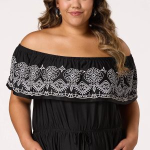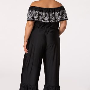 This dressy style is so cute, comfortable and stylish with a contrasting-color combo. Lightweight-stretchy knit fabric features a black hue with an off-the-shoulder neckline, a flounced neck trim with a white-geo embroidered print, a cinched waist with a drawstring-tie waist, side pockets and a wide-leg fit with flounced-embroidered hem details.