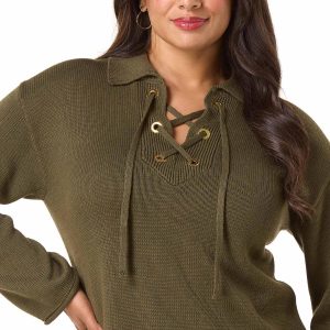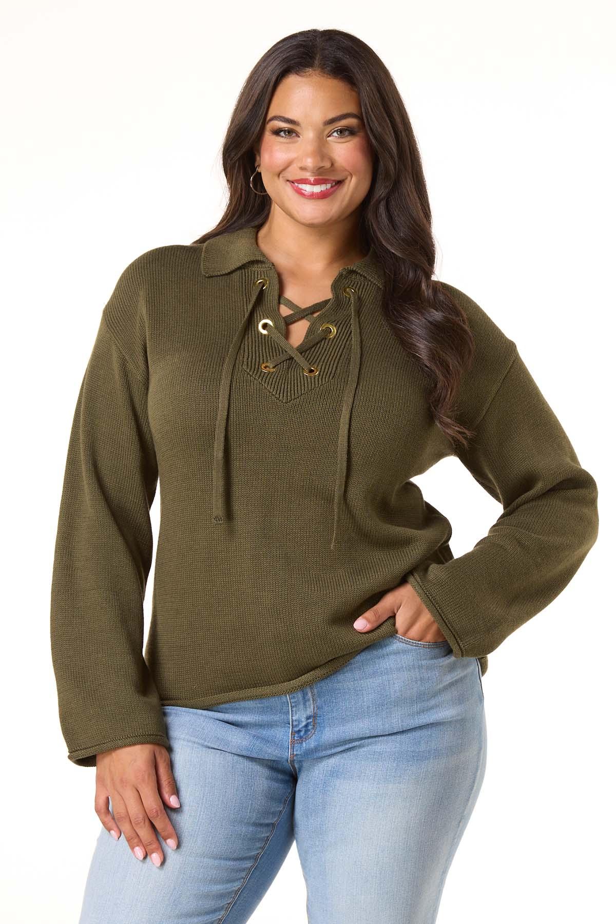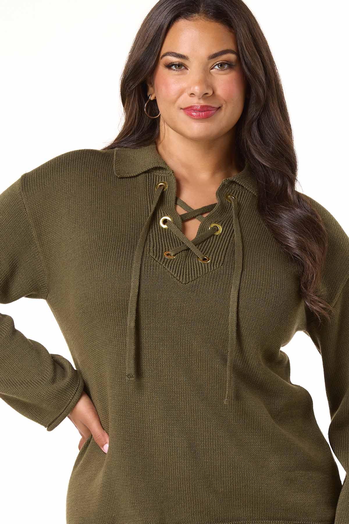 Warm up to the cooler weather with this casual, pullover style, featuring an olive hue, gold-grommet detail, a lace up design and relaxed fit for a look that screams denim days and boot season.