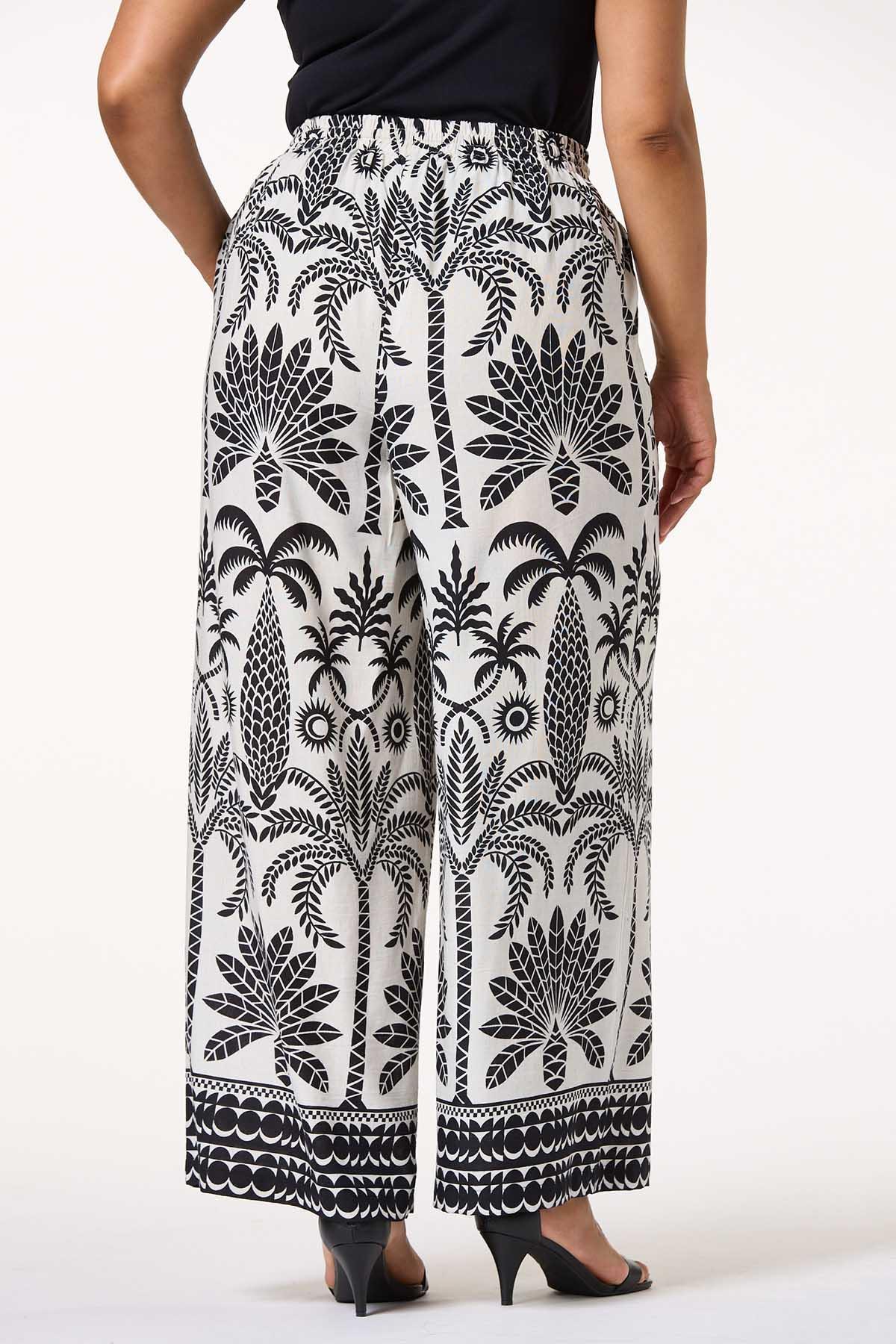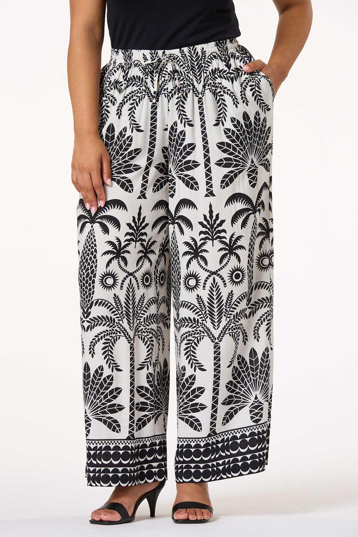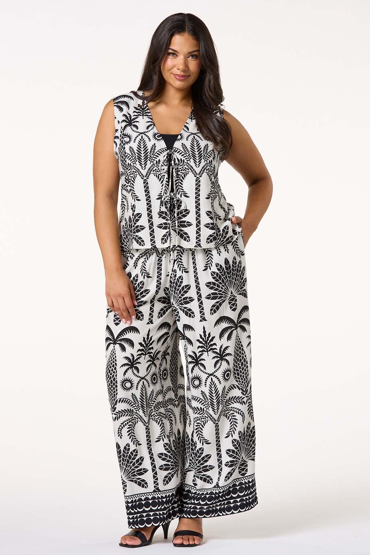 The other half to our matching top, these pants are sure to be a favorite this season. Starting with a comfortable, drawstring waist and continuing with a wide leg silhouette, tropical print and contrasting shades, these breezy pants are the bestie to our matching tie front top.