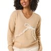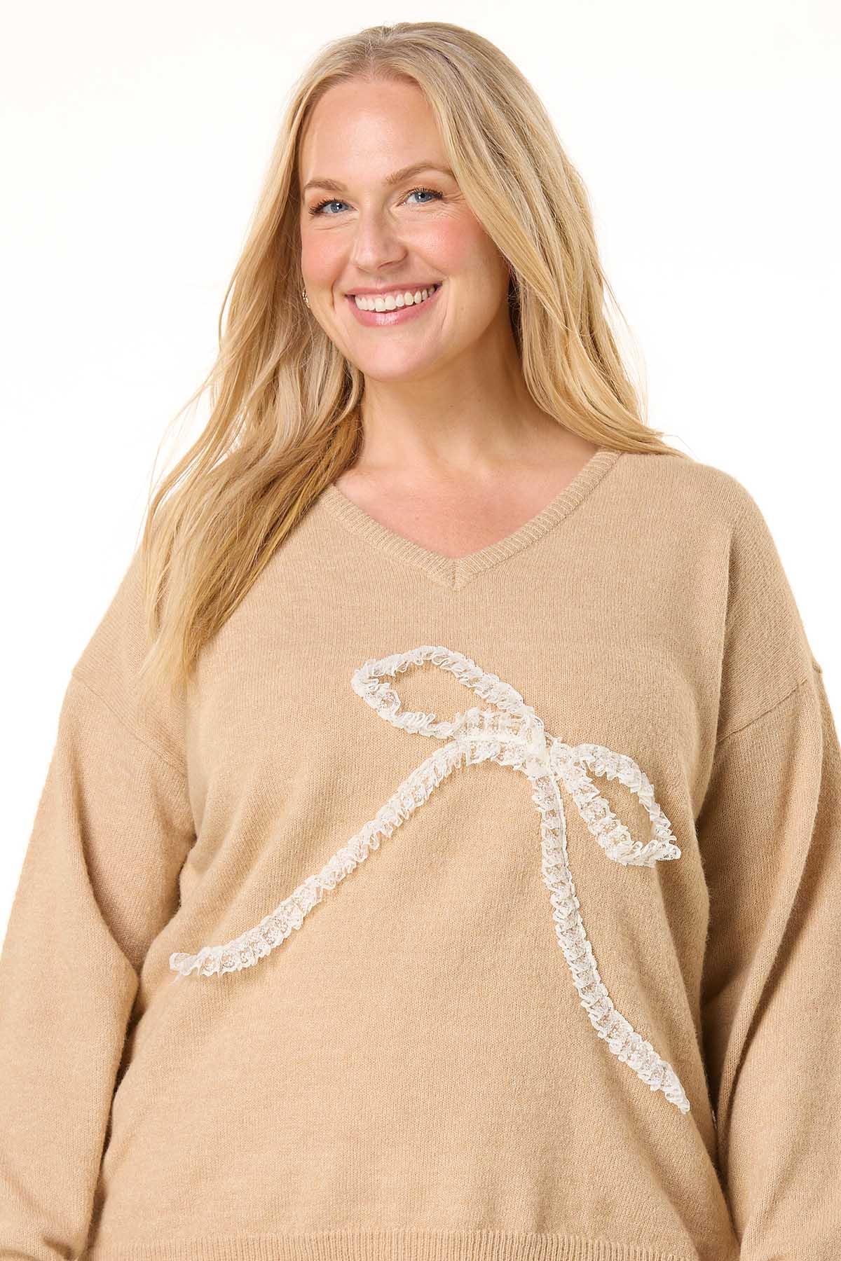 Charming and cozy – lucky for you, it’s true with this pullover style, featuring a v-neckline, beige hue, relaxed fit and sweet bow detail with a lovely-lace design.