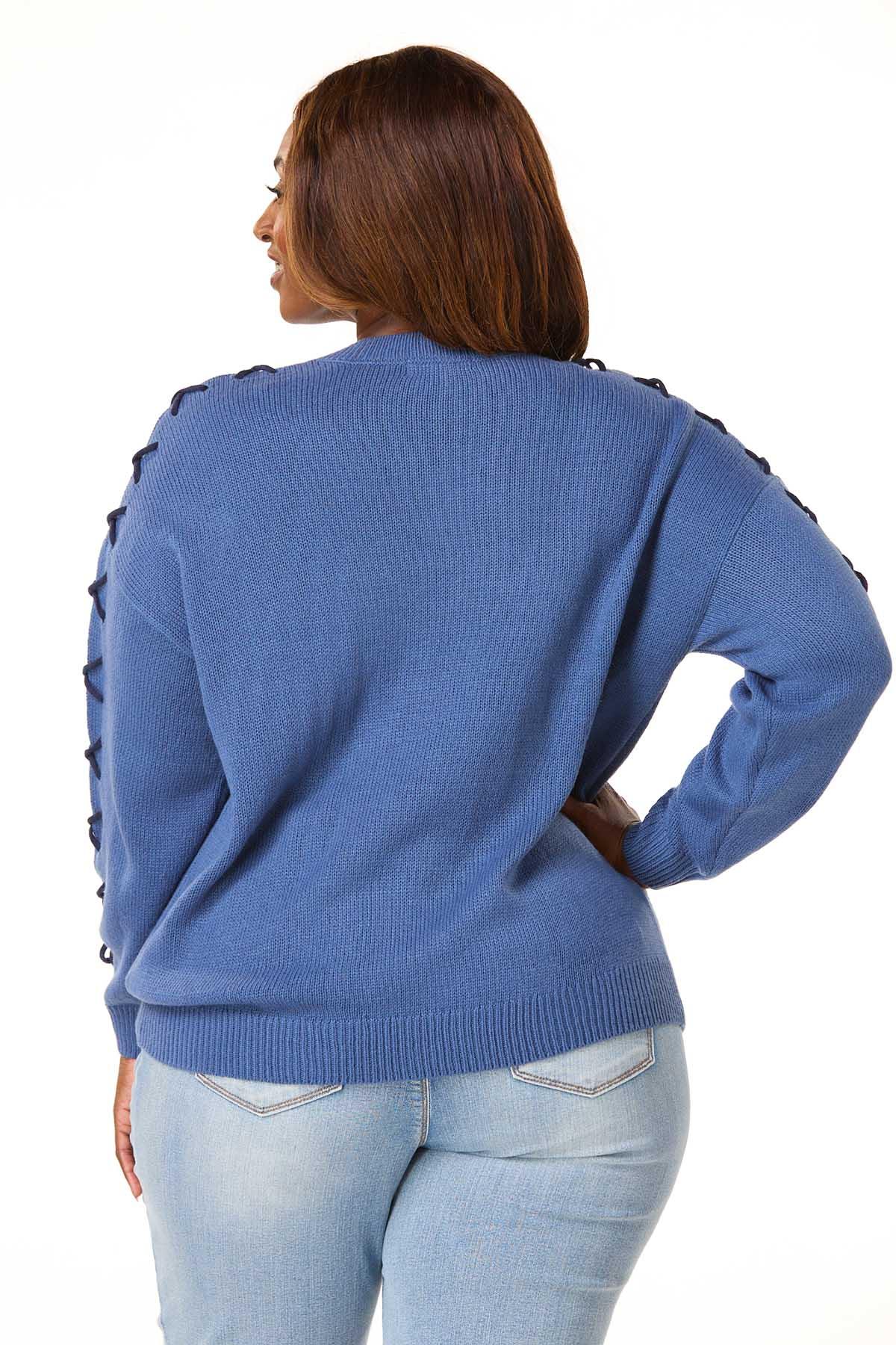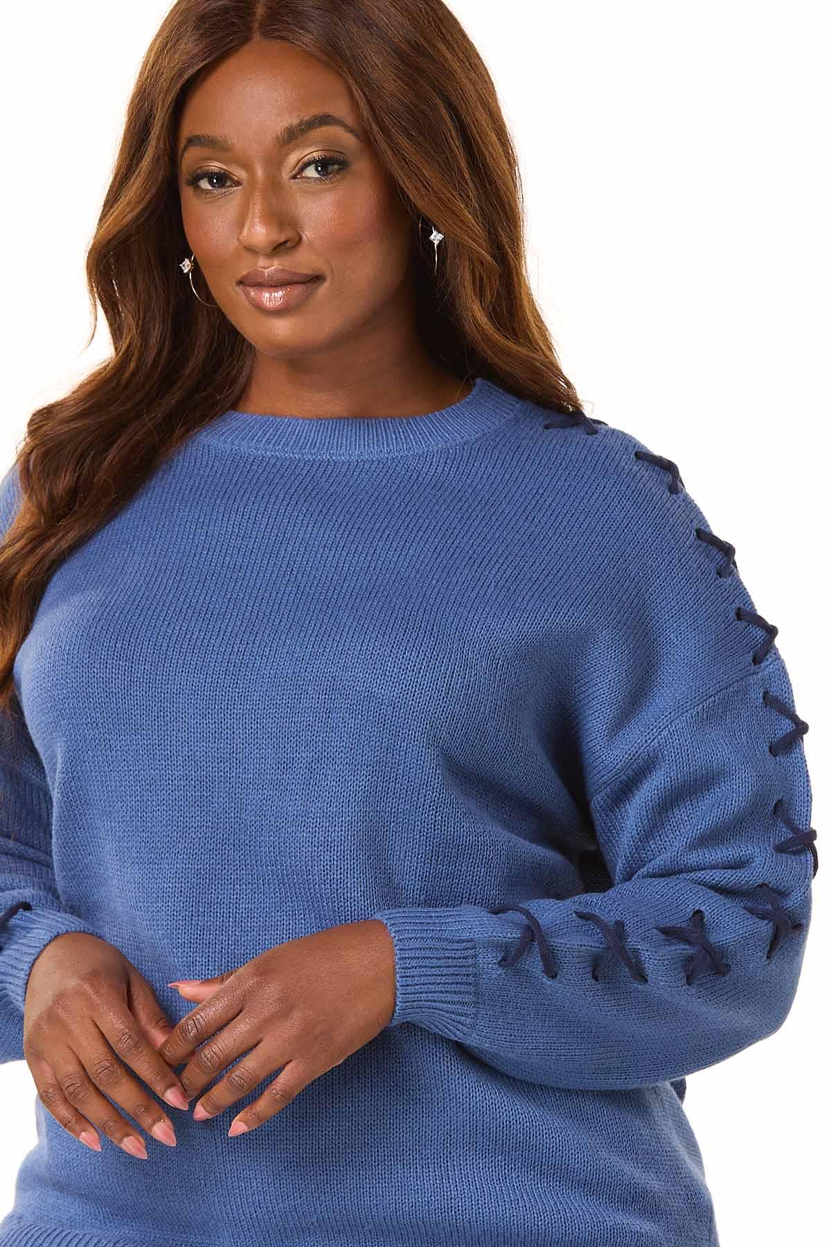 A simple sweater with some fun detail. Lightweight-stretchy knit fabric features a blue hue, a crew neckline and long sleeves with a dark blue lace-up trim.