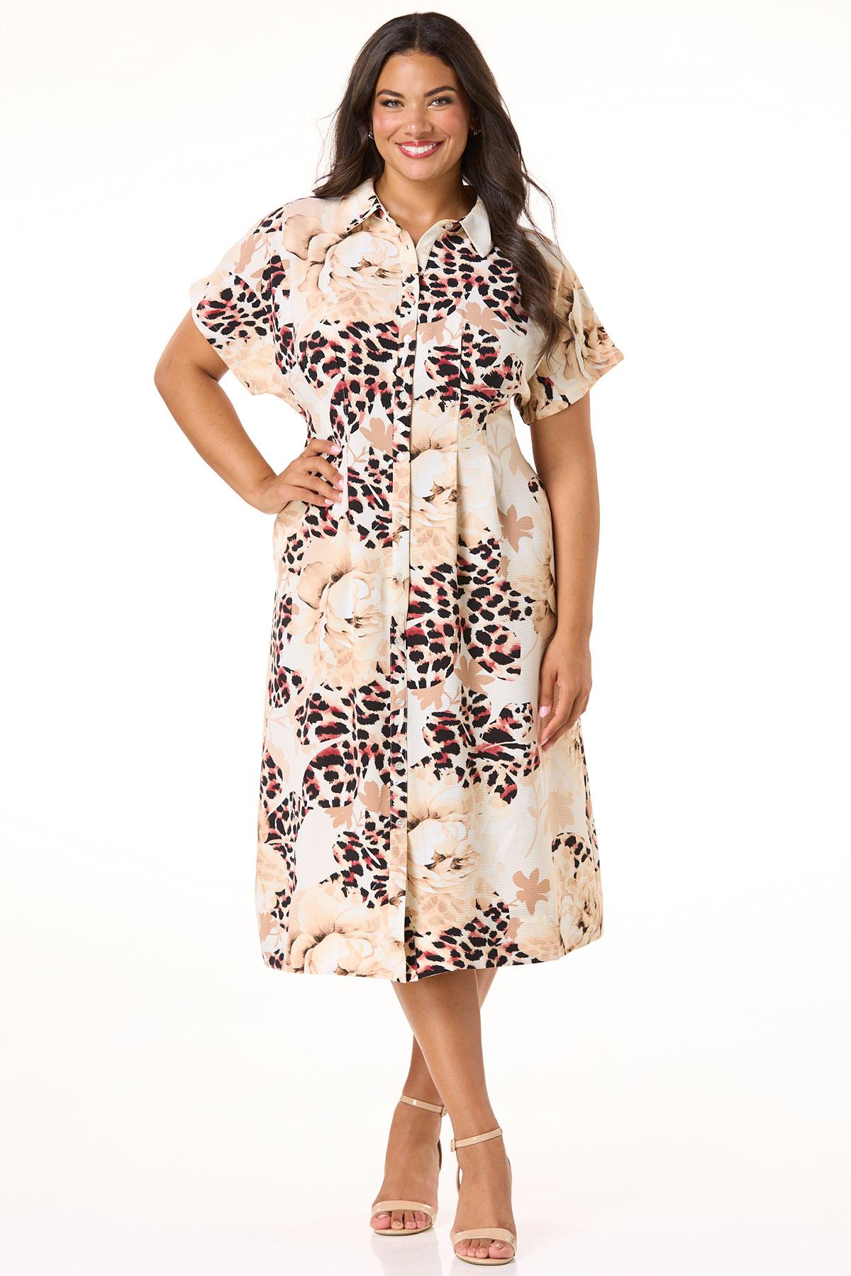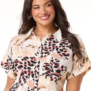 Be the one they remember when you show up wearing this wrinkle-free style, featuring a partial button down front, collared neckline and floral-leopard print in noteworthy-neutral hues.