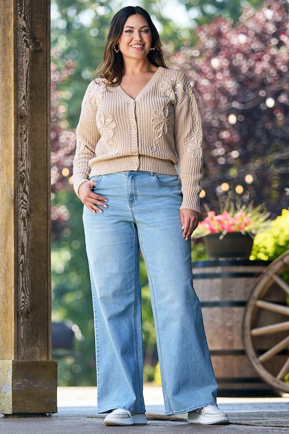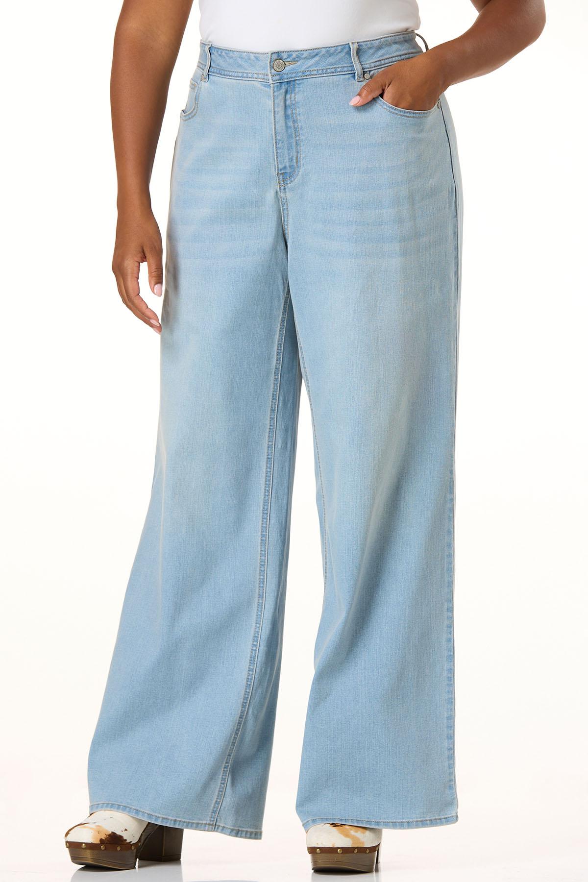 Step out feeling comfortable and confident wearing this stretchy, high rise style. A faded-denim blue top off a flattering, wide leg silhouette for a denim look that’s about to become one of your favorite go-to styles.