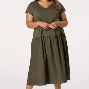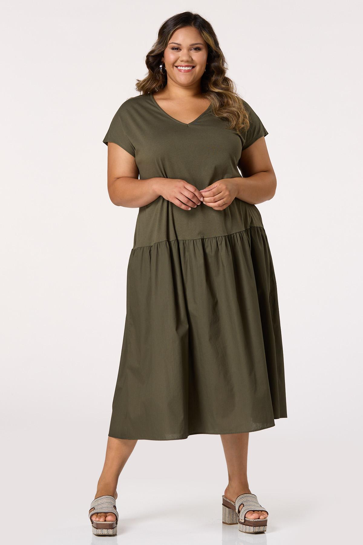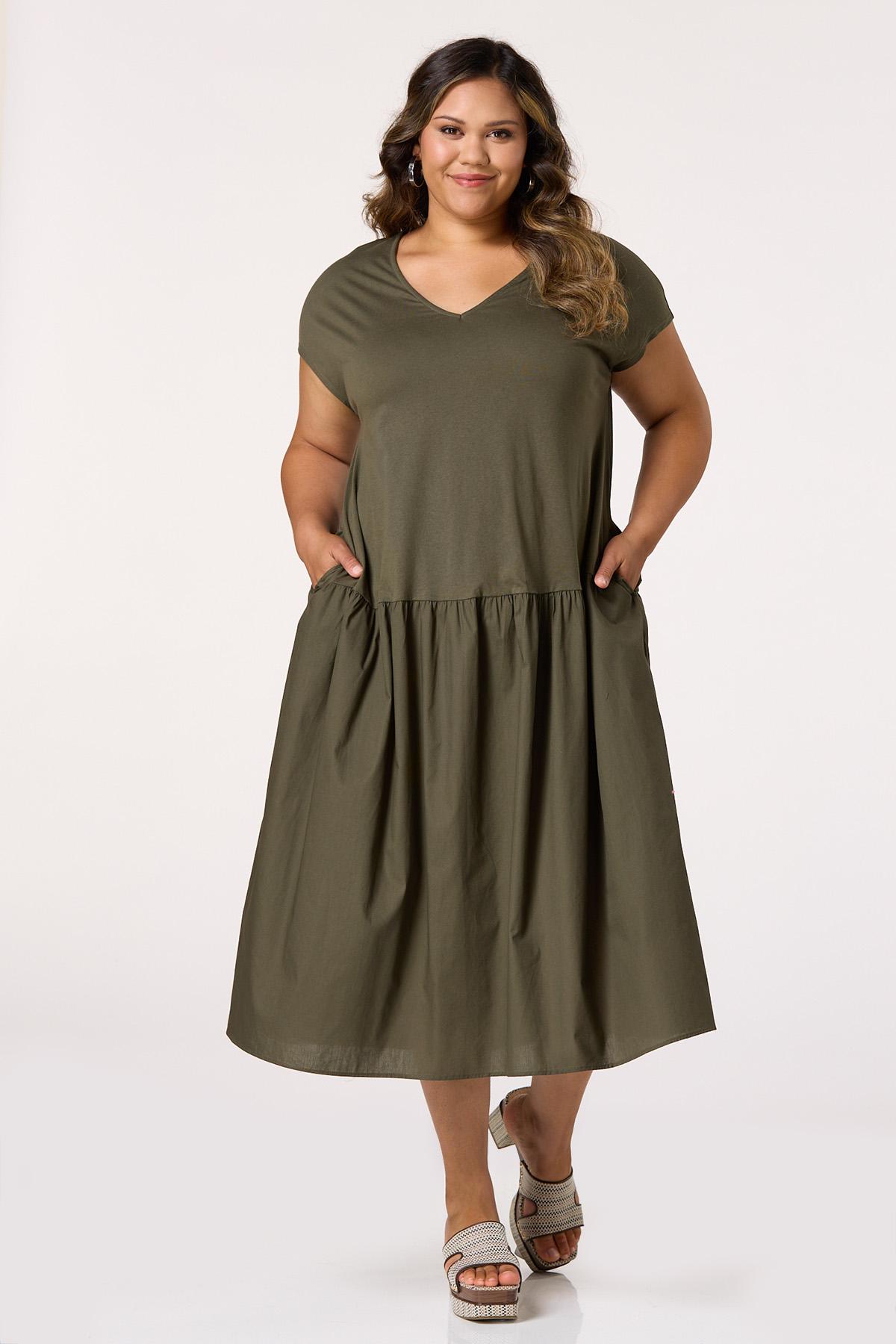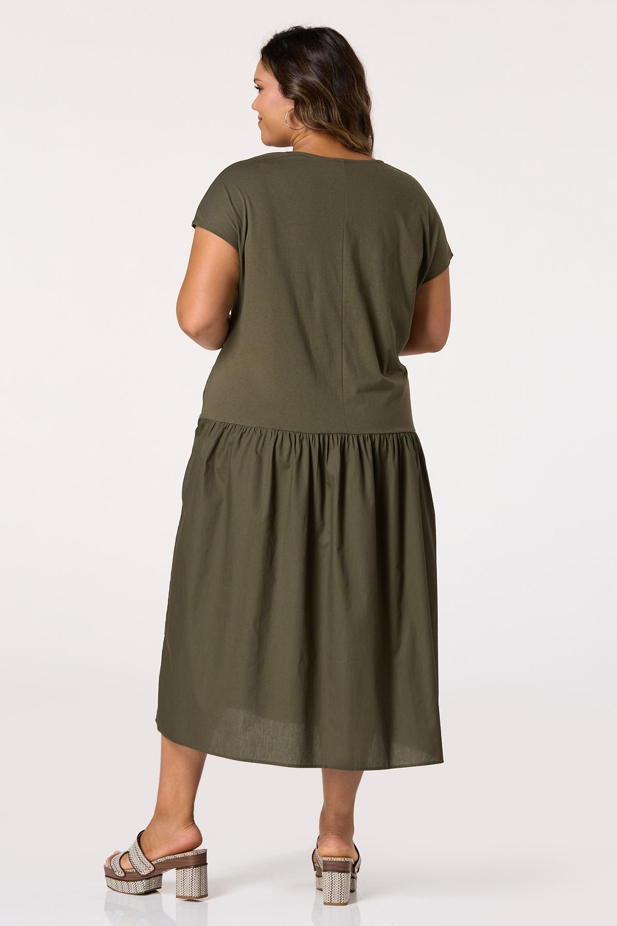 What a chic way to take on the day relaxed and ready for anything. A mixed media design brings a two-in-one look to this drop waist dress, featuring functional side pockets, an earthy-green hue and comfortable, relaxed fit.