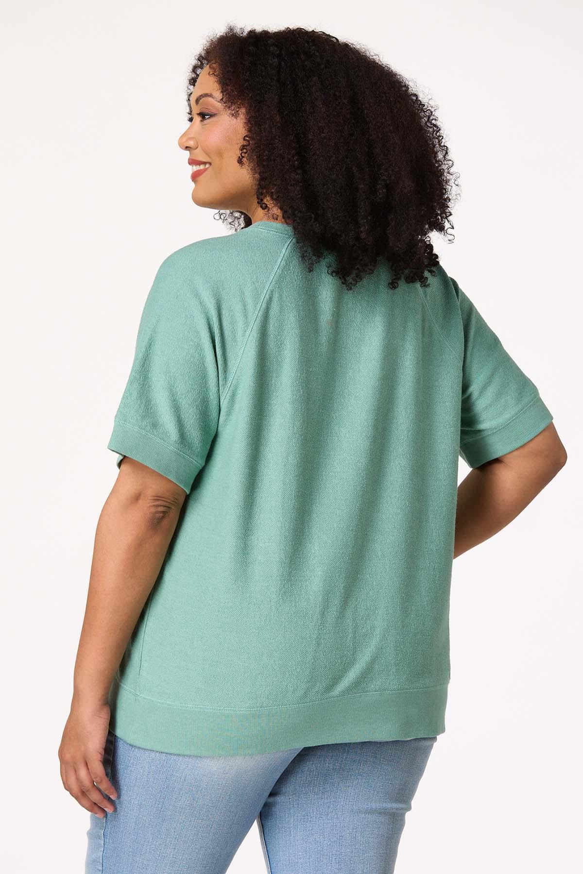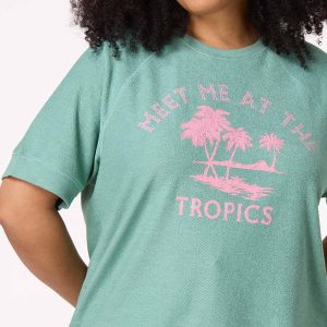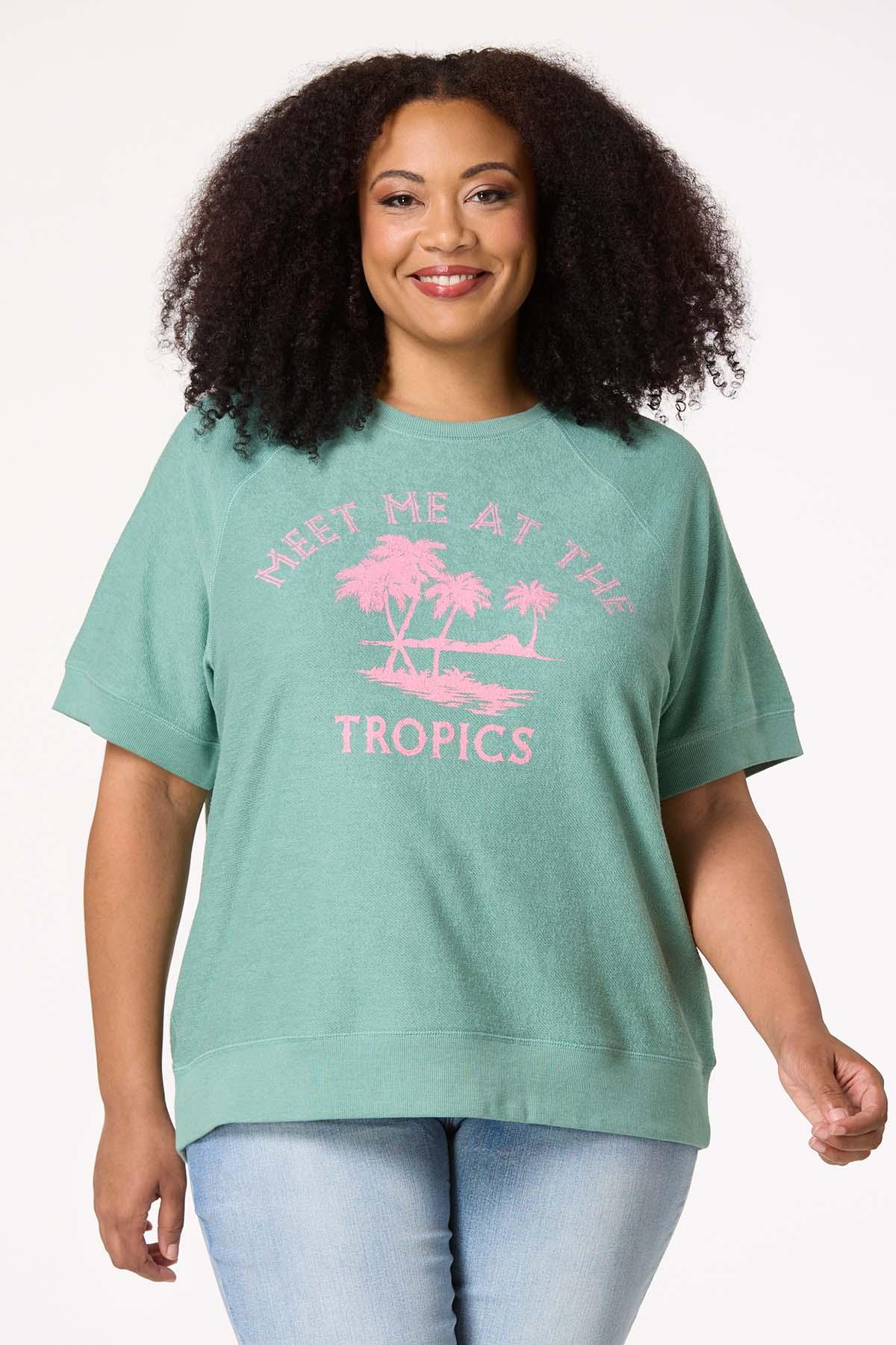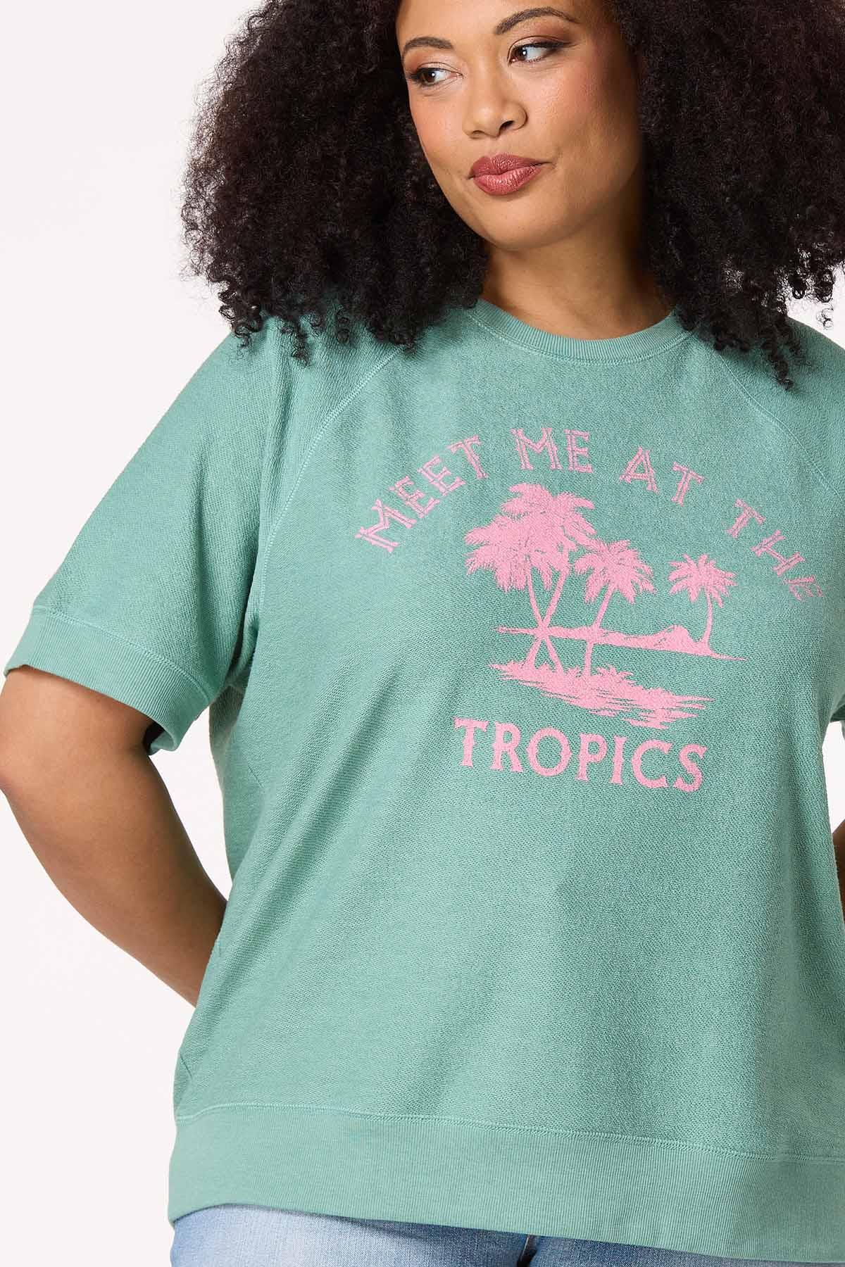 You’re going places this summer…why not let them all know? This casual short-sleeve sweatshirt features a crew neckline, an all-over terry-like texture and a pink palm tree graphic telling all your friends and fam to meet you in paradise.