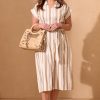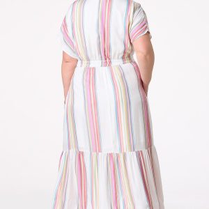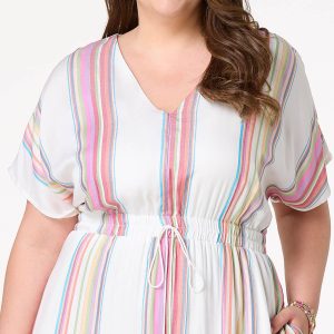 A lovely, light dress that’s sure to keep things cool and cute all day long. Lightweight-soft fabric features a white hue with a multicolor striped print, metallic lurex details, a v-neckline, short sleeves, a smocked waist with a tassel-tie front and a flounced hem.