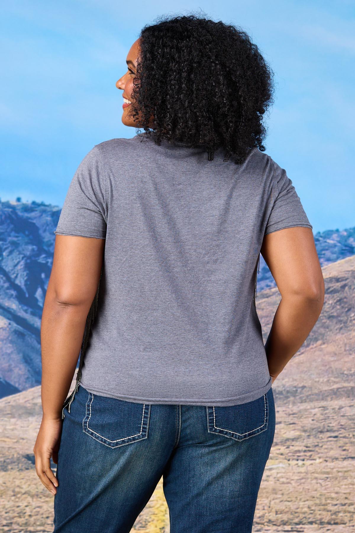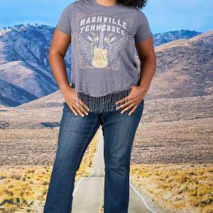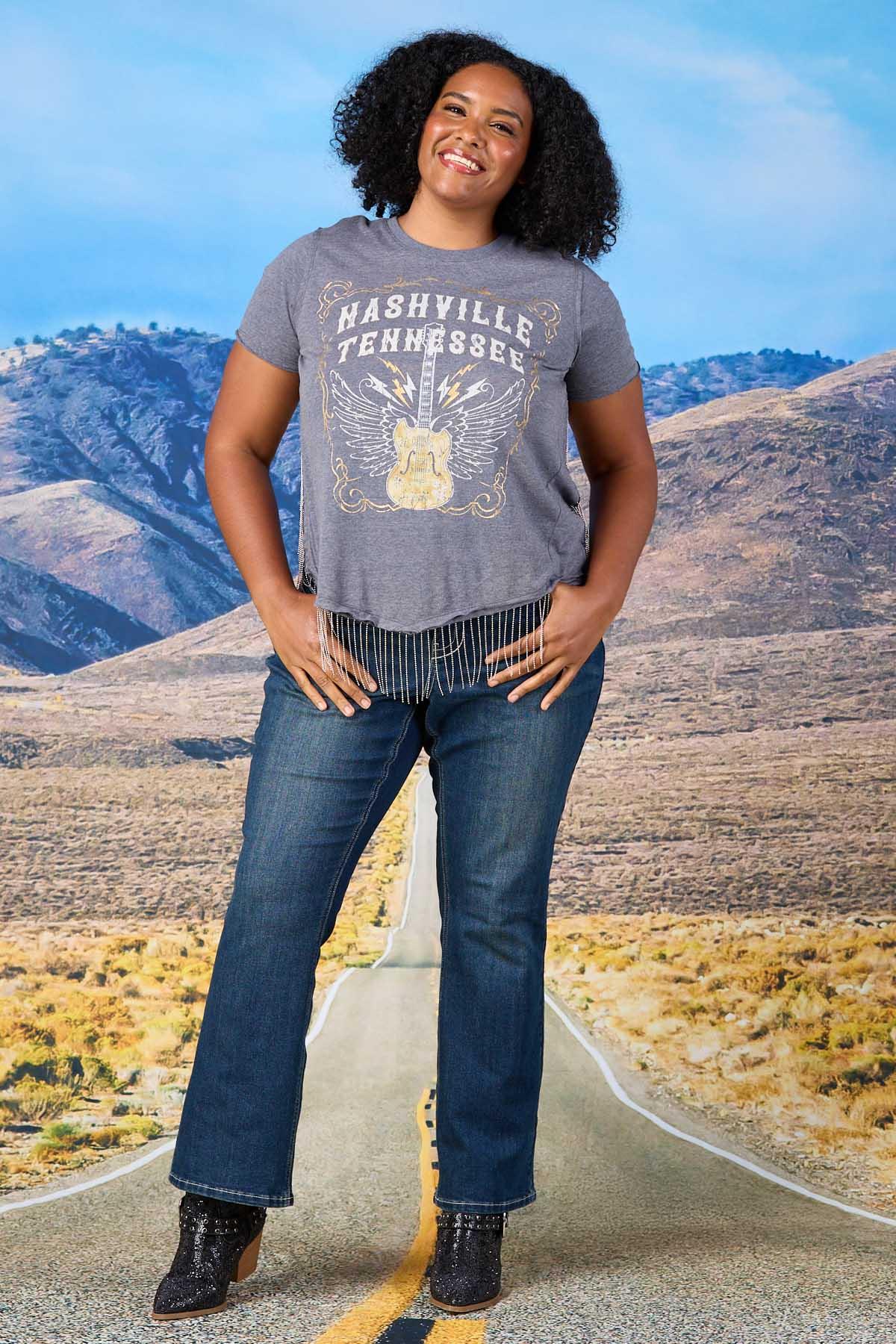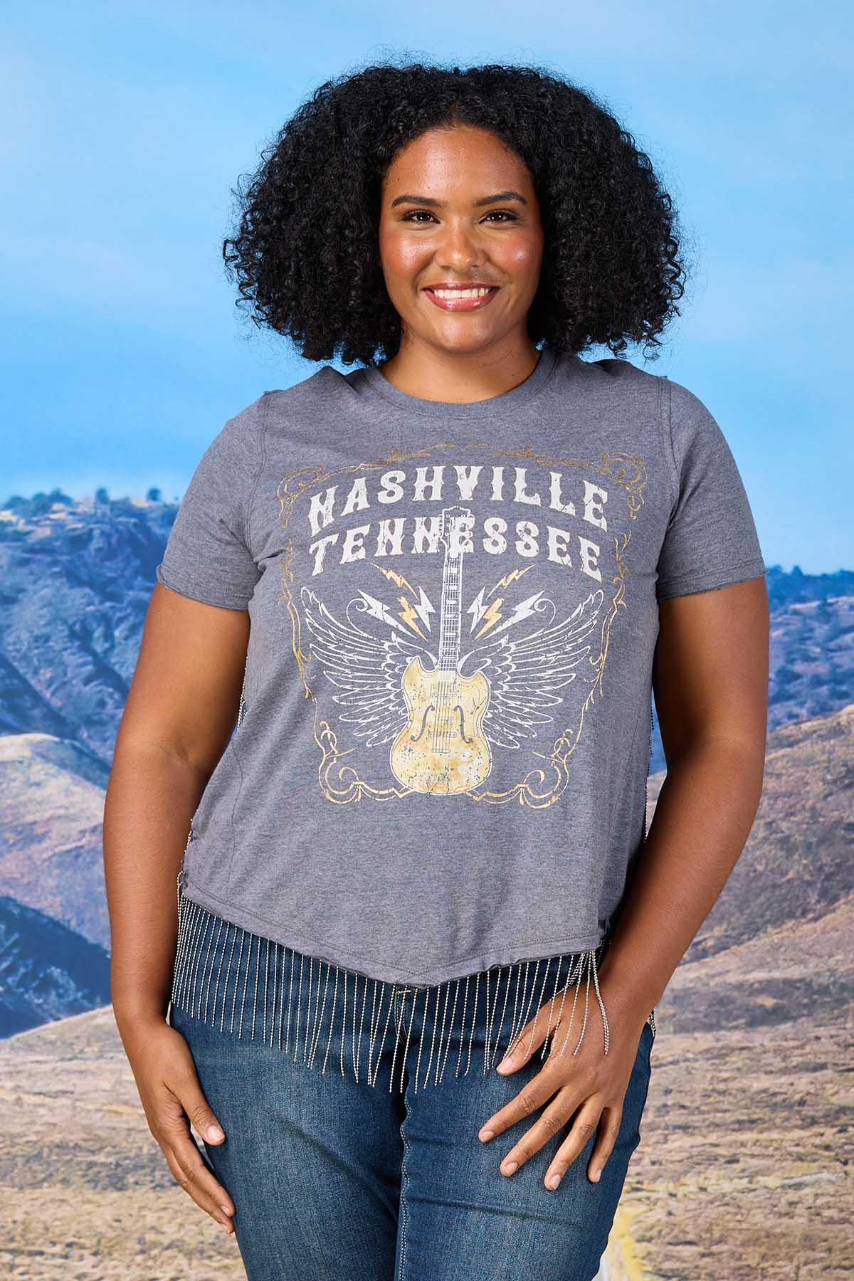 Turn up the volume in this graphic tee featuring a Nashville guitar design and standout metal bead fringe that moves with every beat. Made to shine – especially when you dance.