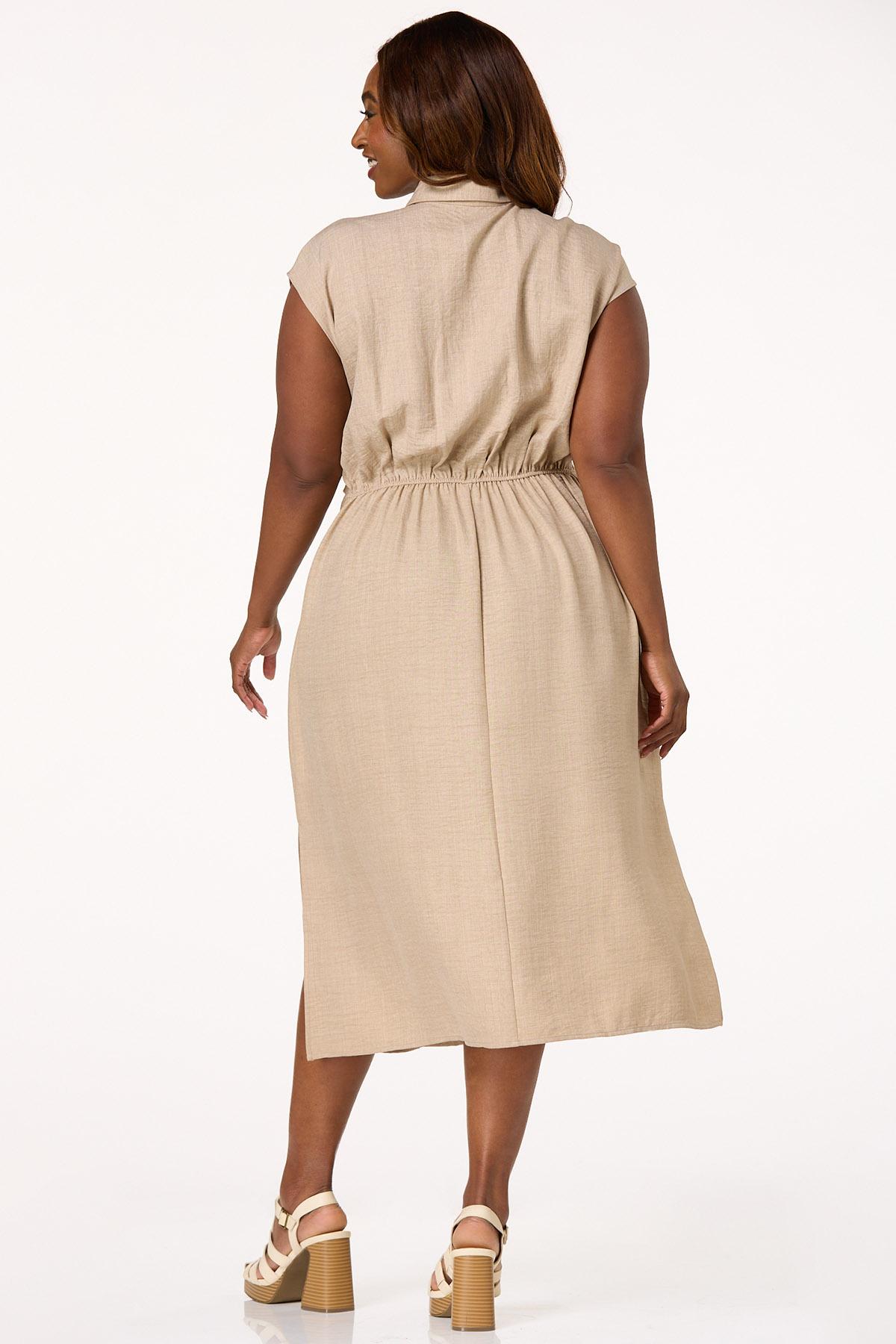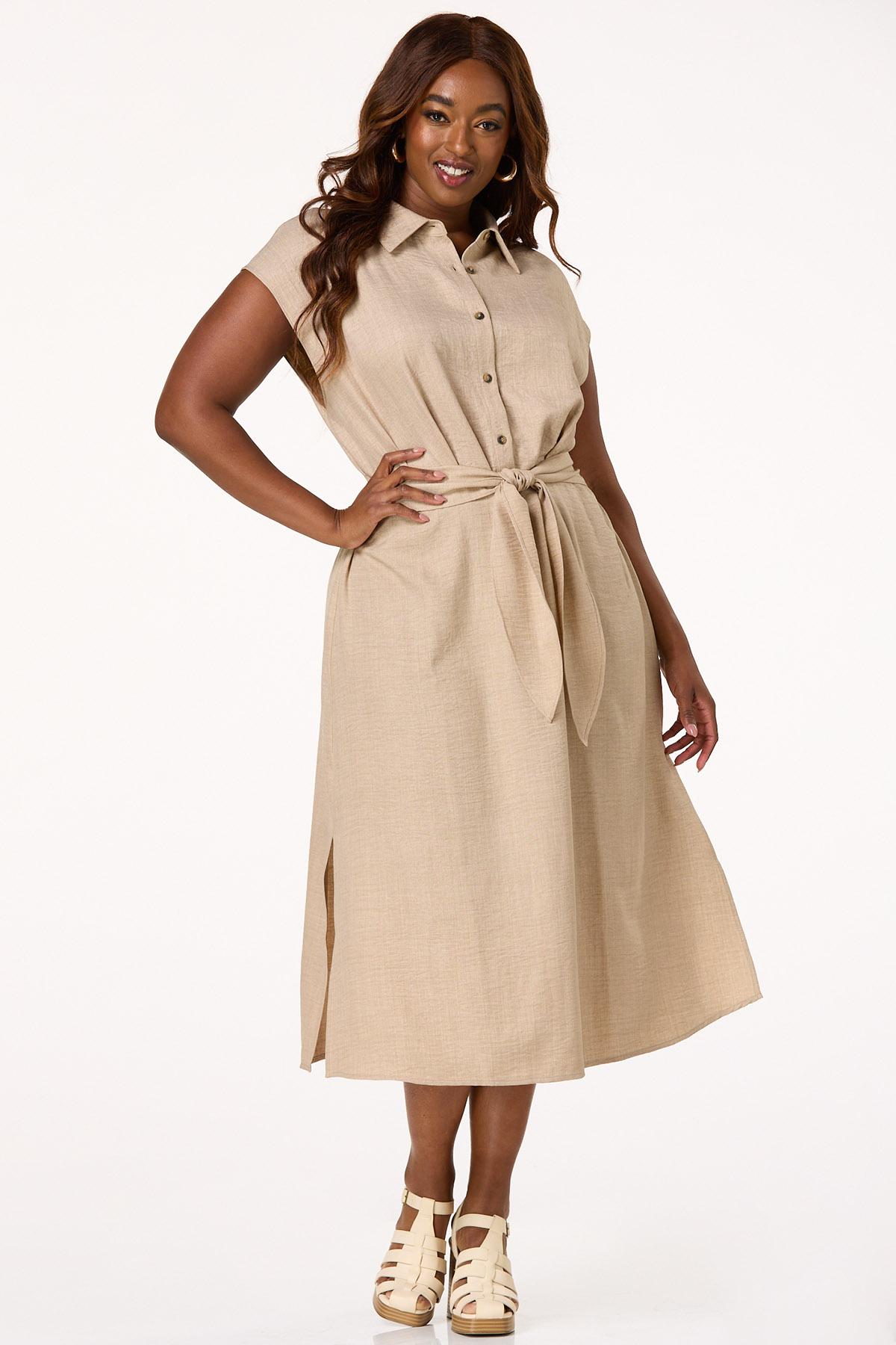 Show up for the sunshine, office, dinner with friends or anywhere else you’re looking to make a good impression with this chic midi. A collared neckline meets a partial-button front, while a tie back, flowy fit and natural hue top it off for a low-key dressy feel you’ll look so confident and timeless in.