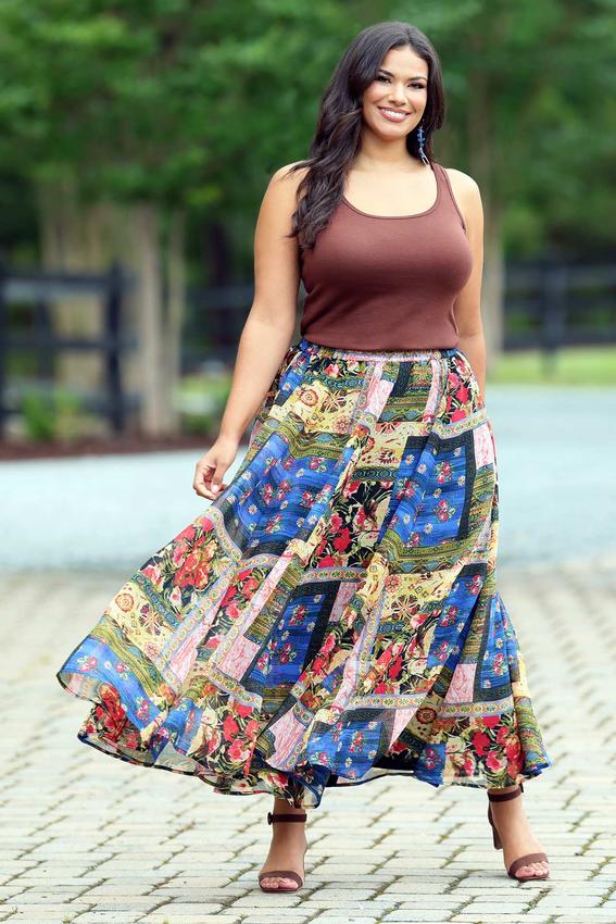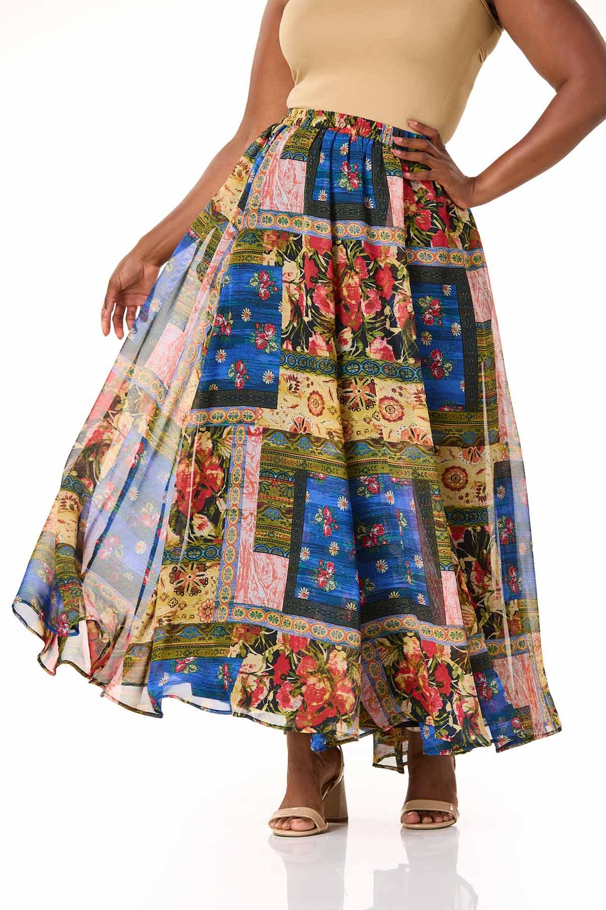 This flowing maxi skirt brings bold color in a patchwork pattern, a stretch waist and side pockets for hidden convenience. Pair it with a simple solid top to let the vibrant pattern take center stage.