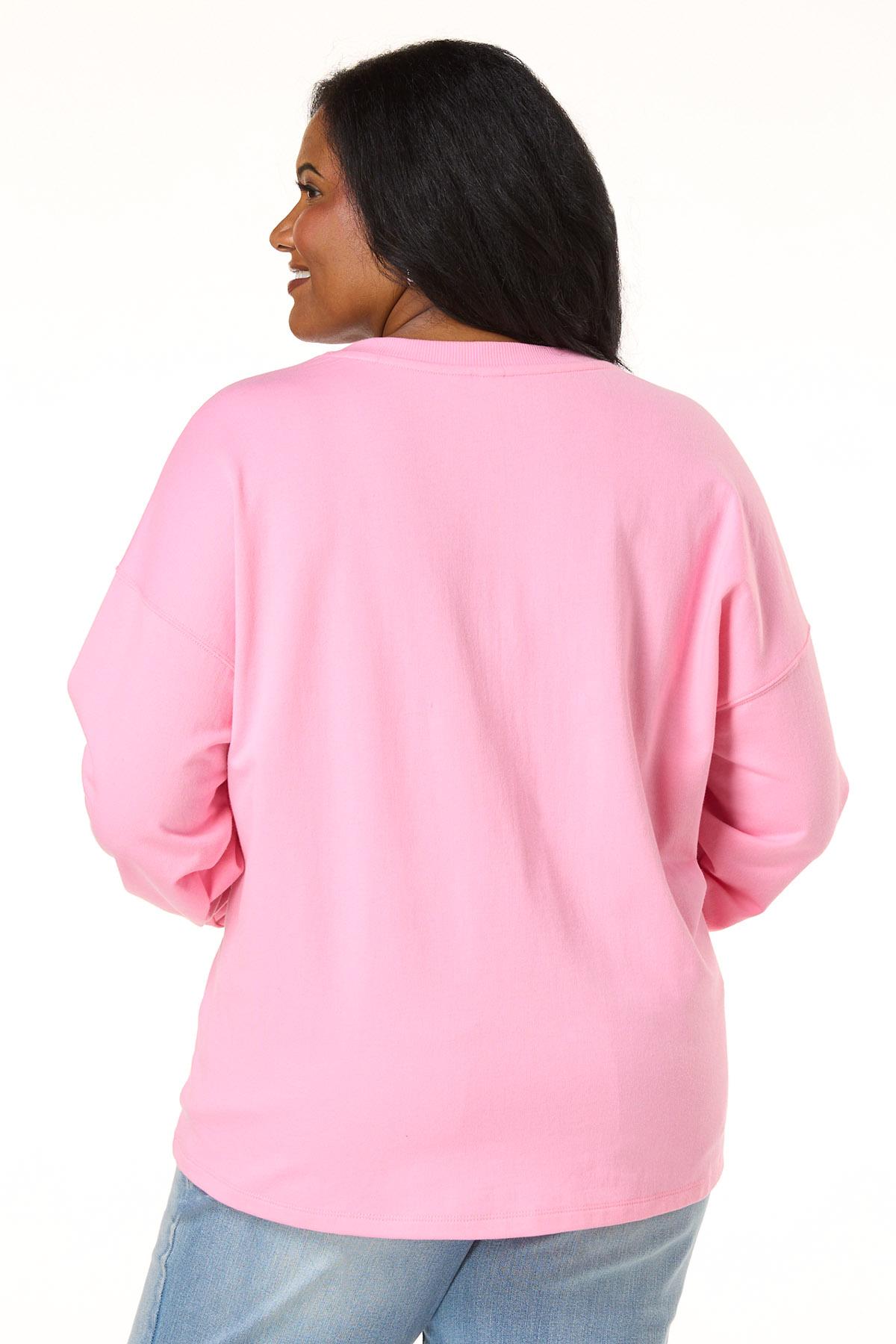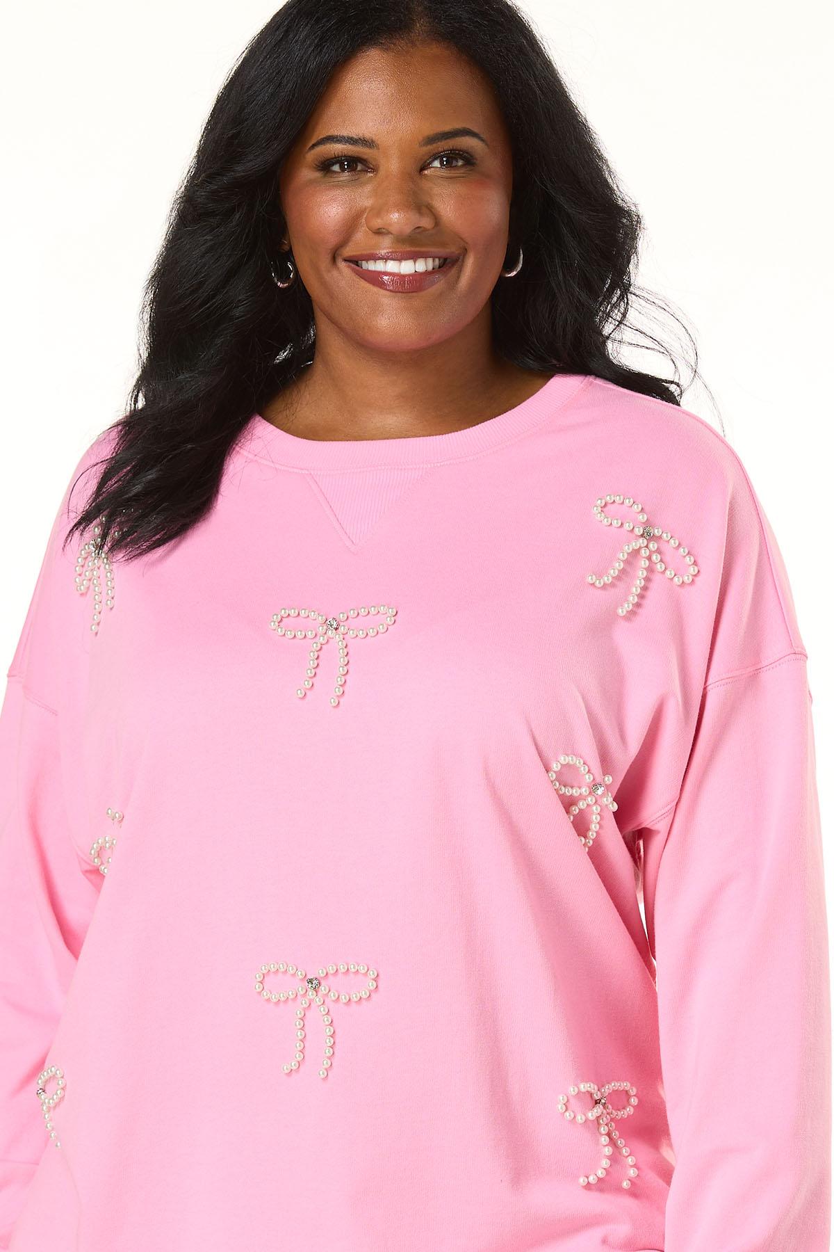 Pretty in pink! This lightweight-knit sweatshirt is adorned with dainty pearl bows with rhinestone studs, bringing just the right touch of shine to your casual style.