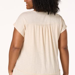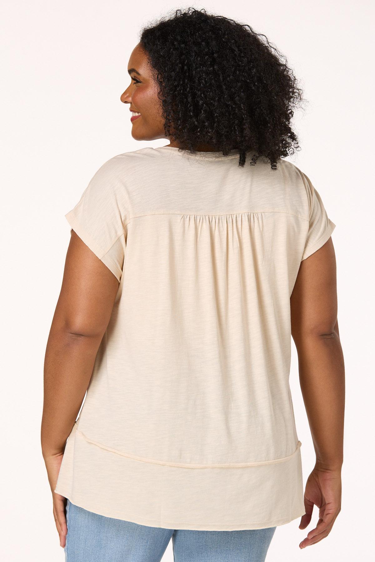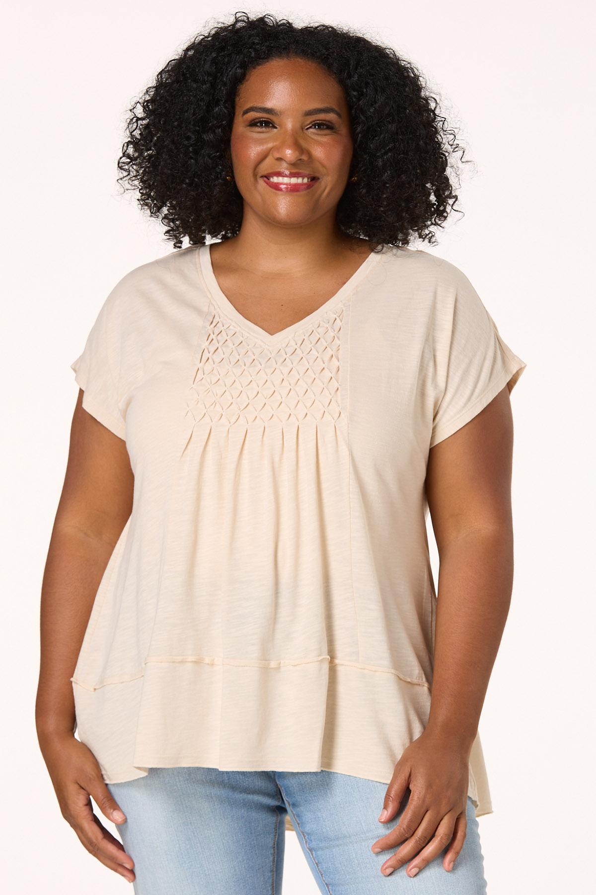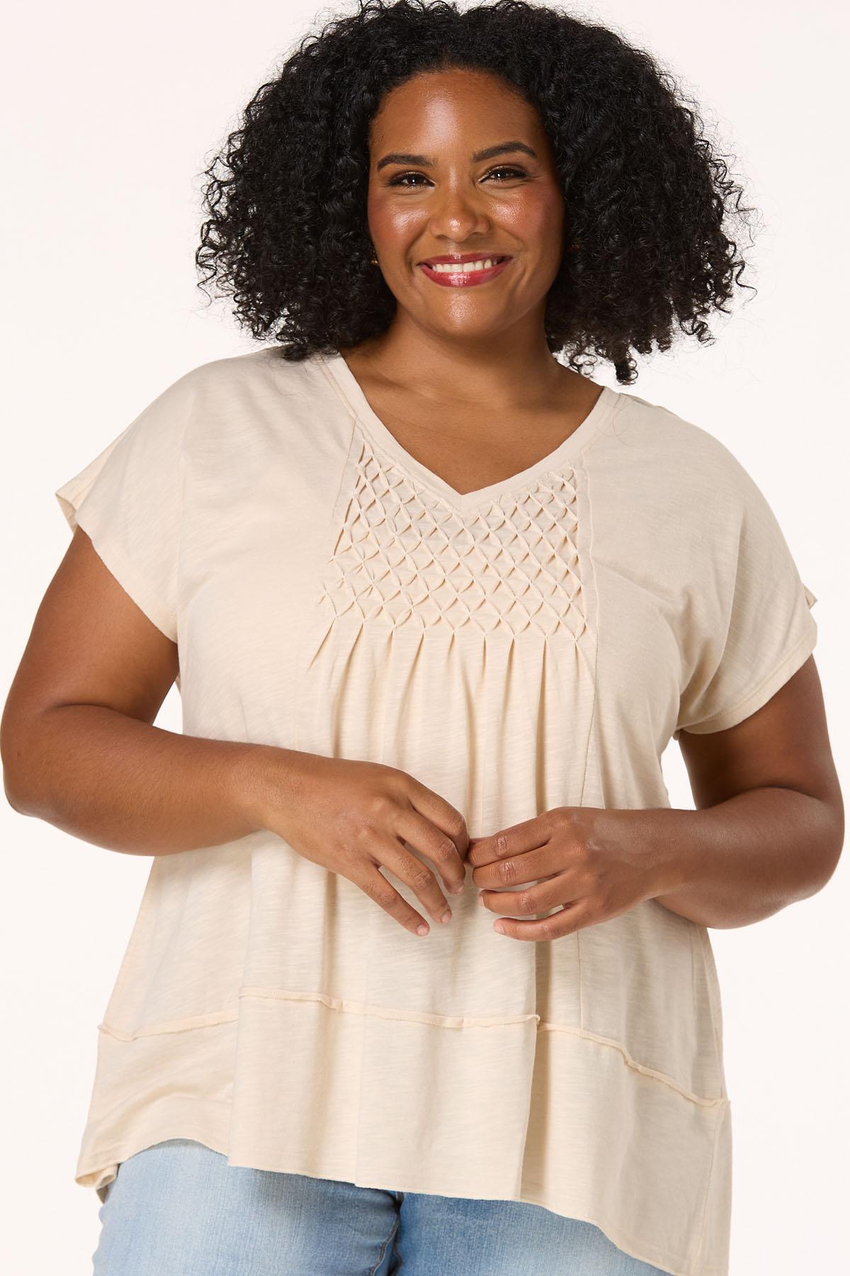 This delicate, detailed look is a cute and casual option for every day. Lightweight-stretchy knit fabric features a solid beige hue, short sleeves, a v-neckline and pintuck-inset design in front.
