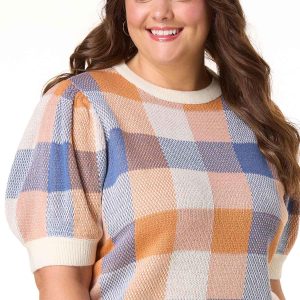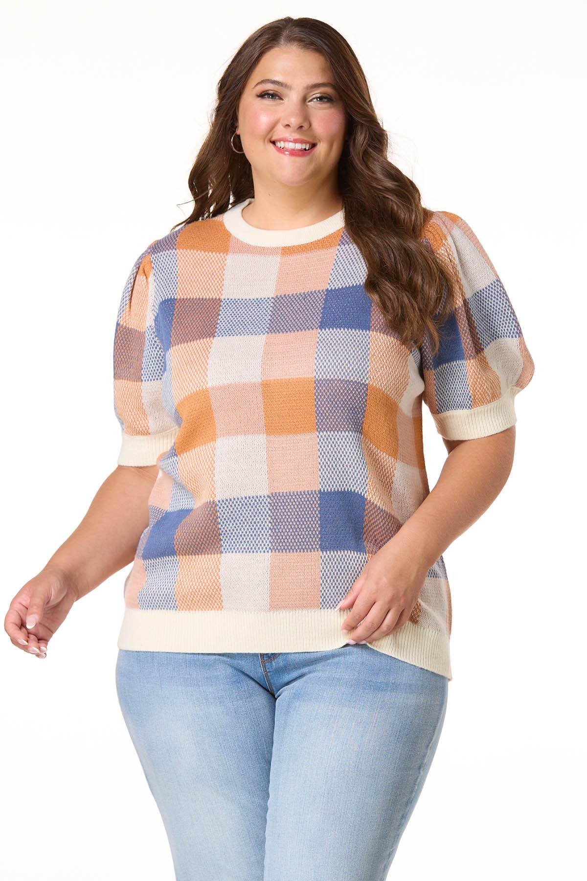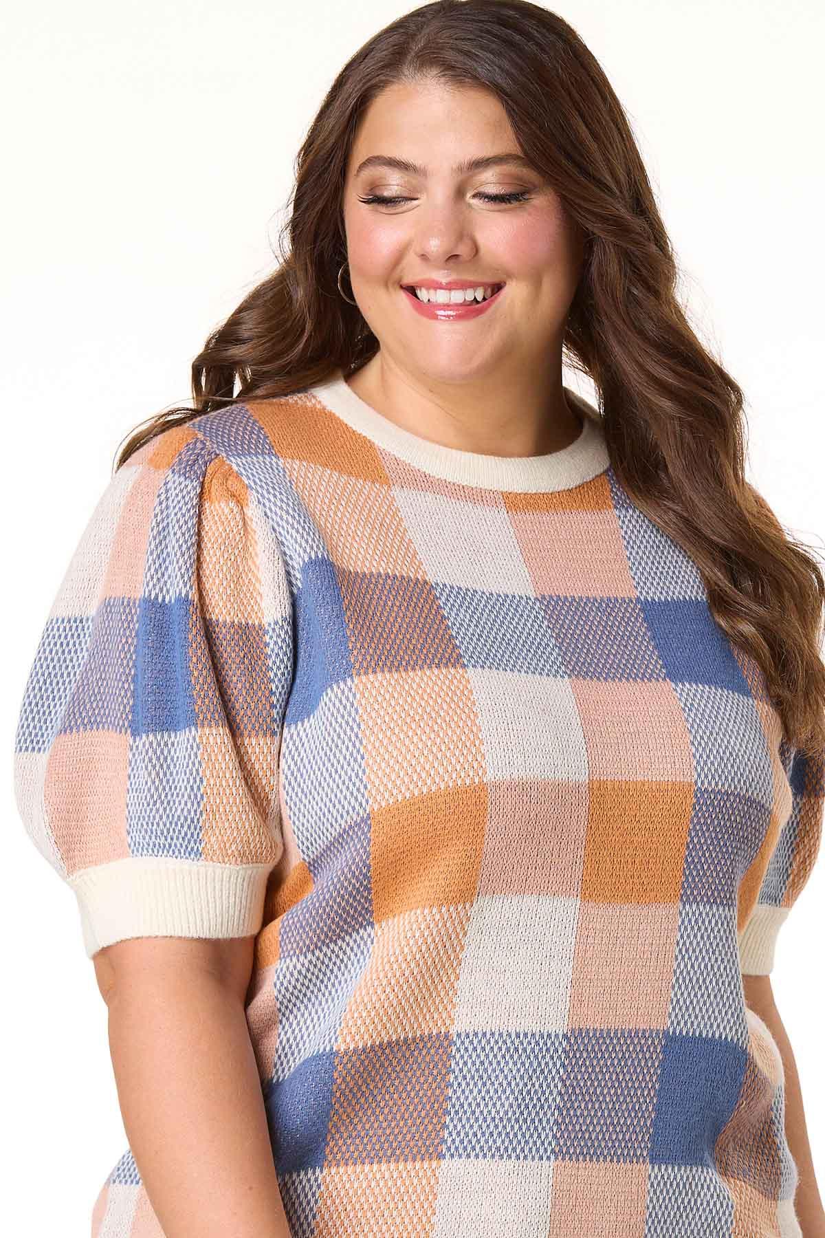 Stay cozy in style with this blue and orange plaid sweater, featuring short puff sleeves and all the fall feels, day in and day out.