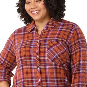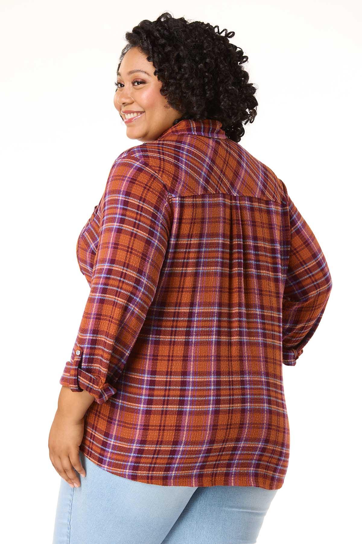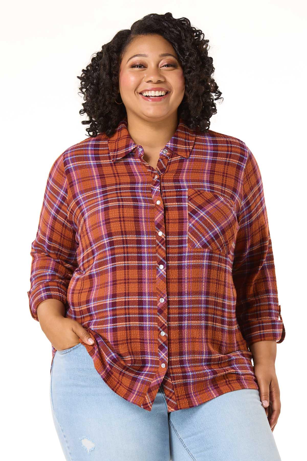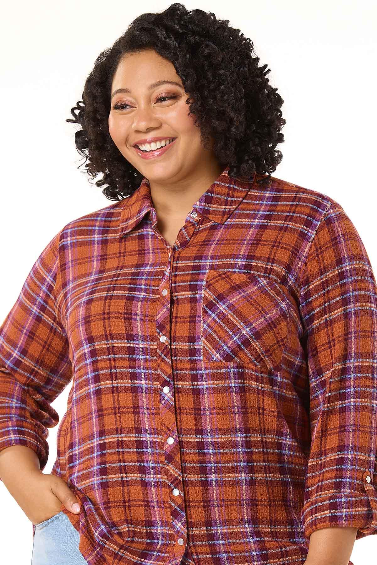 Pumpkin patches and fall afternoons were made for a look like this with its textured-woven fabric, check pattern, snap down front and spicy hue – perfect for jeans, boots and that chilly-autumn air.