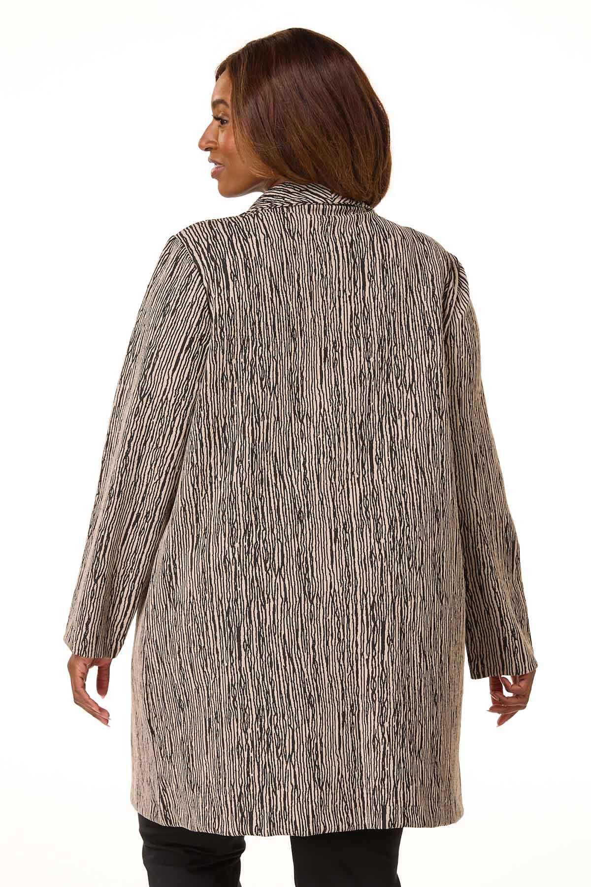 This top-layer style is so perfect for a chilly early fall evening. Lightweight-stretchy fabric features a textured black-and-beige abstract-stripe print with a shawl collared neckline, a single front-hook closure, front pockets and long sleeves.