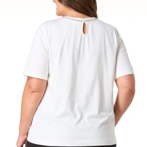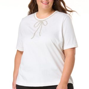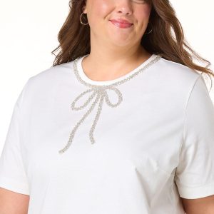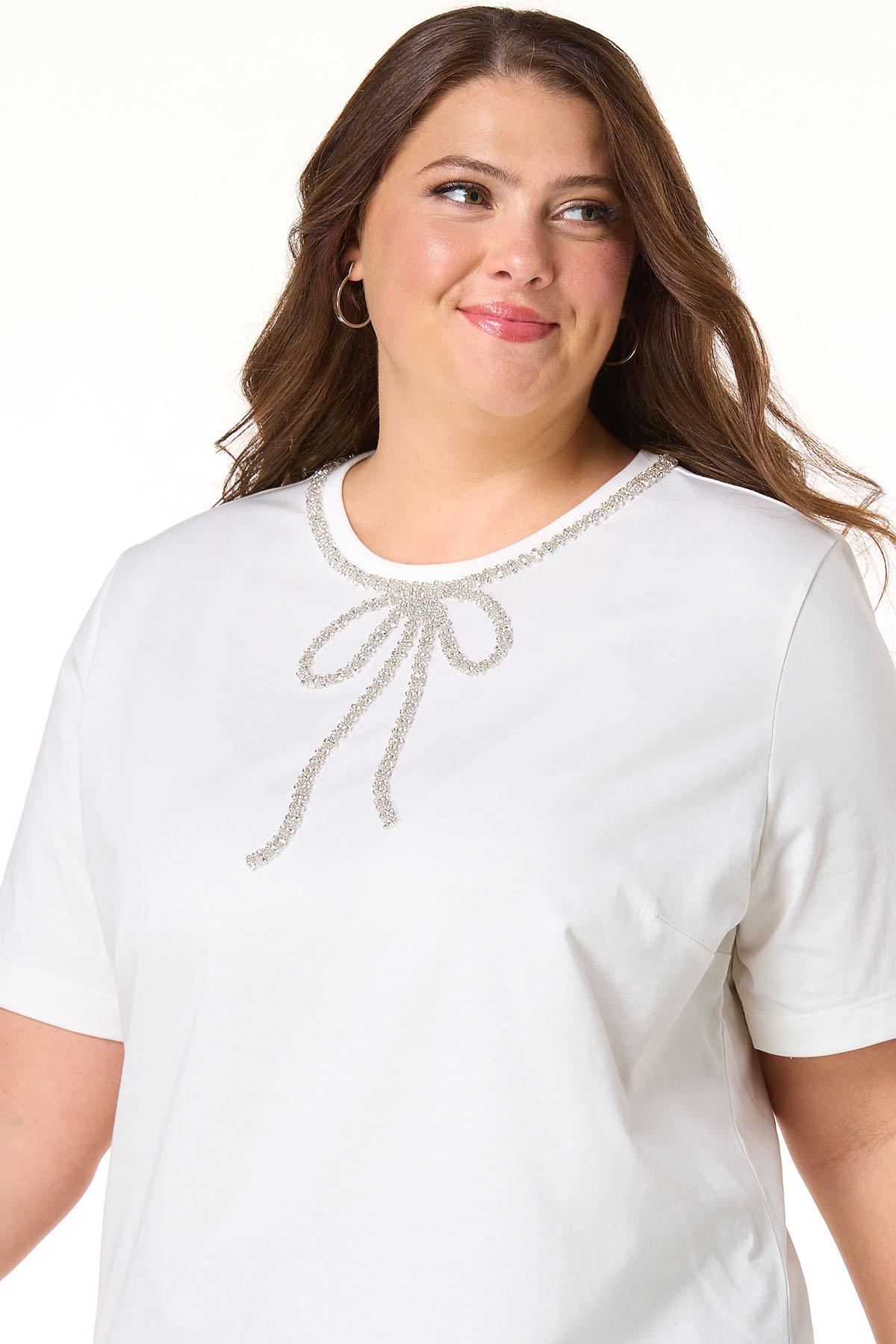 Elevate your everyday with this ivory knit top from our exclusive Cato Collection. Crafted from super soft fabric for all-day comfort, it features a sparkling rhinestone bow neckline that steals the spotlight. Finished with a keyhole button closure at the back, this top is the perfect blend of charm and polish.
