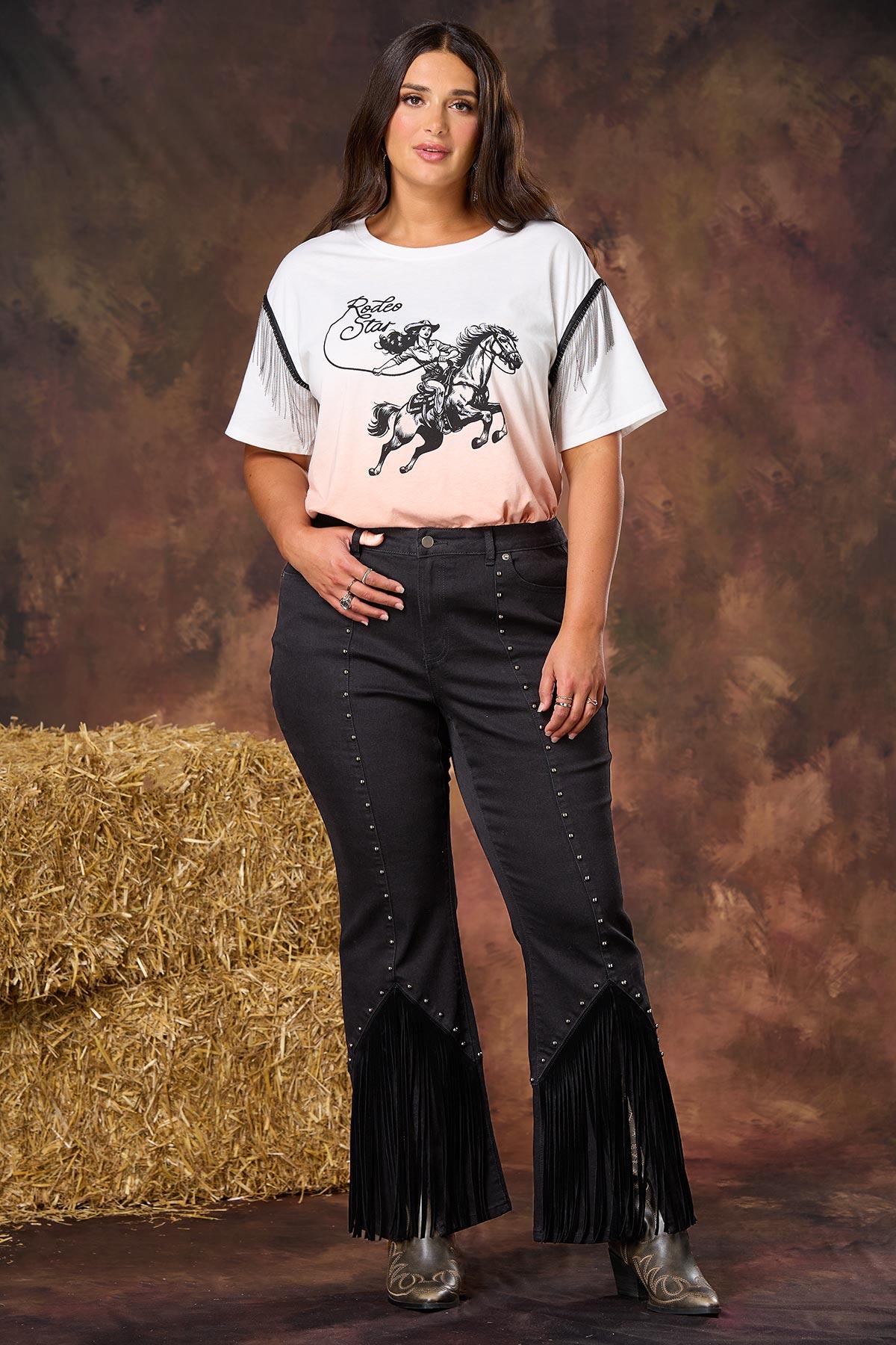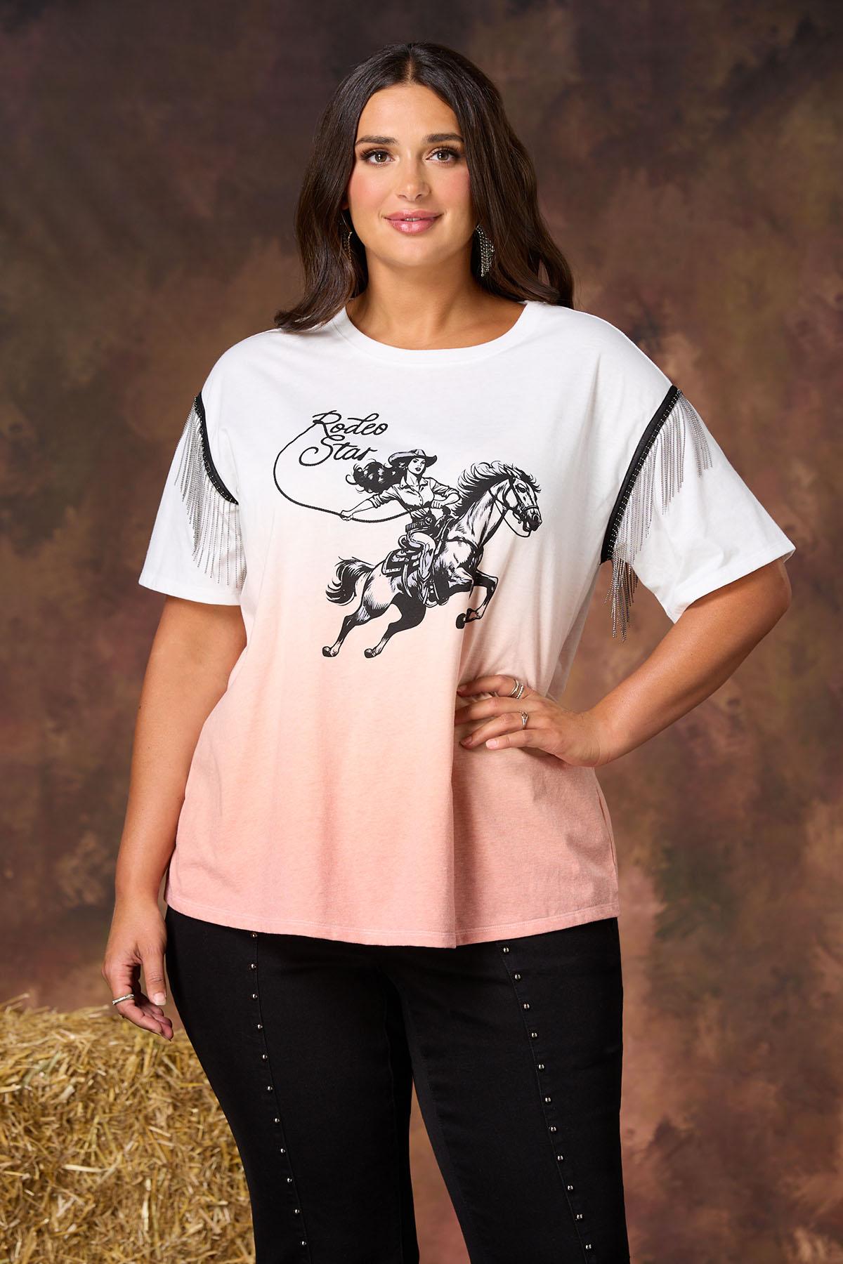 We’ve rounded up a statement look that’s sure to be a standout with its orange ombre hue, chain fringe trim, soft knit and “rodeo star” graphic for a fun and festive finish.
