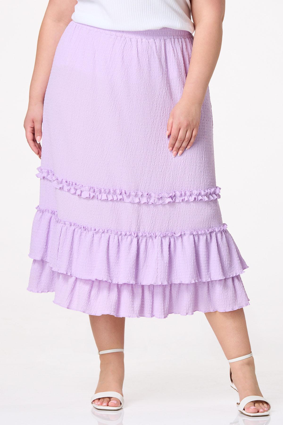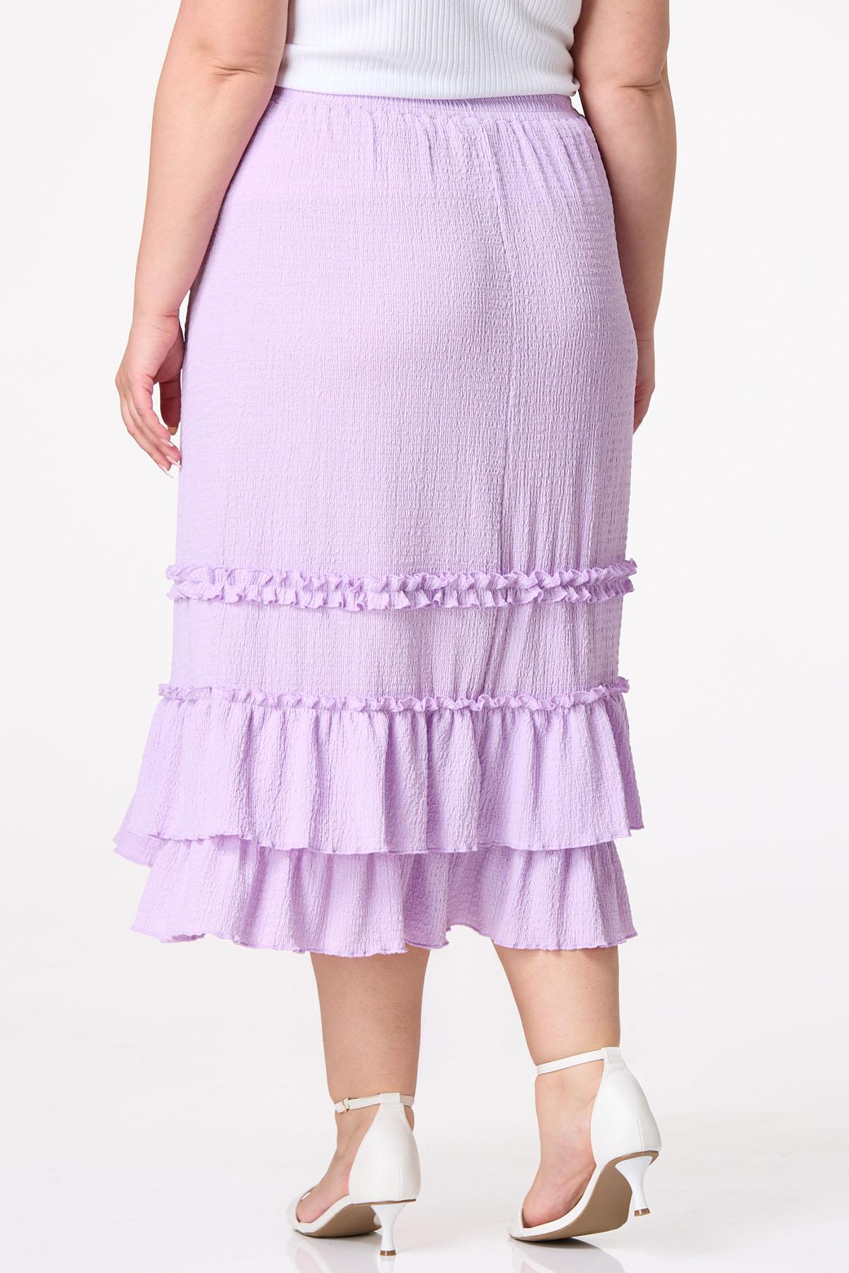 You’ll be looking cute and comfy when wearing this stretchy, pull-on style, featuring an elastic waist, ruffled design, light-lavender hue and tons of texture for a feminine and free-spirited finish.