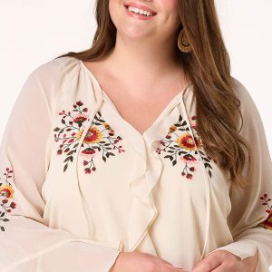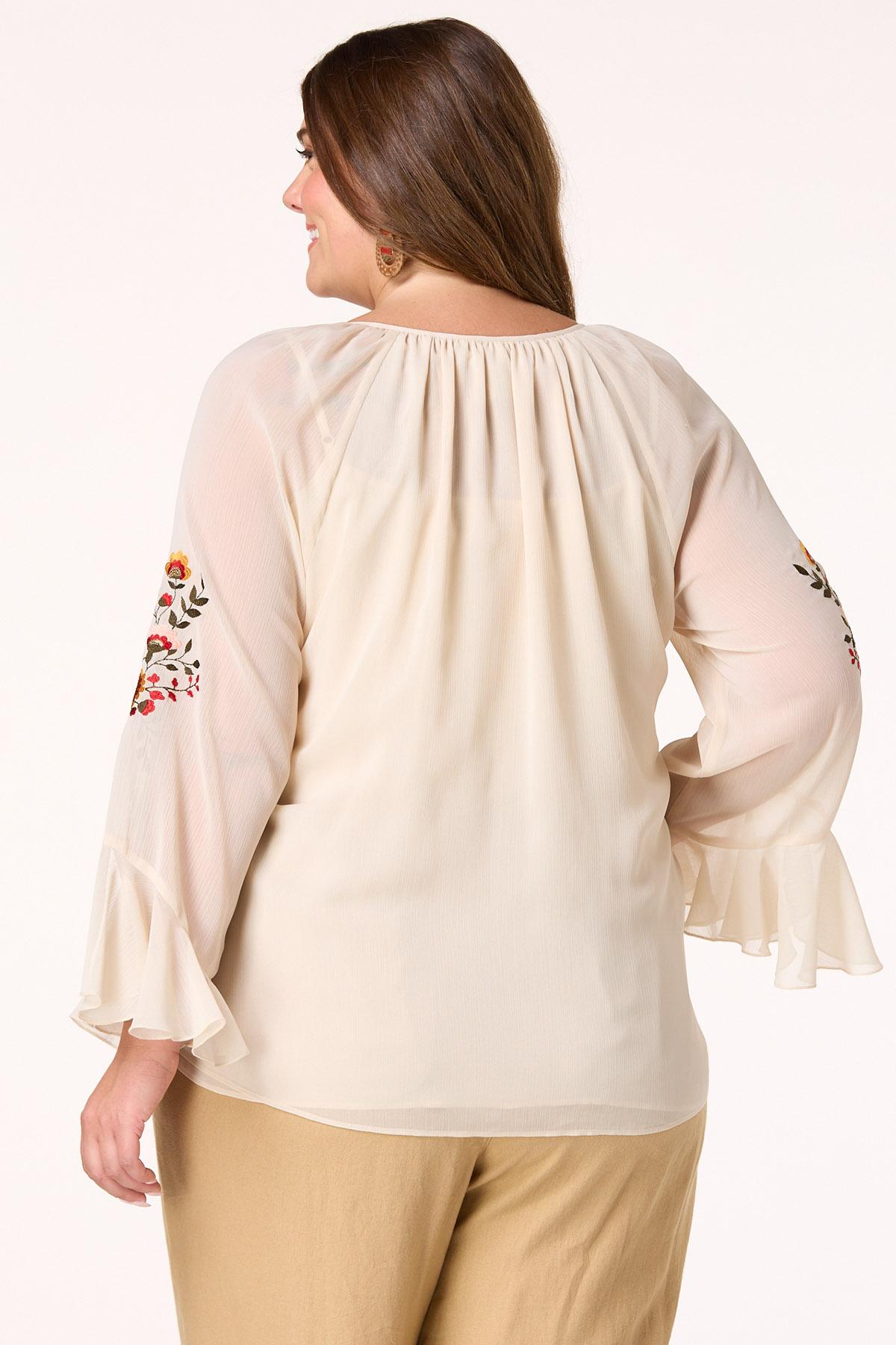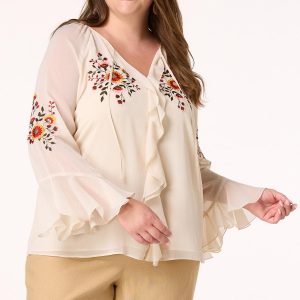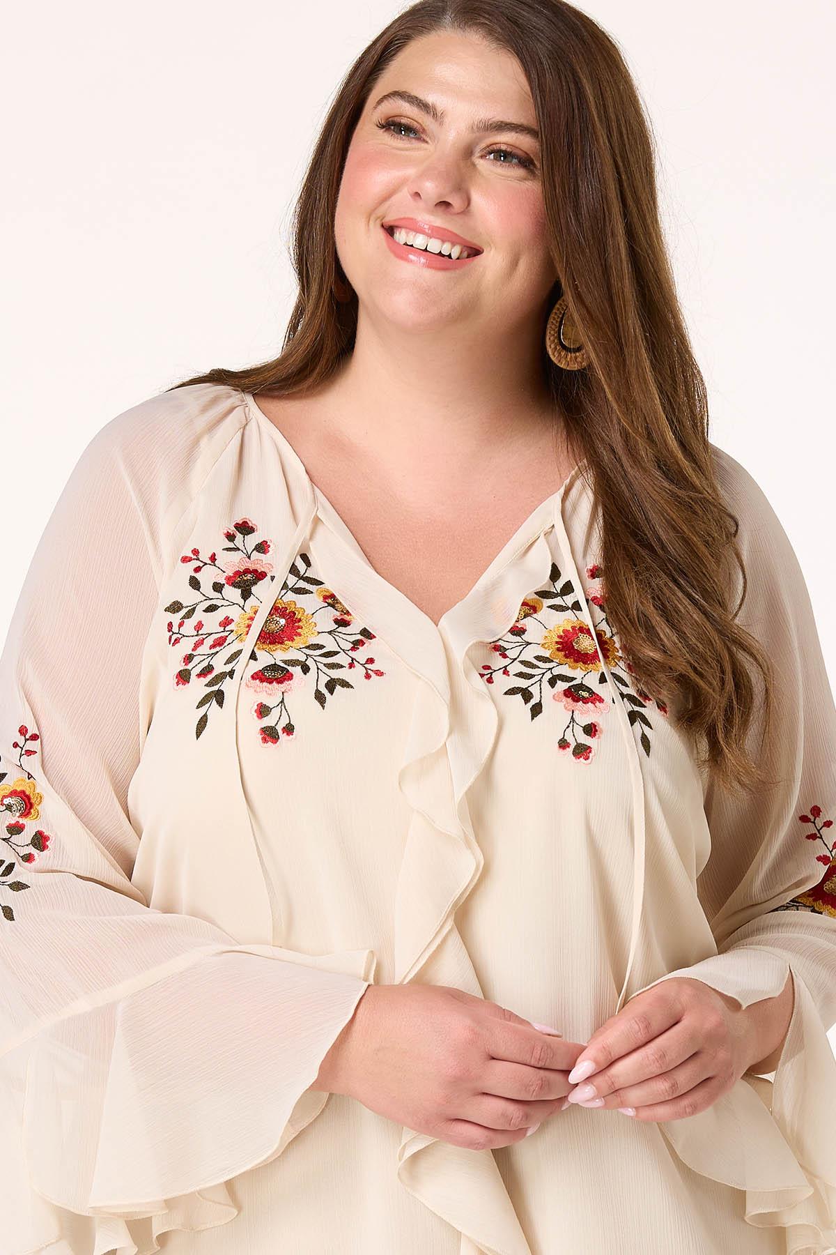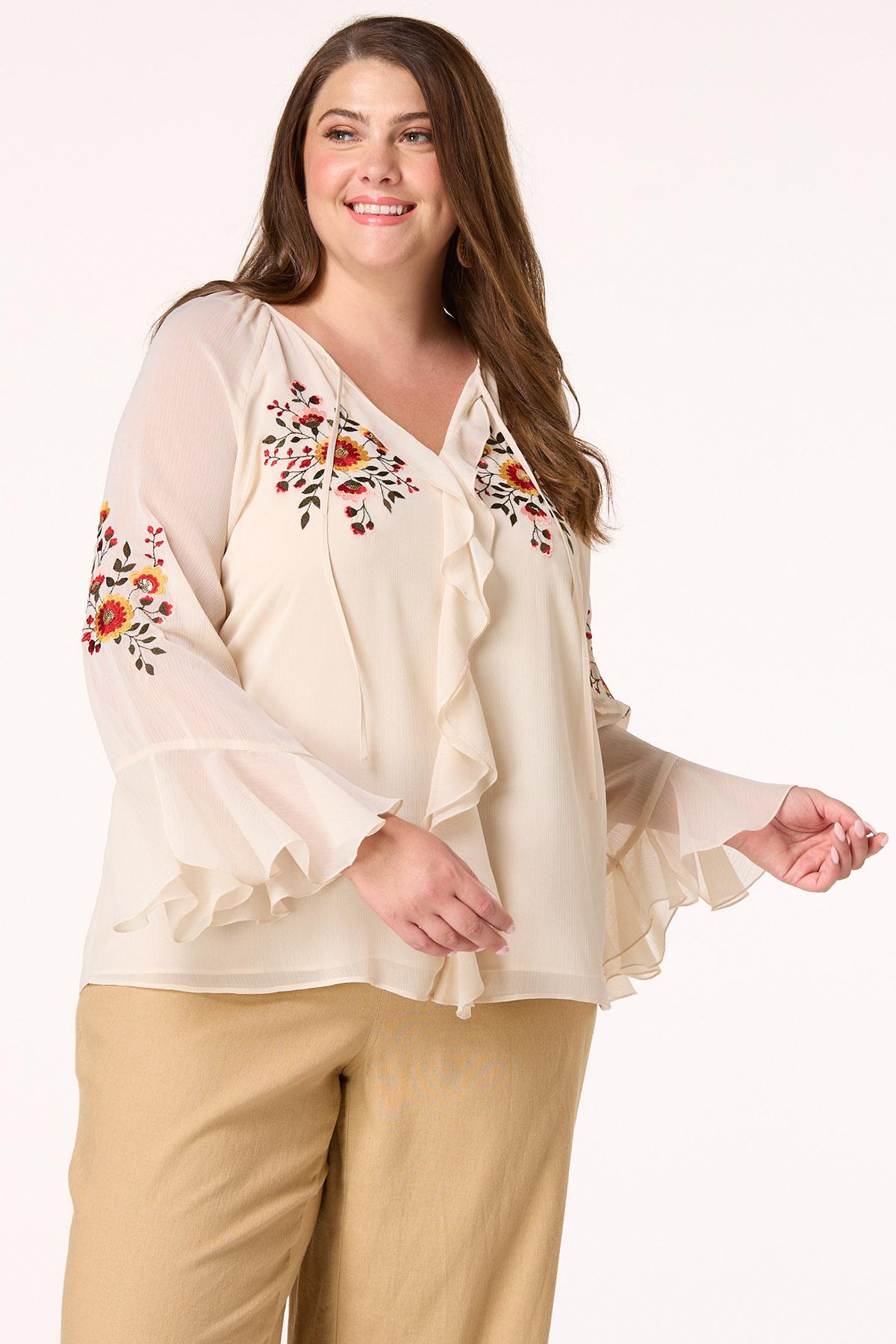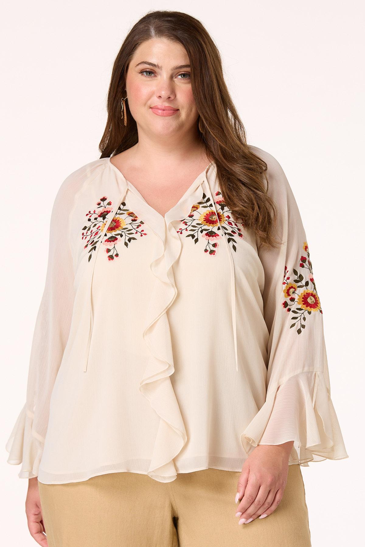 Romance your wardrobe with this limited edition style, featuring ruffled trim, a crepe fabrication, flounced sleeves and a floral-embroidered design with gold-sequin accents. Charming to say the least and a beautiful choice for dressing up denim.