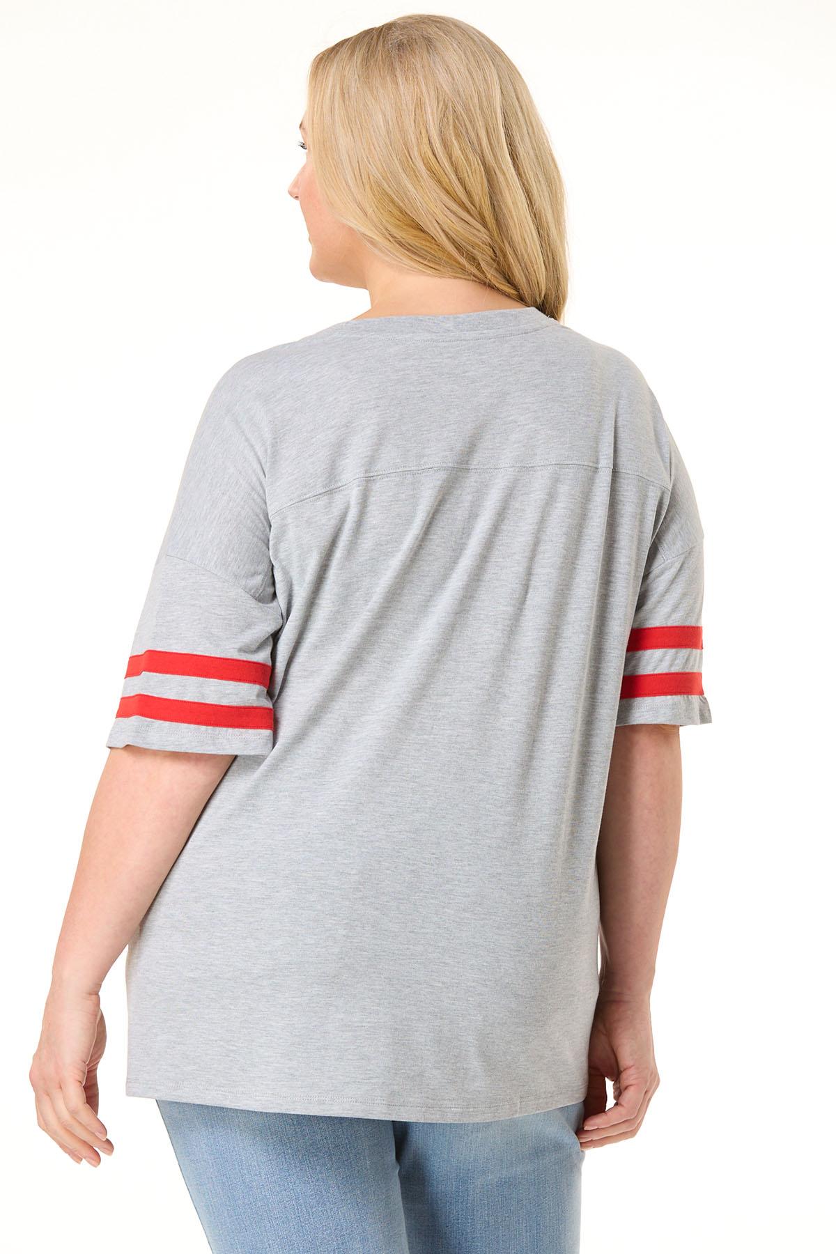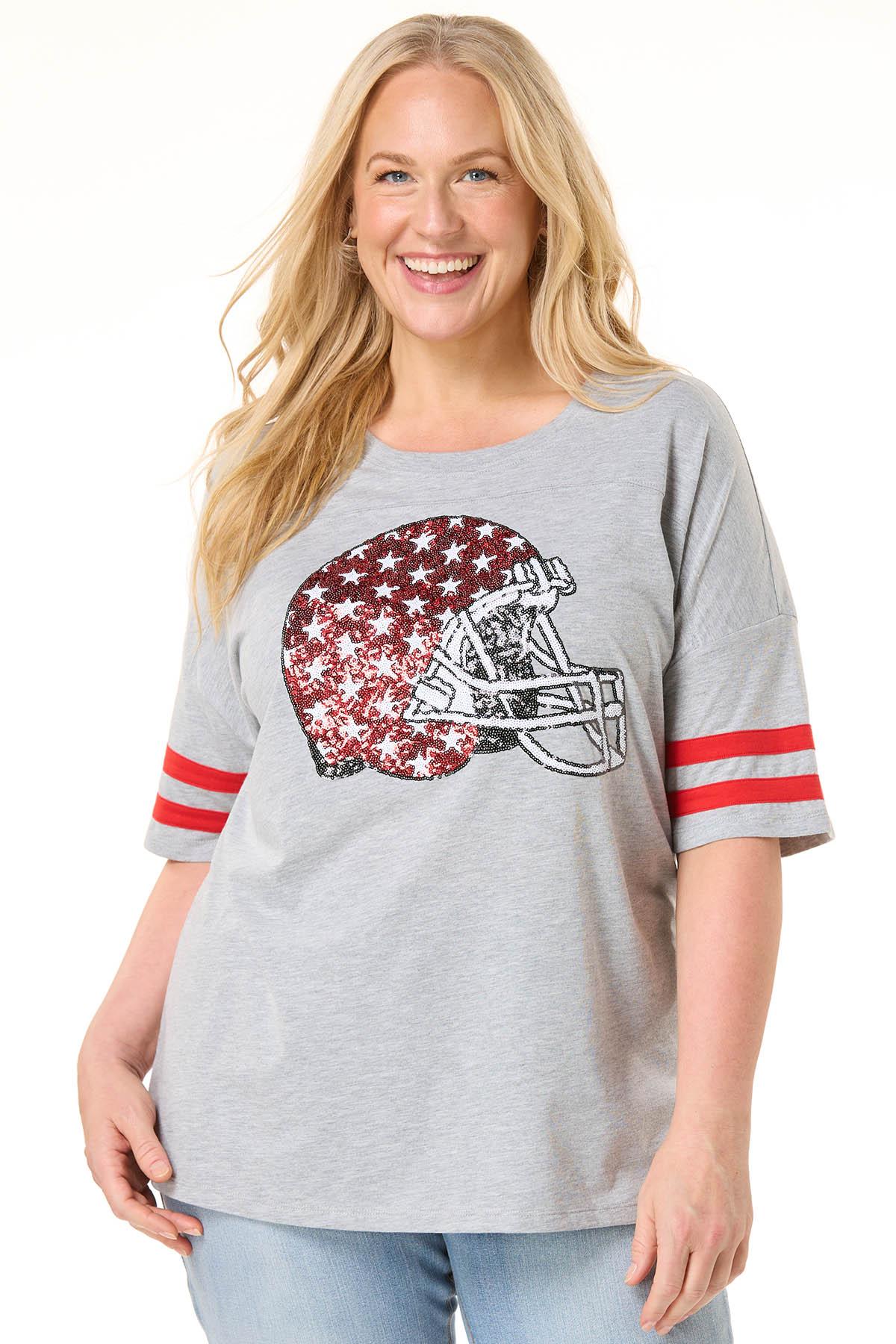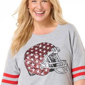 The season is just getting started so it’s time to pull out your game-ready style and this scoop neck tee is here for it. Sporty-striped sleeves, a so-soft knit, relaxed fit and sparkly sequin helmet are all the reasons it’s perfect for those shining moments of the season.