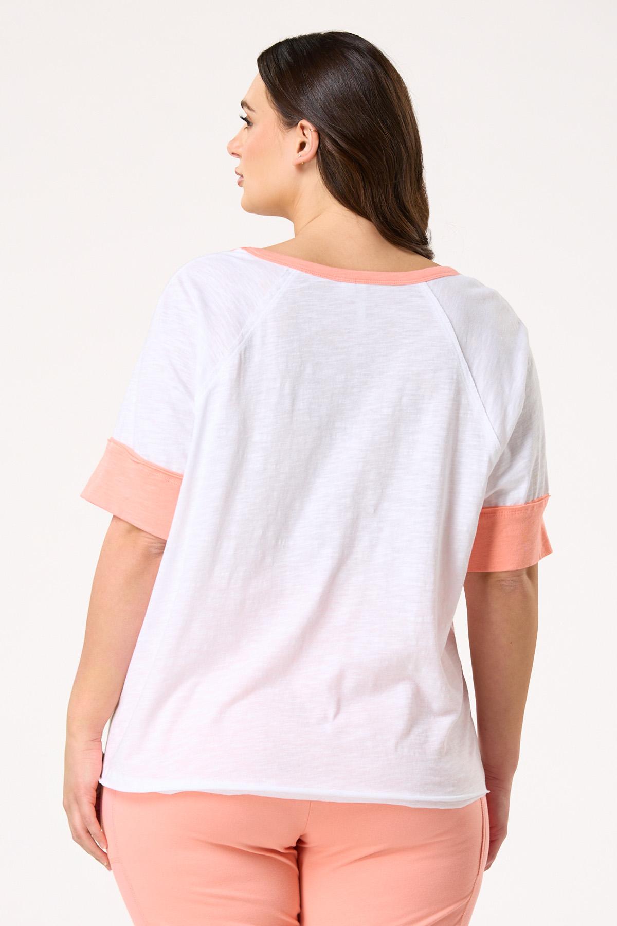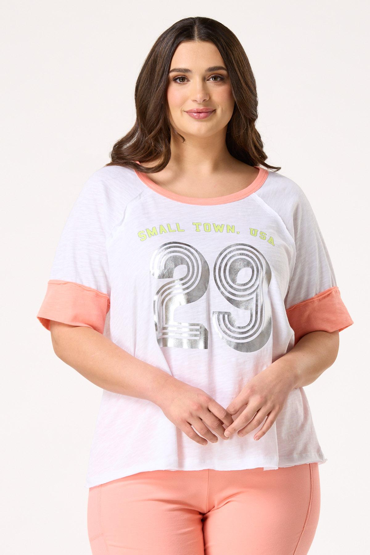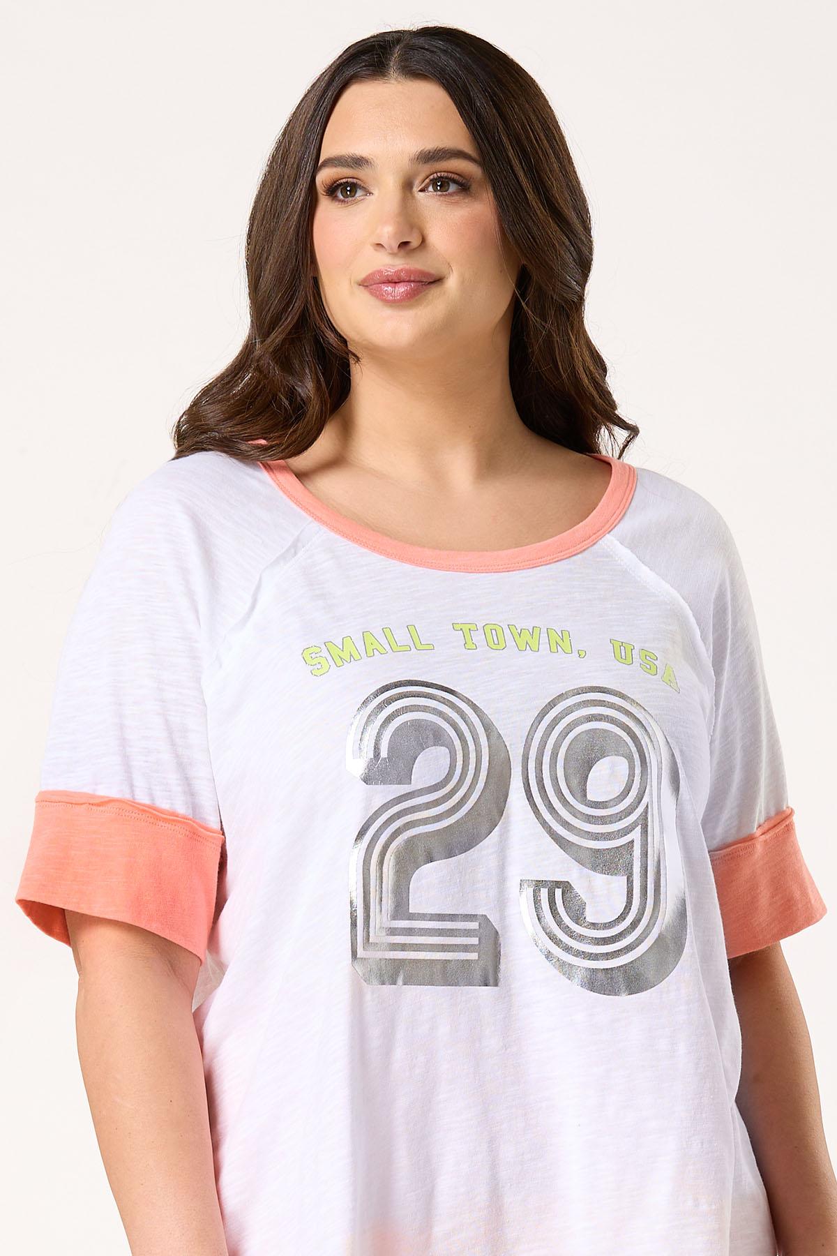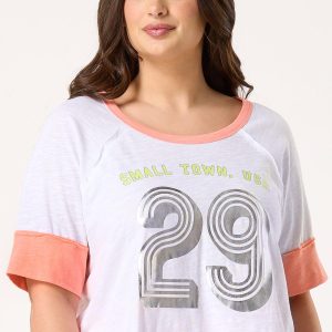 When keeping things light and low-key are on the agenda, this casual tee will fit right in. A scoop neckline, contrasting trim and relaxed fit are topped by a small town graphic and metallic details for a look that’s sporty-chic and easy to love.
