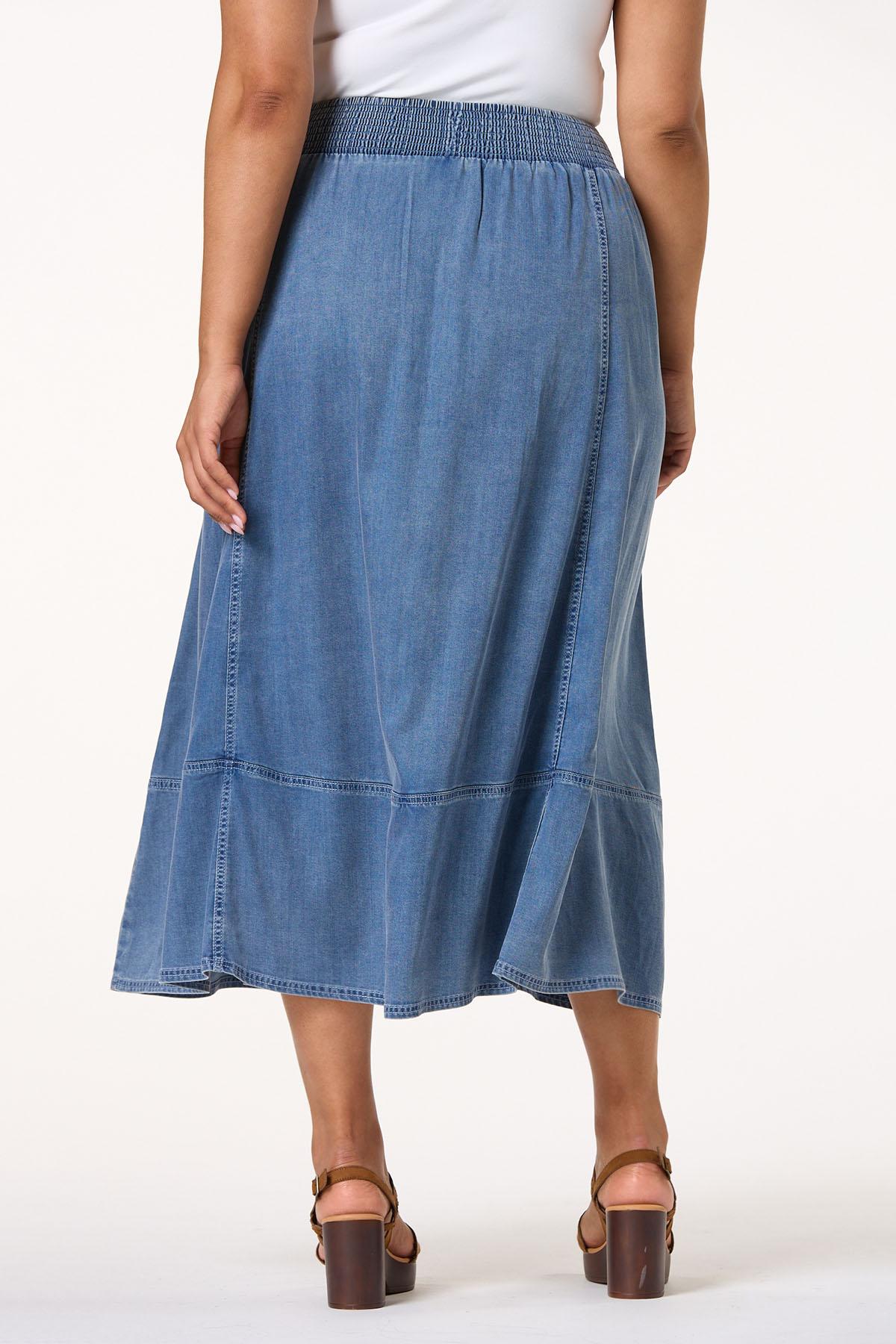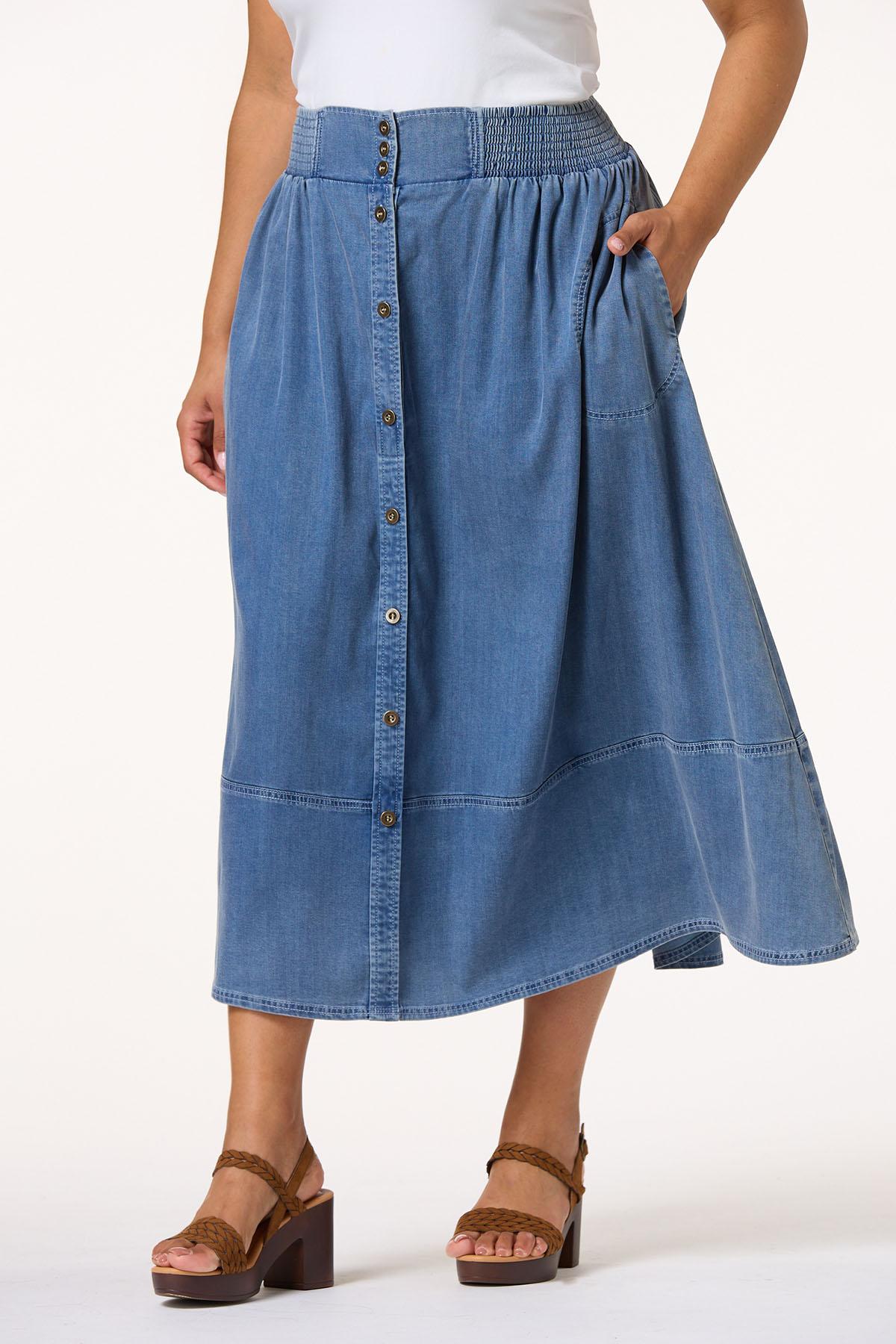 It’s your favorite denim look with a lighter and cooler feel. A stretchy-smocked waist meets antique-gold buttons, while a chambray woven fabric flows into a longer length for a look you’ll love with one of our popular printed tops or must-have graphic tees.