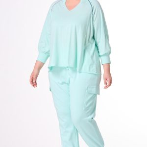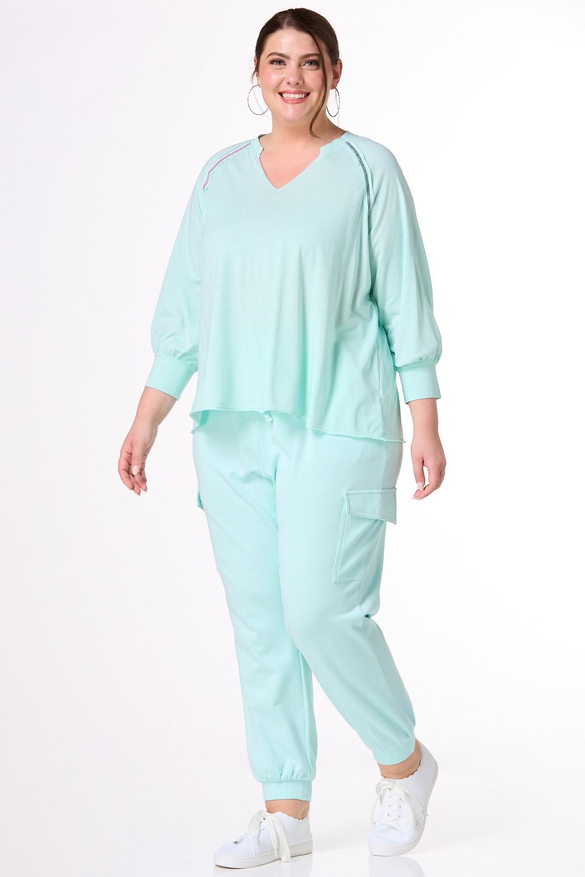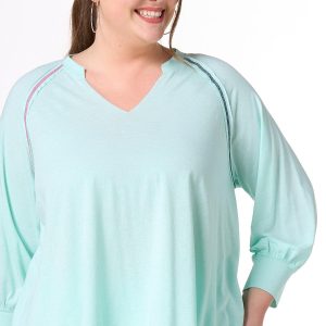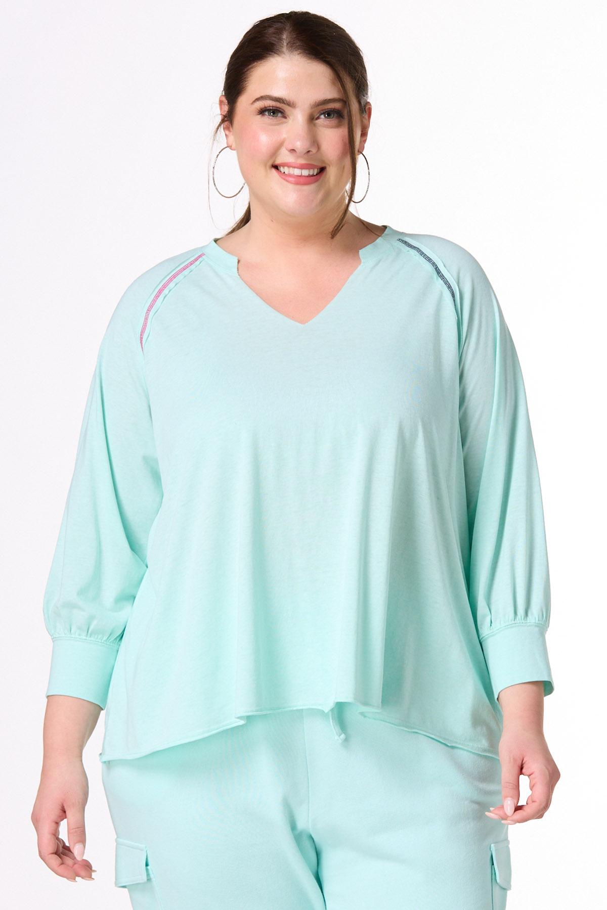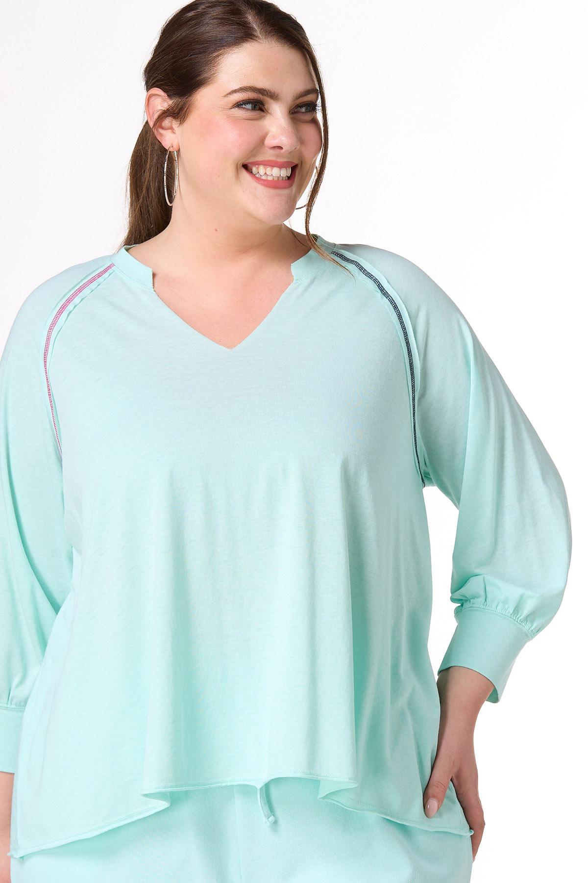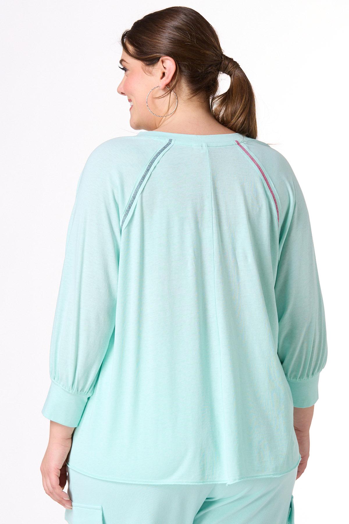 You’ll be looking cute and ready for low-key days with this pullover style, featuring a notched, v-neckline, relaxed fit, raw seams, so-soft feel and exposed stitches in a contrasting, red and blue hue.