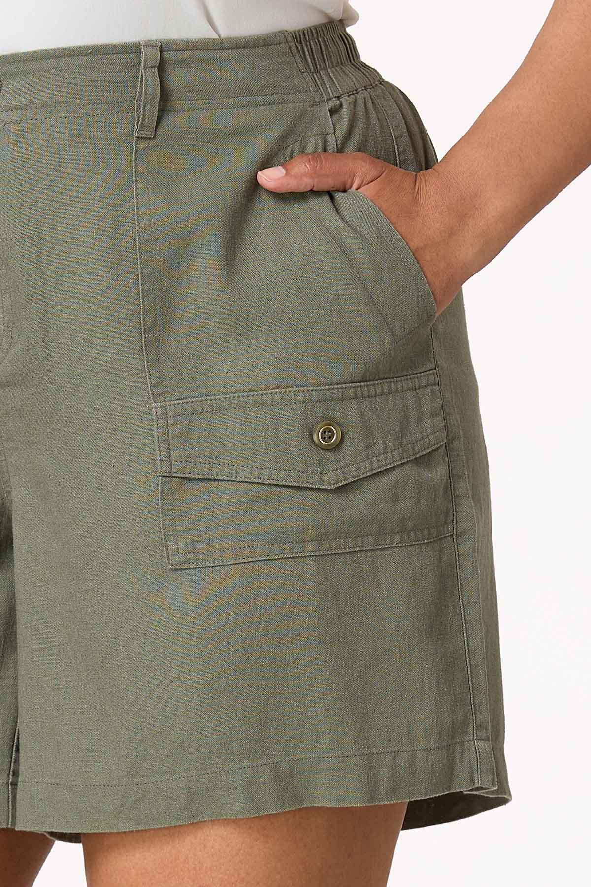 Sunshine and carefree vibes will be on your mind with this casual style, featuring a button front closure, cool, linen-blend, cargo pockets and a relaxed fit, perfect for a worry-free weekend.