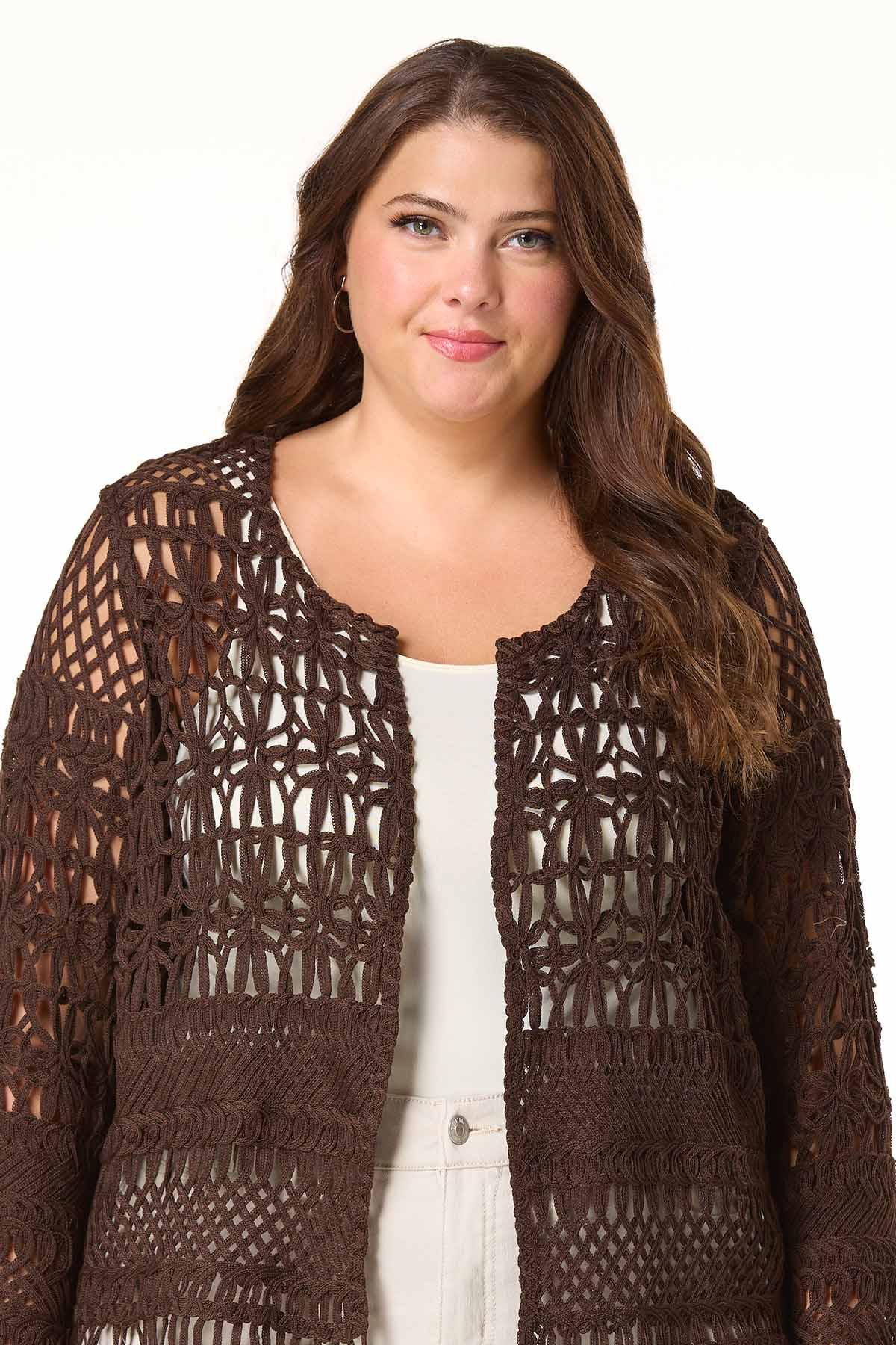 Wrap yourself in texture and warmth with this rich brown soutache crochet cardigan. Intricate detailing meets laid-back charm for a look that’s perfect for layering from day to night.