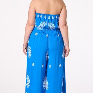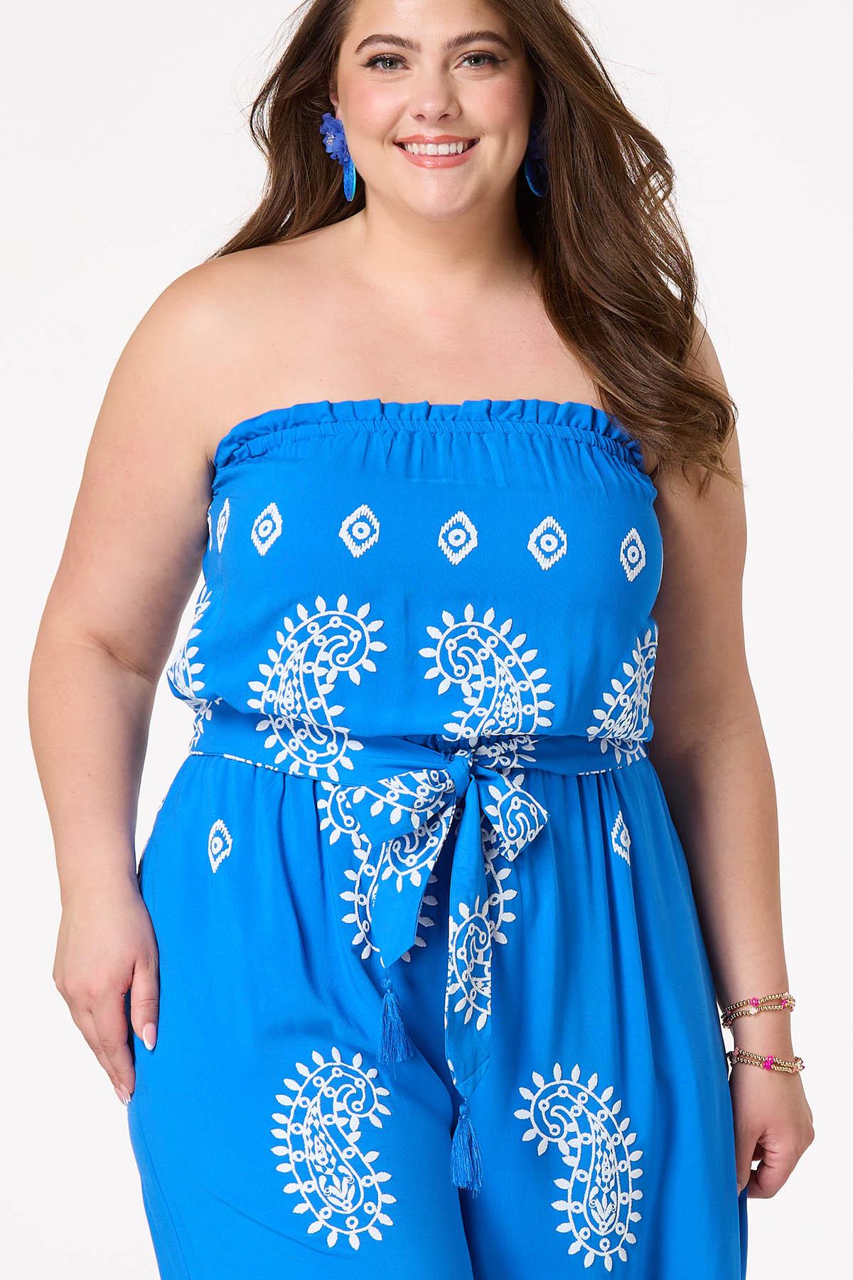 Turn heads in this blue strapless jumpsuit, featuring a textured puff paisley print and a removable tie belt for versatile styling. Effortlessly chic and easy to wear, it’s your go-to piece for standout summer moments.