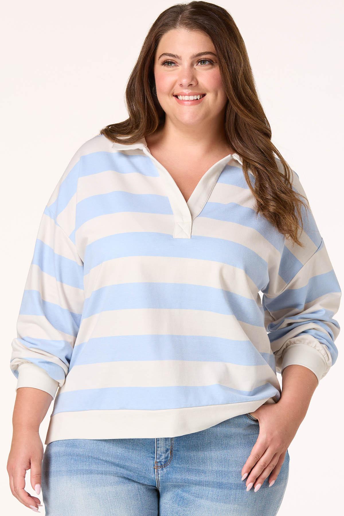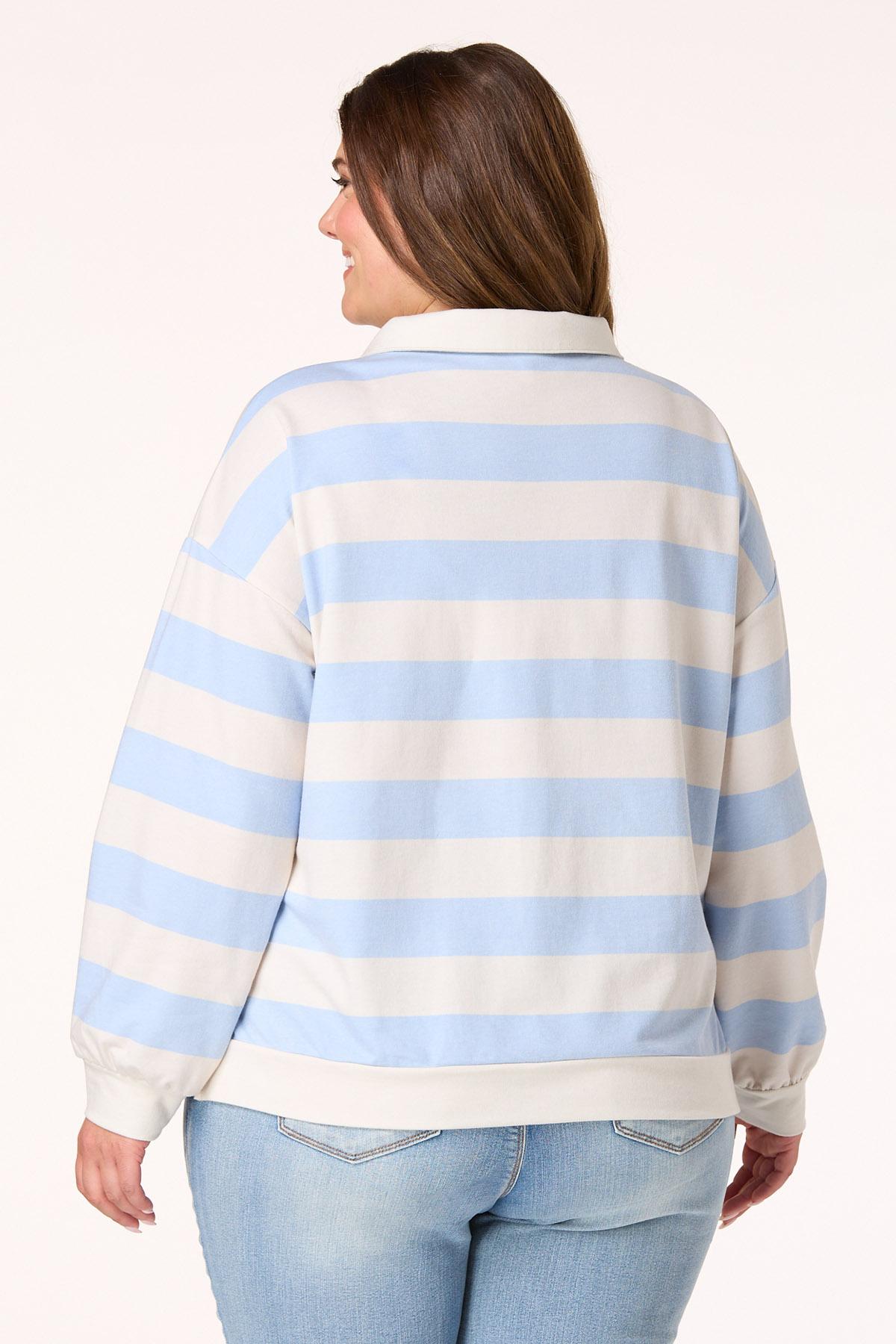 Find yourself loving the timeless and retro feel this rugby brings with its collared, v-neckline, wide-stripe print, side slit hem and soft blue and ivory color palette.