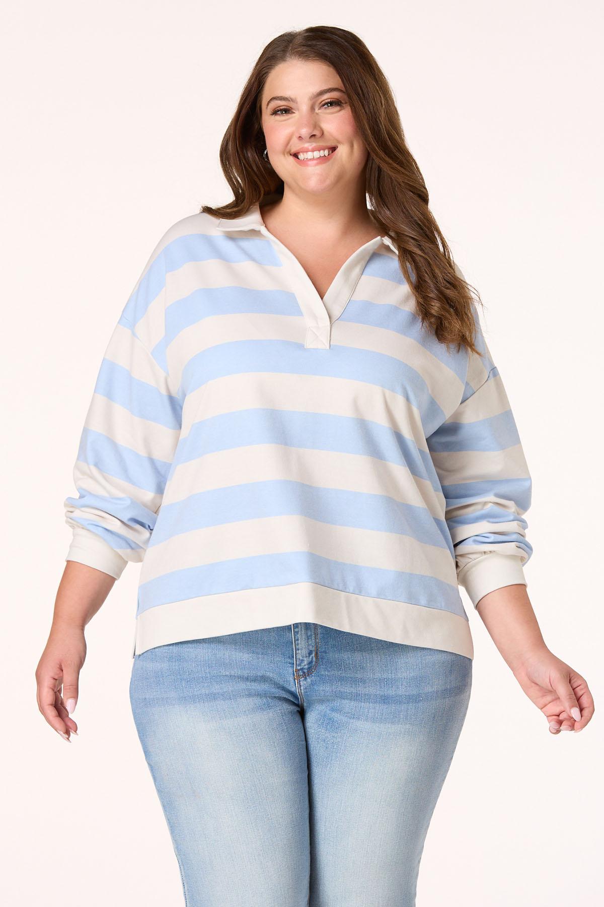 Find yourself loving the timeless and retro feel this rugby brings with its collared, v-neckline, wide-stripe print, side slit hem and soft blue and ivory color palette.