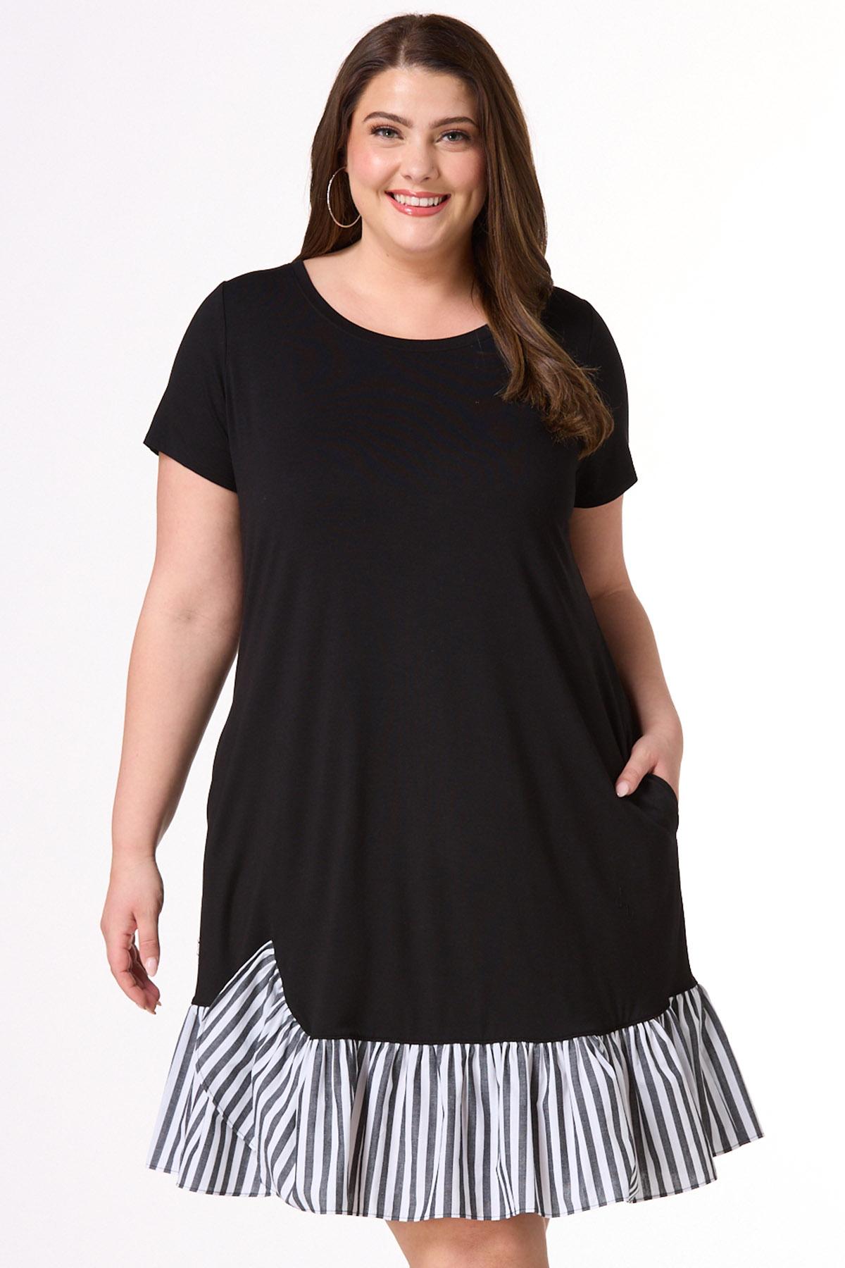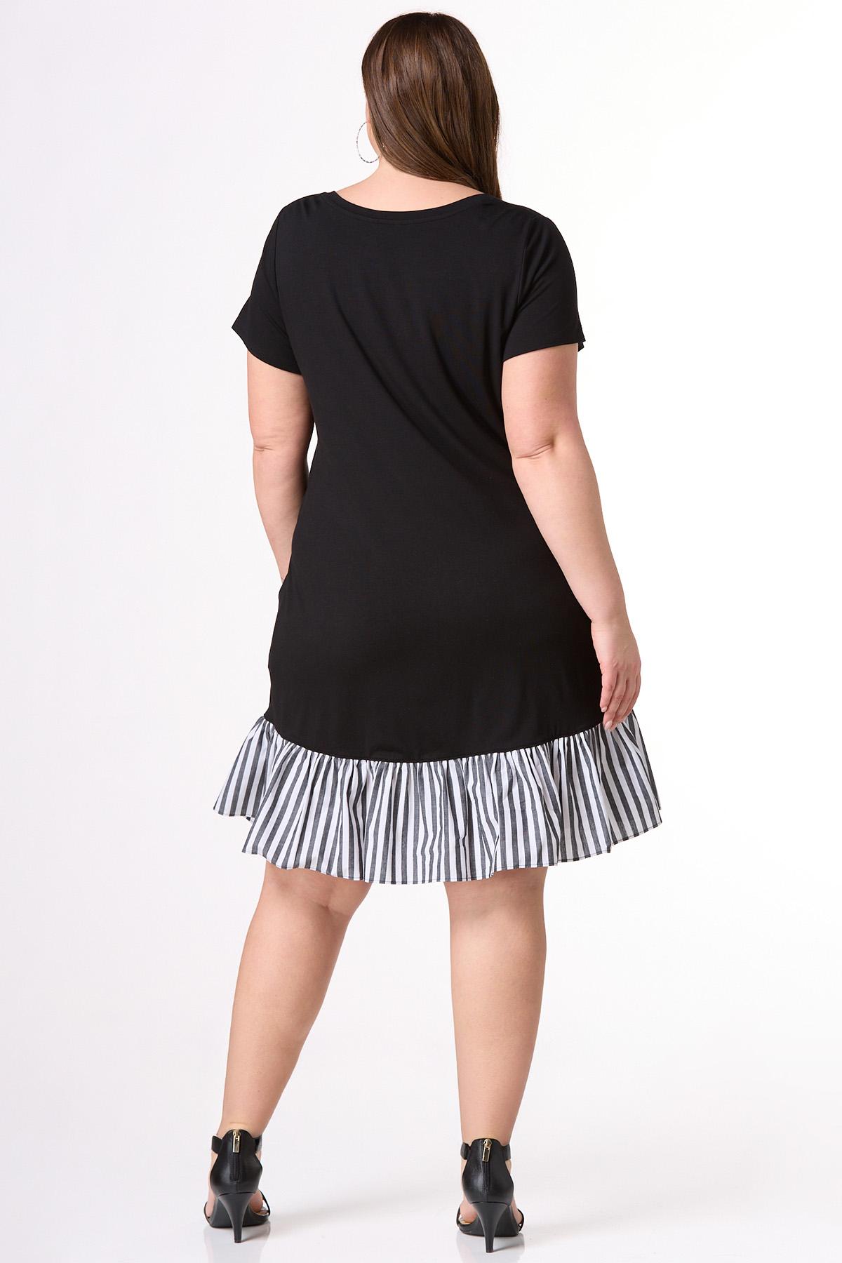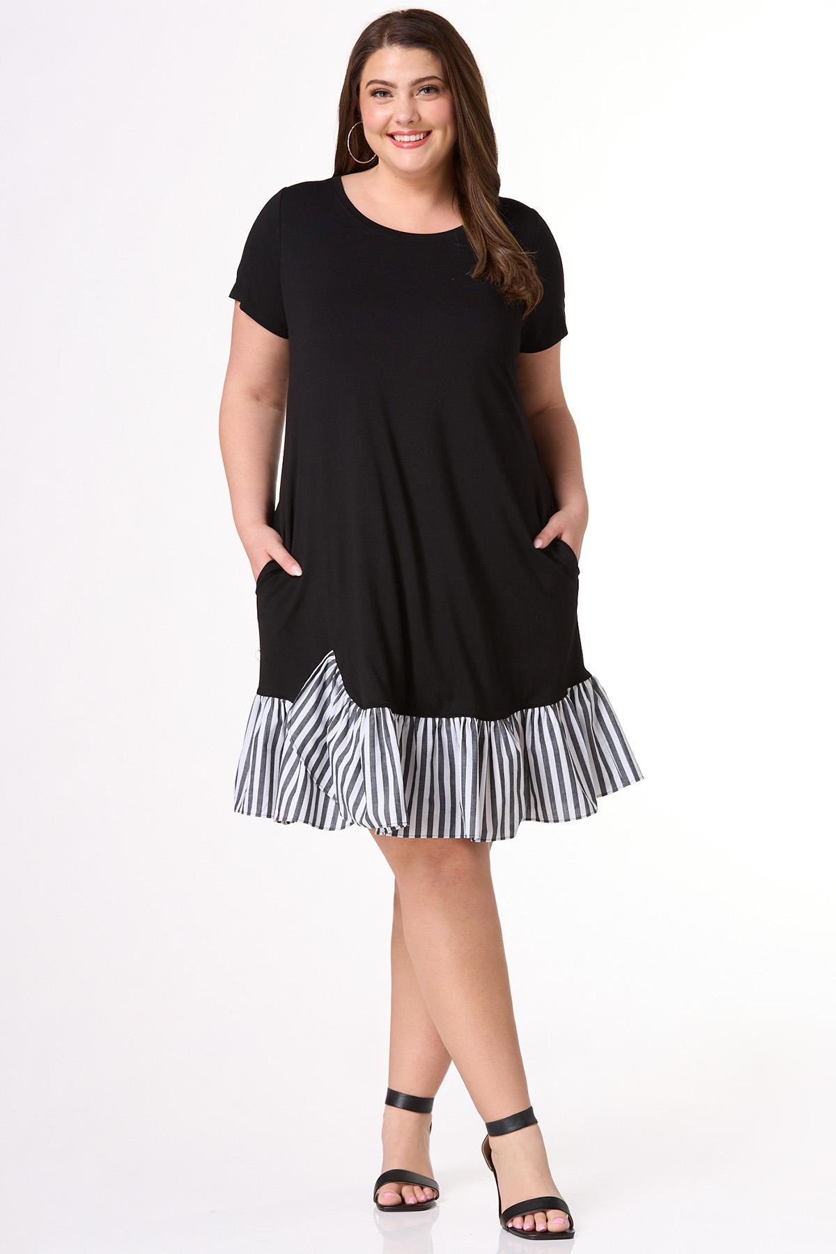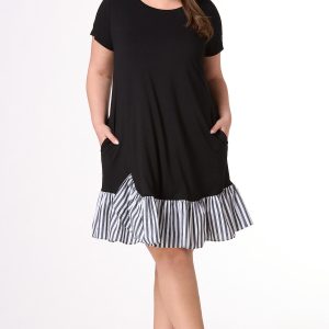 Cute and casual are coming together to greet the sun with this one. A scoop neckline, coral hue and contrasting, stripe-poplin hem, complete this trending look, making it a perfect afternoon out pick for whatever your plans may be.