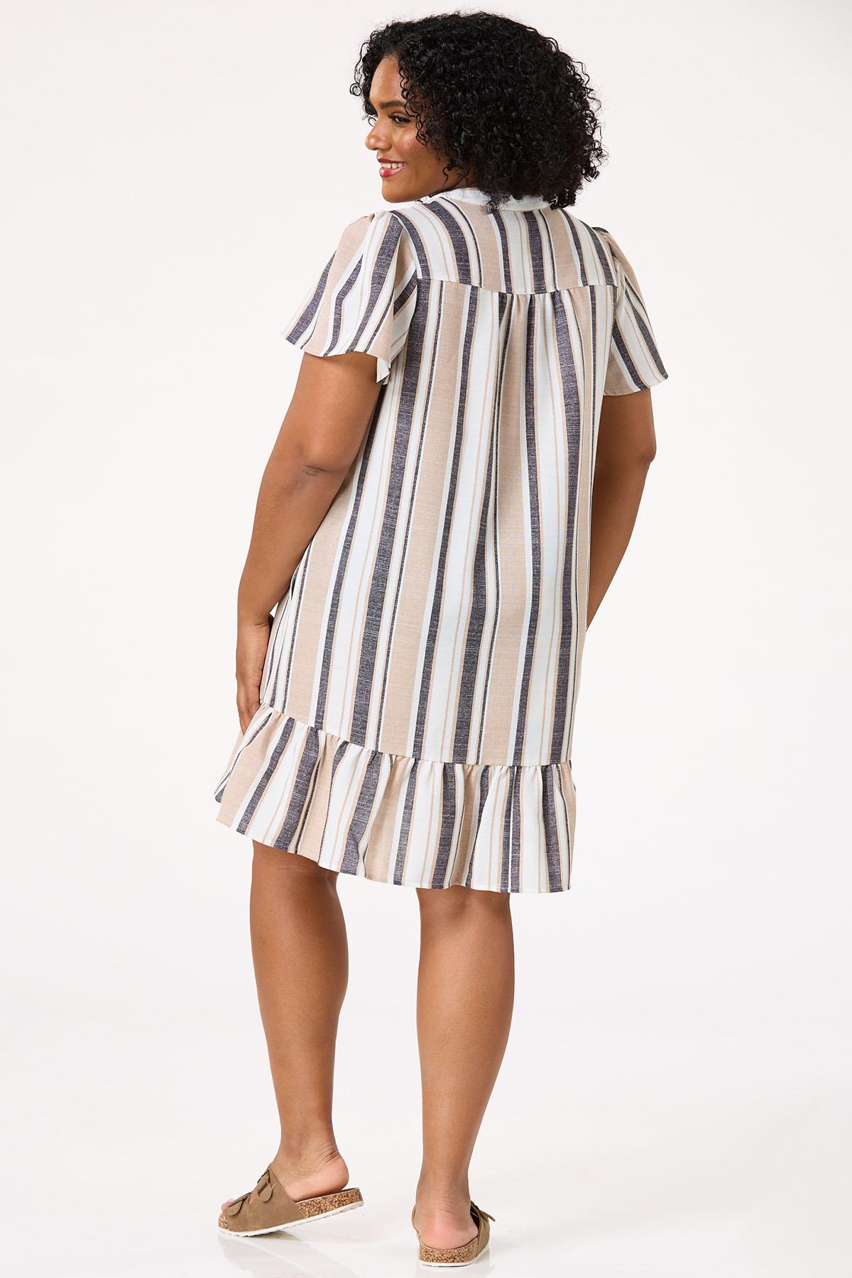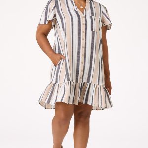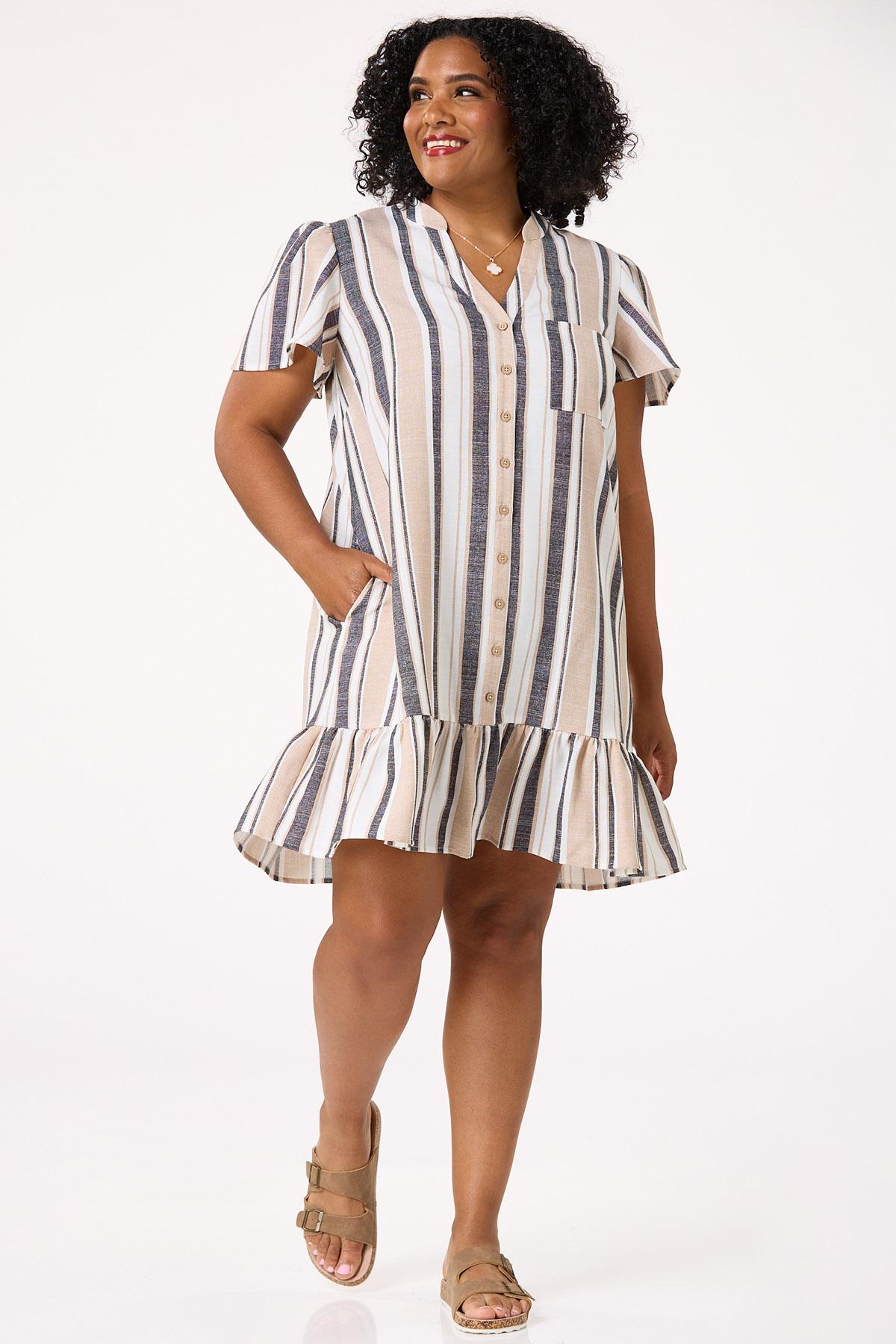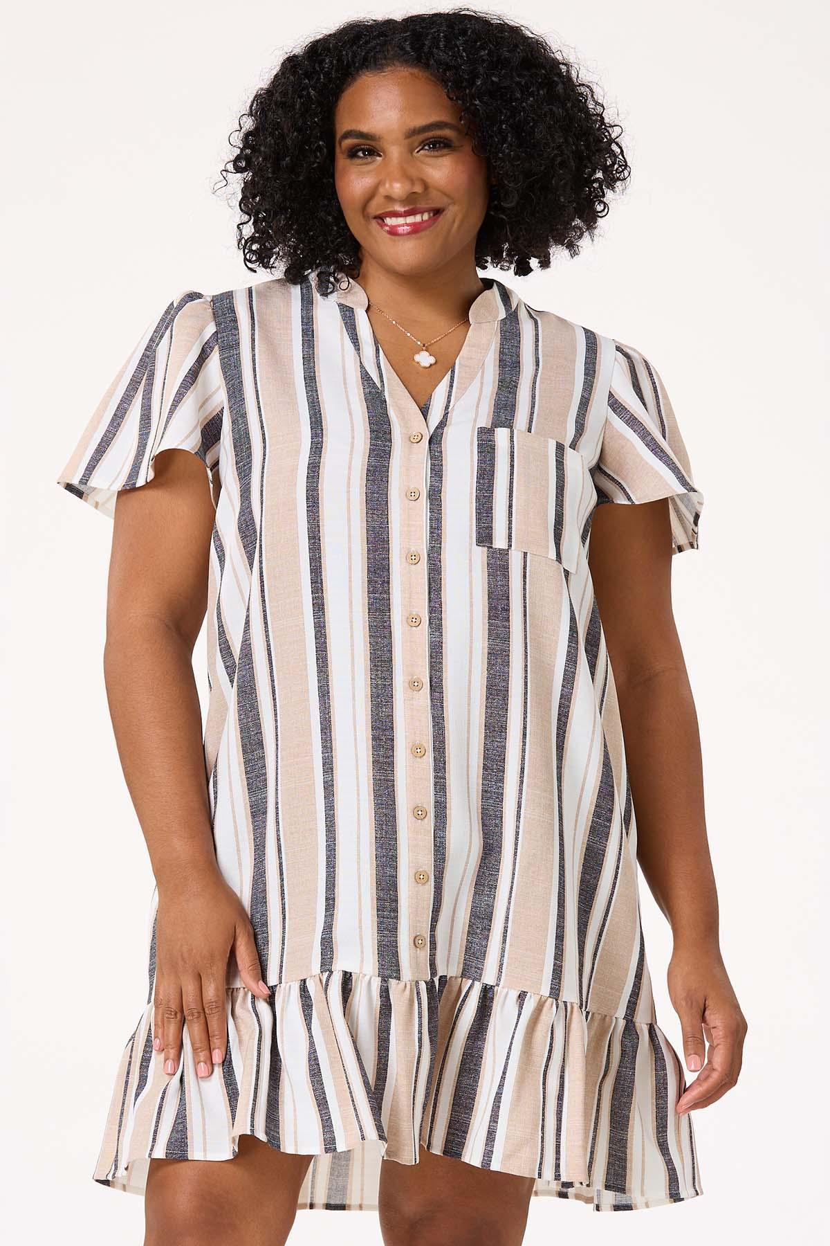 What a cute way to start your day with this button front style. A v-neckline, stripe print, neutral hues, flounced hem and side pockets come together with a cool and comfortable fabric and single font pocket detail.