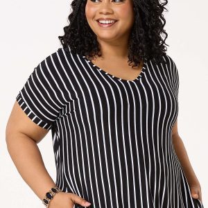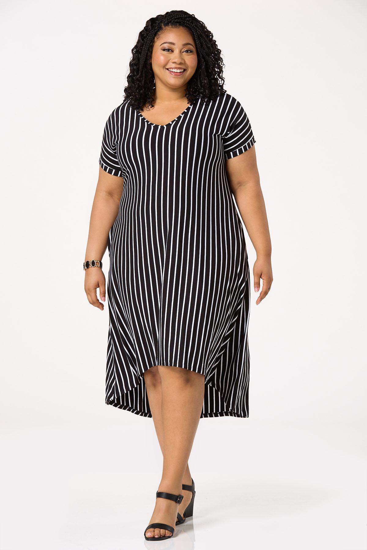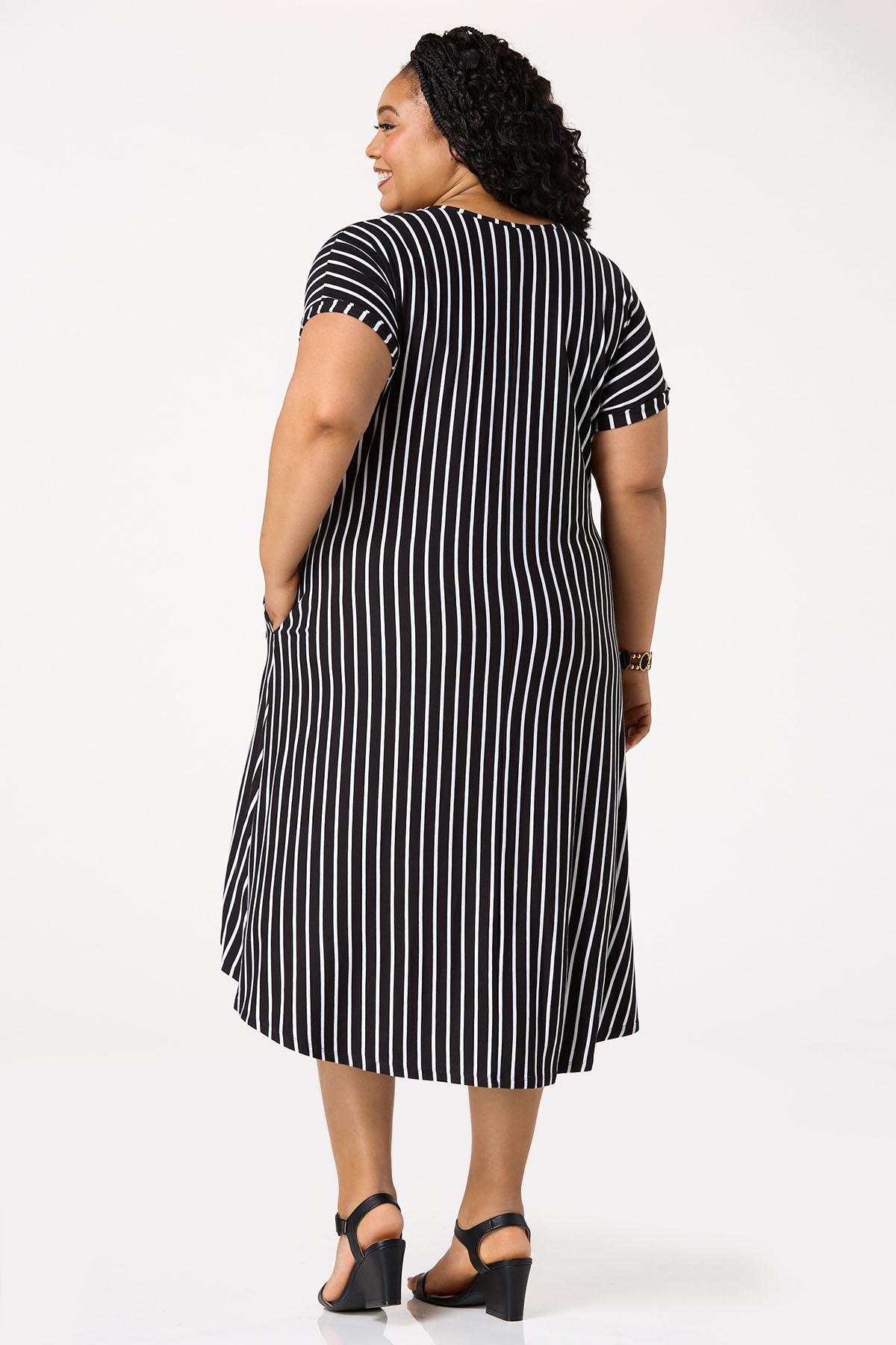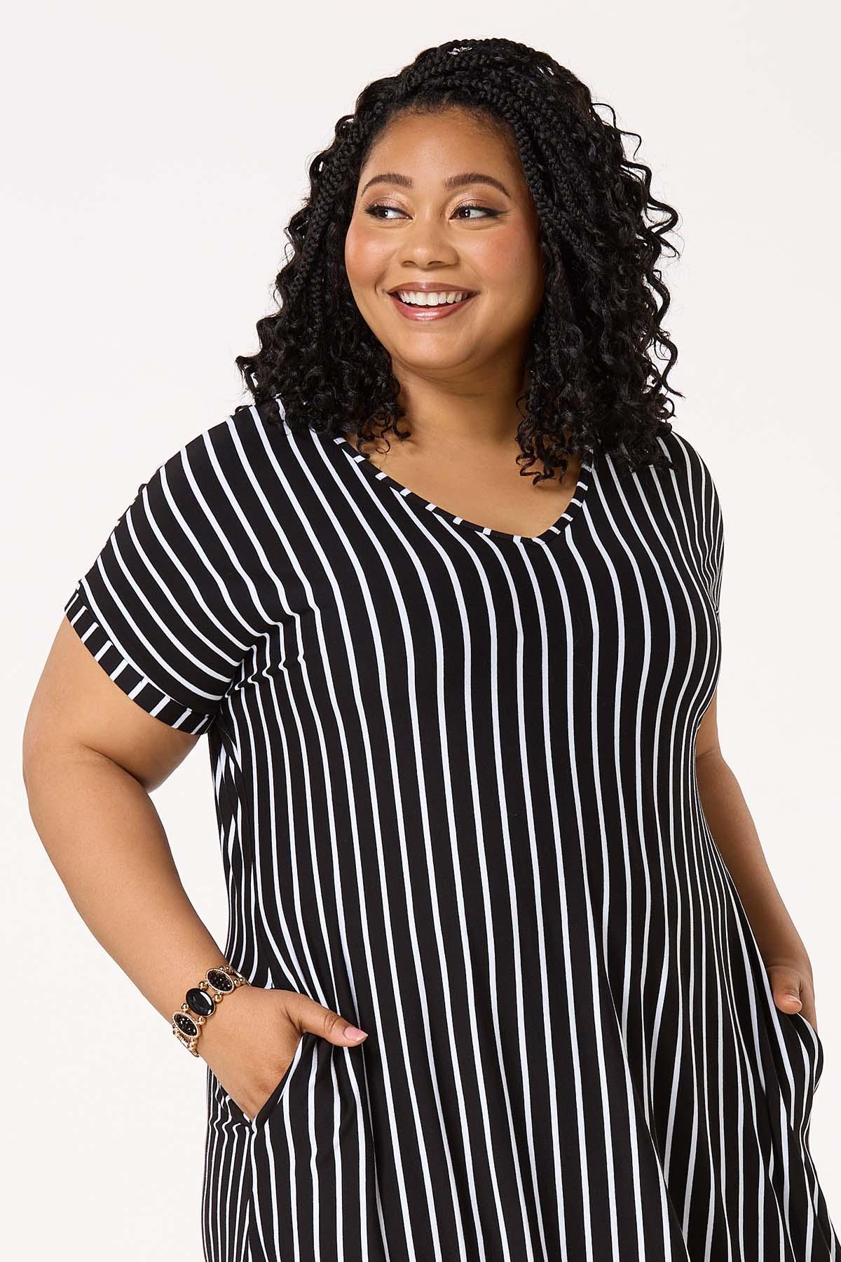Make a sleek statement in this high-low t-shirt dress, where bold vertical white stripes on a black backdrop elongate your silhouette with effortless edge.