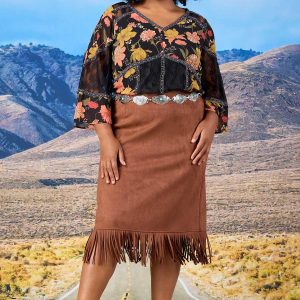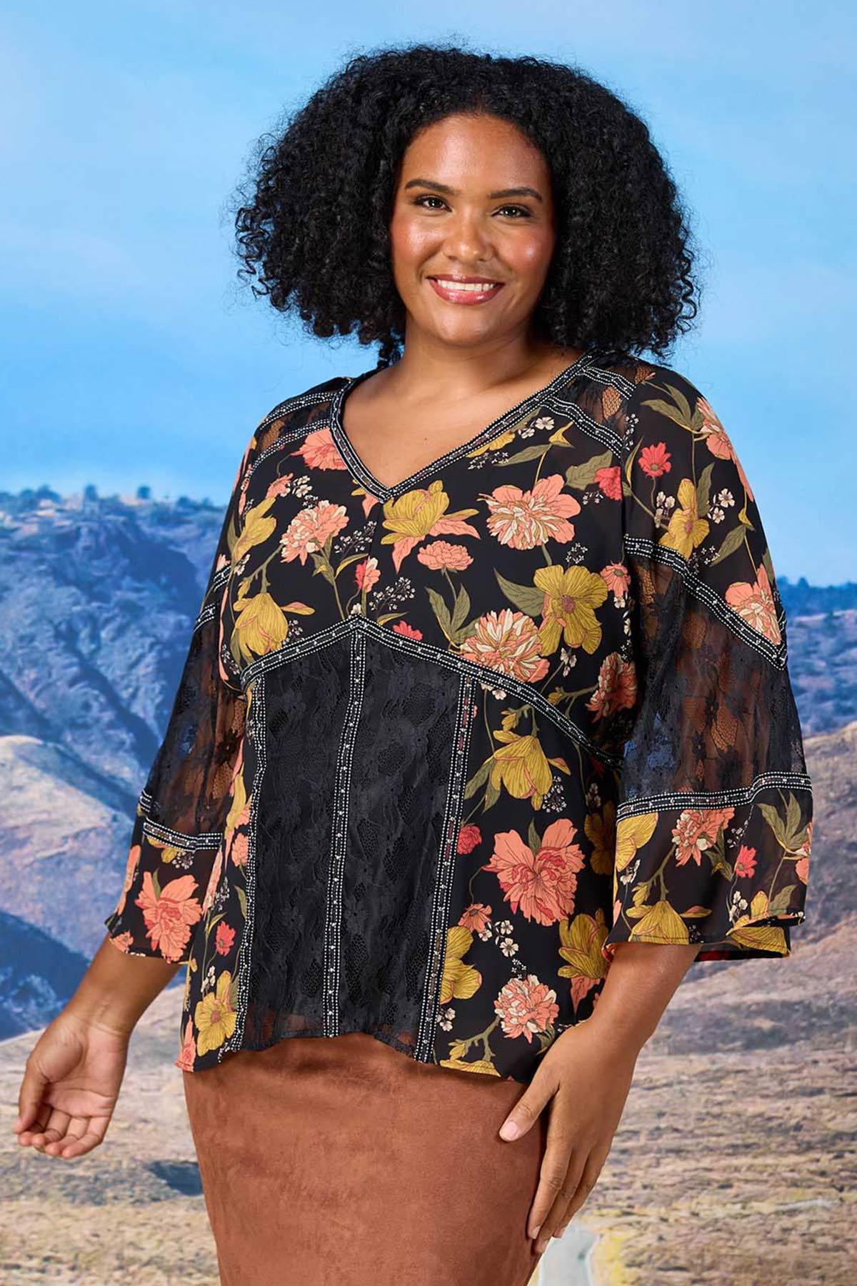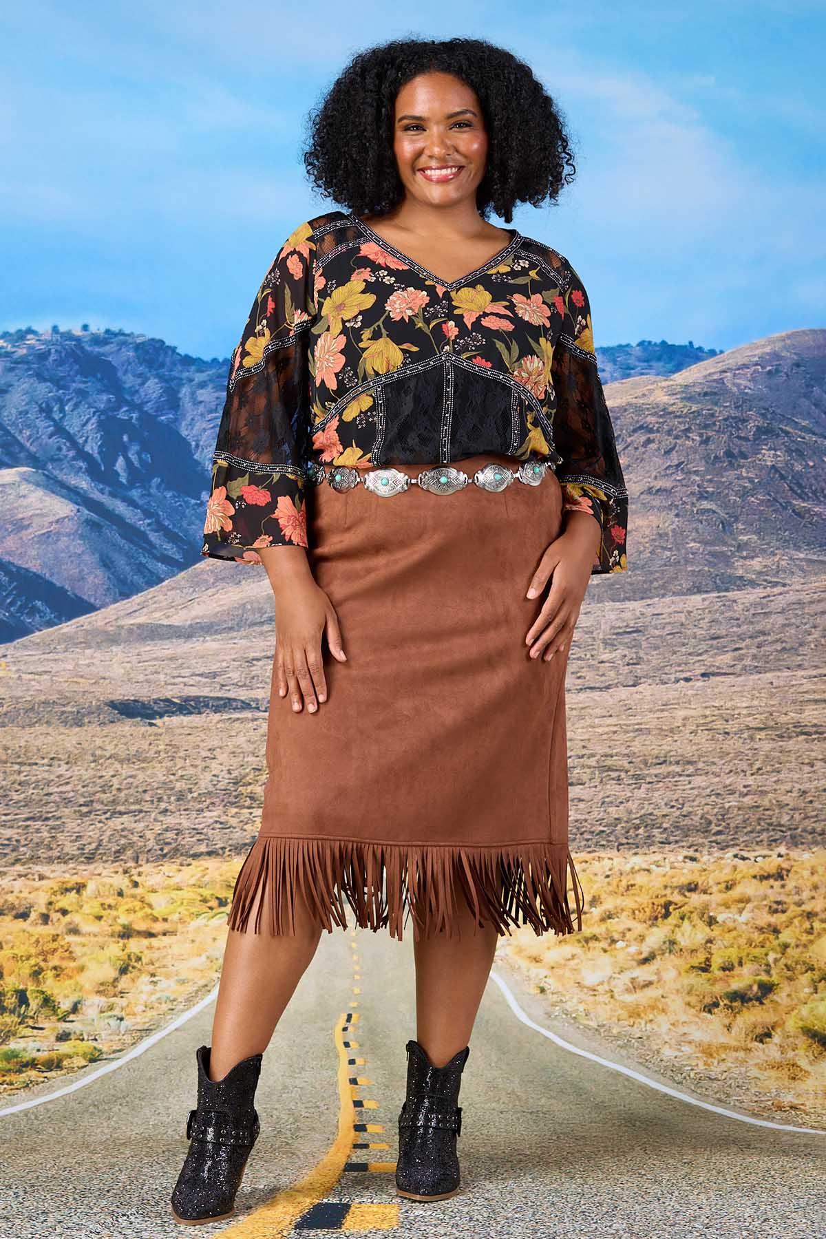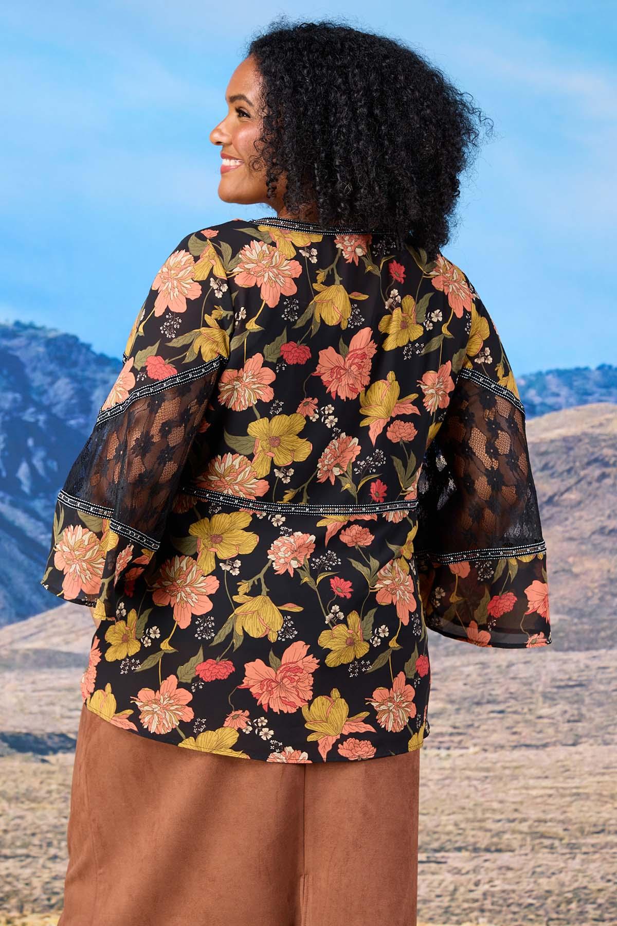 Turn heads from stage to sunset in this dreamy studded lace floral top. With flowy bell sleeves and boho charm, it’s made for dancing. Style it with a faux suede skirt or flare jeans for that fun festival glow.