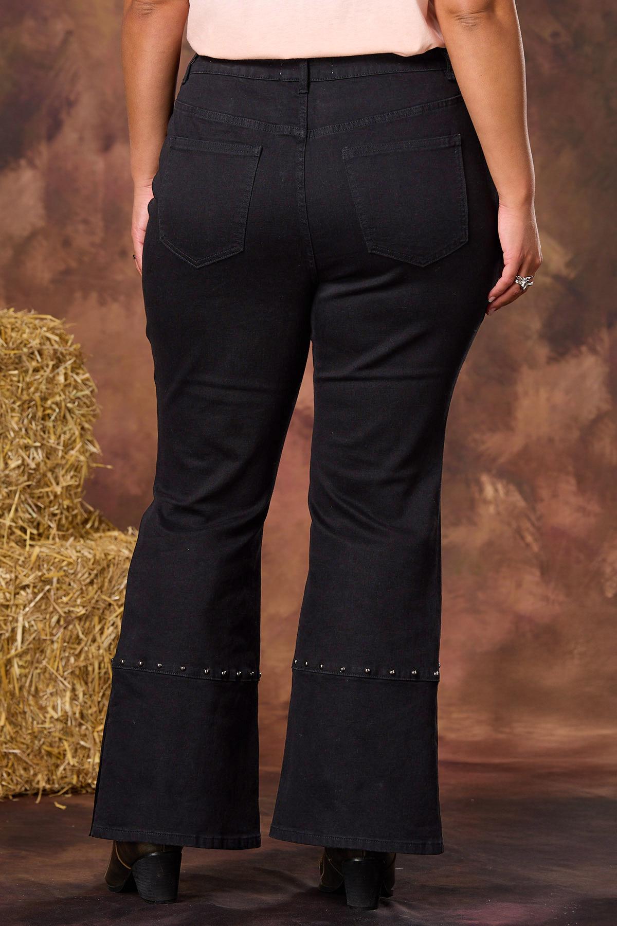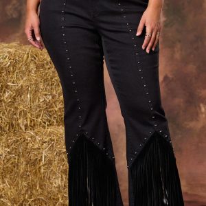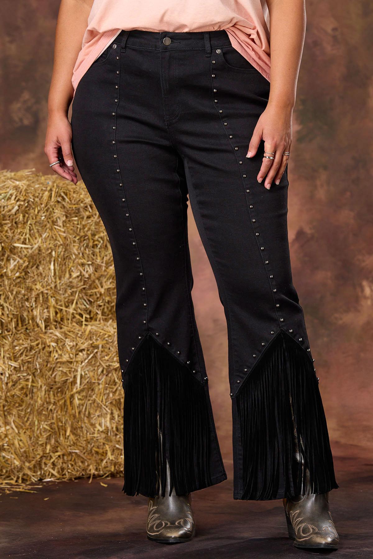 Concerts, karaoke nights and Nashville weekends were meant for this fun, statement style. A comfortable-stretch denim gets dolled up with silver-stud accents, velvet fringe trim and a slit flare hem for a look that’s ready to rock and roll.