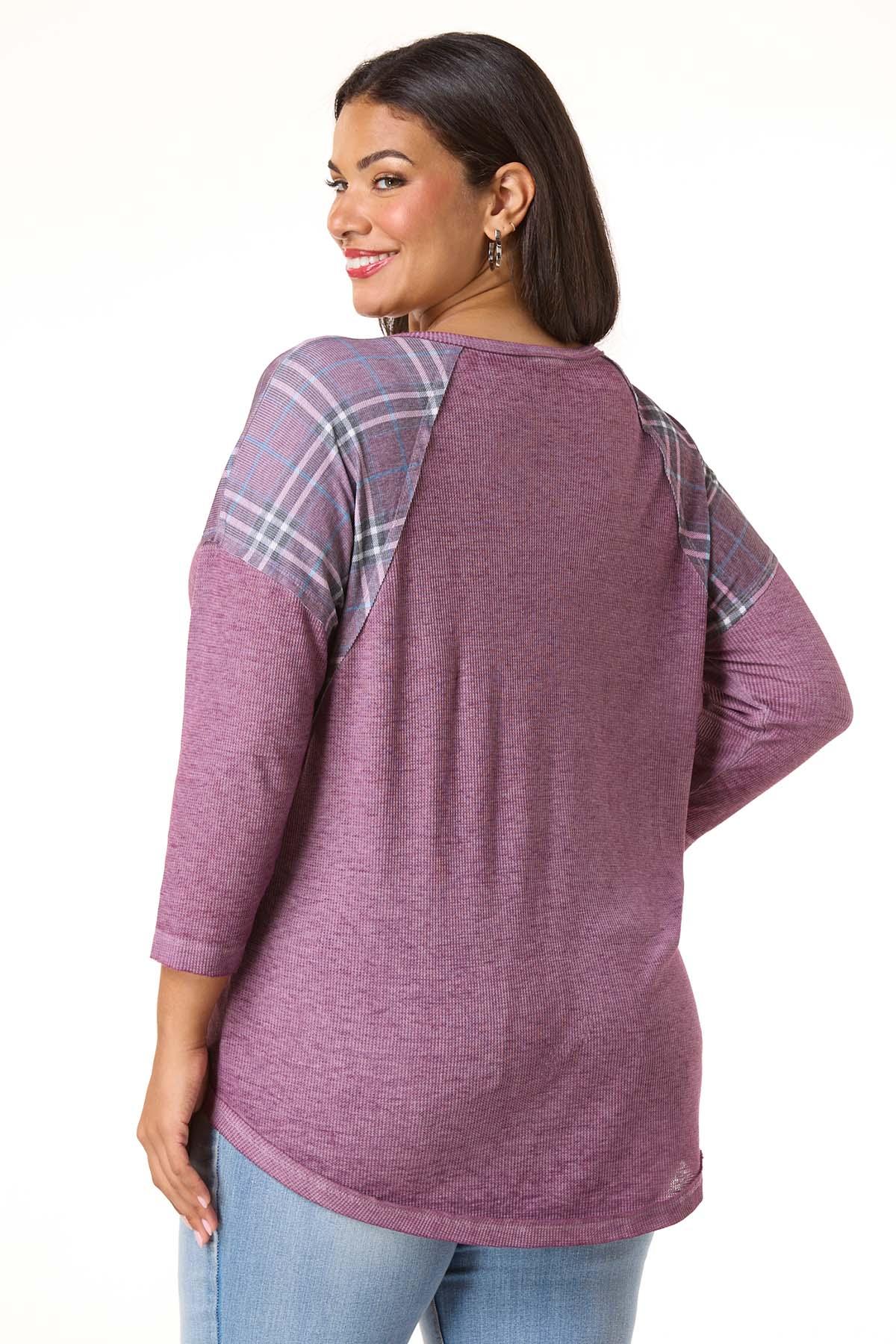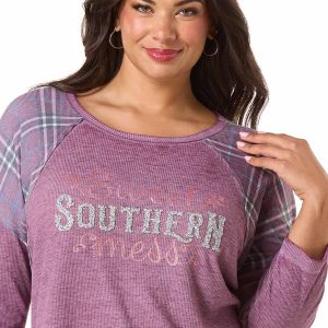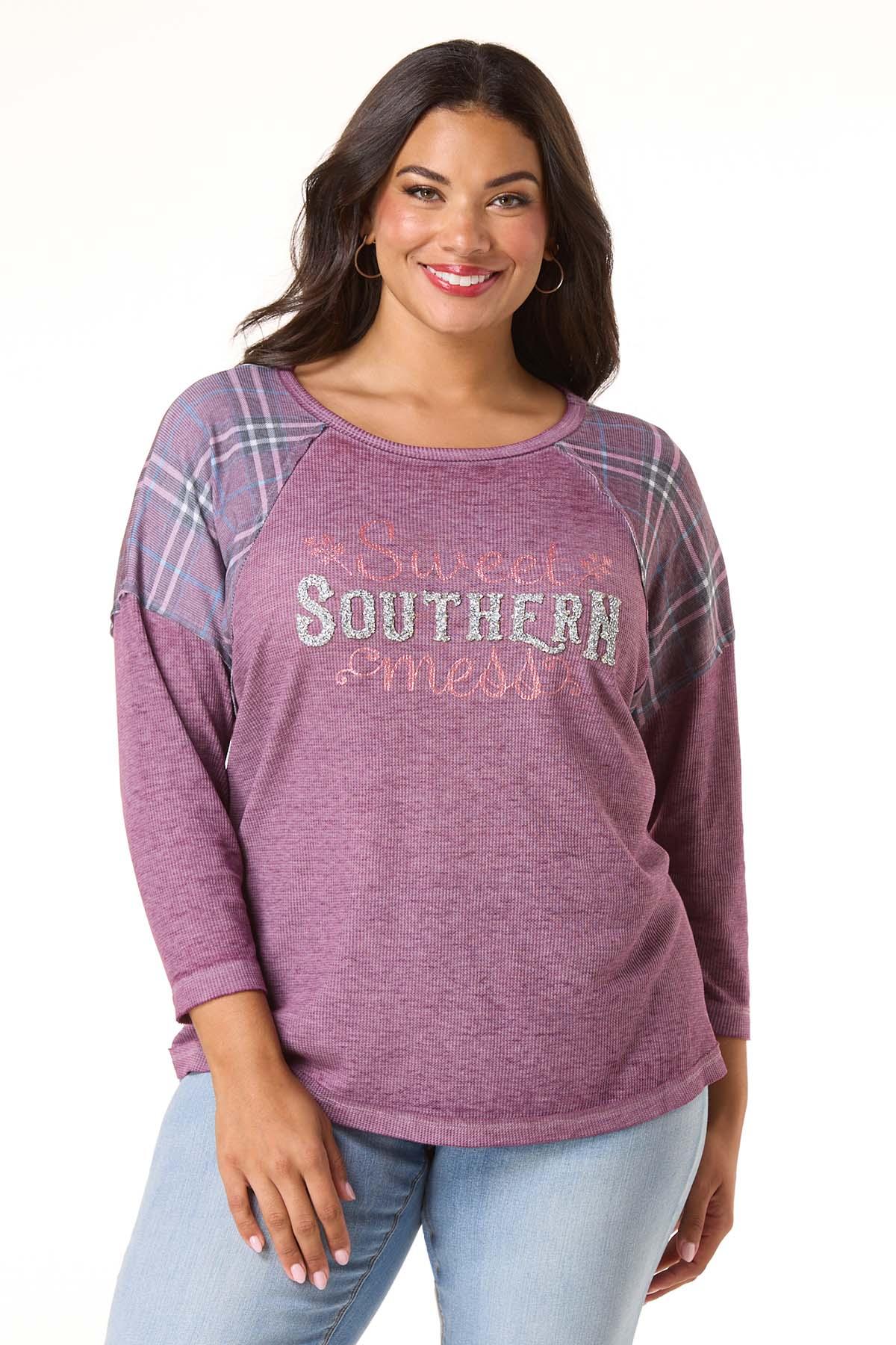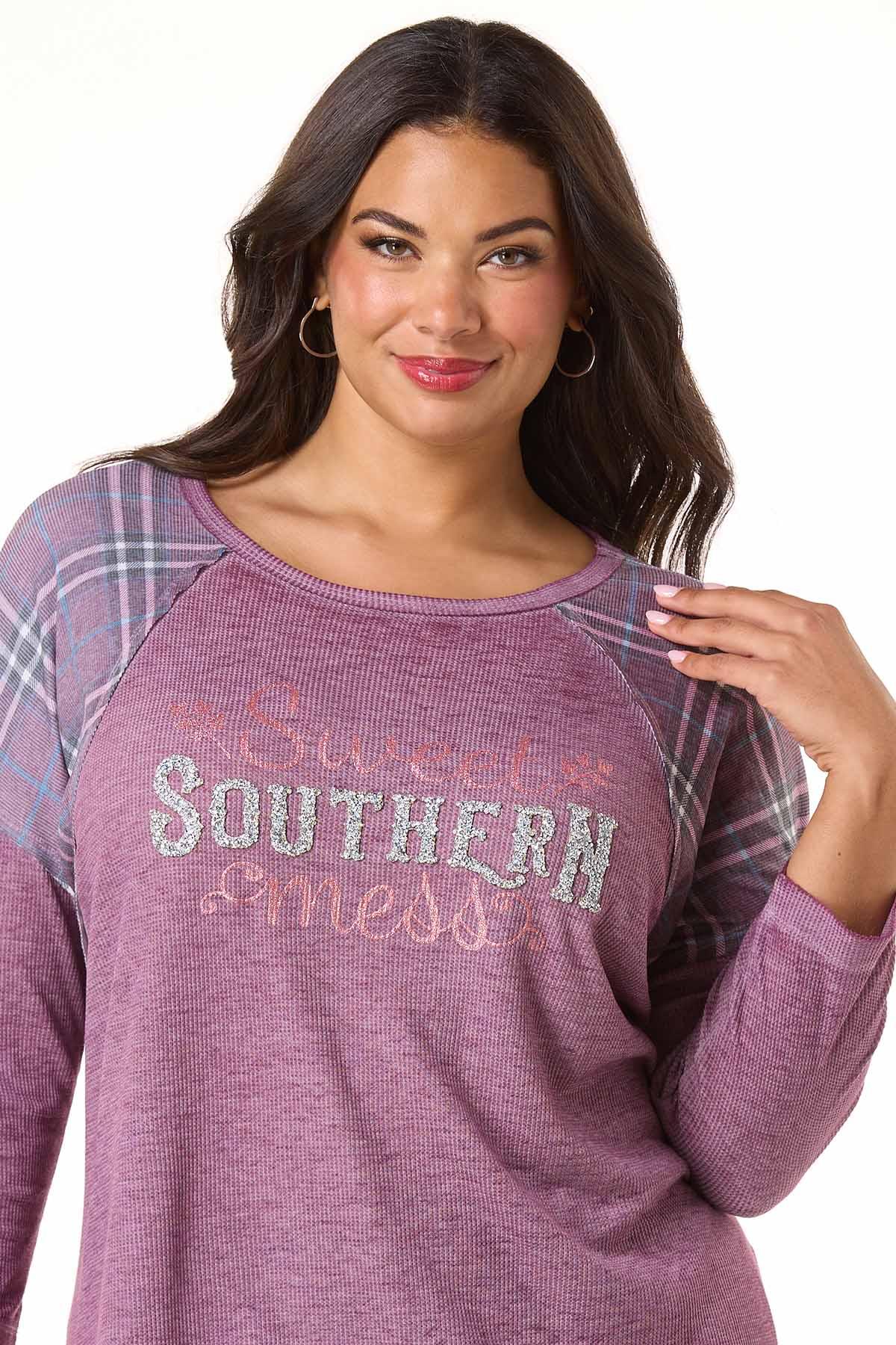 Keep it cute, casual and playful all at the same time with this waffled-knit style, featuring a scoop neckline, relaxed fit, plaid panels and a “sweet southern mess” graphic with a glittery finish.