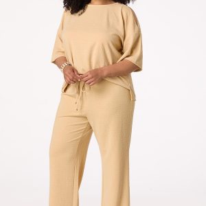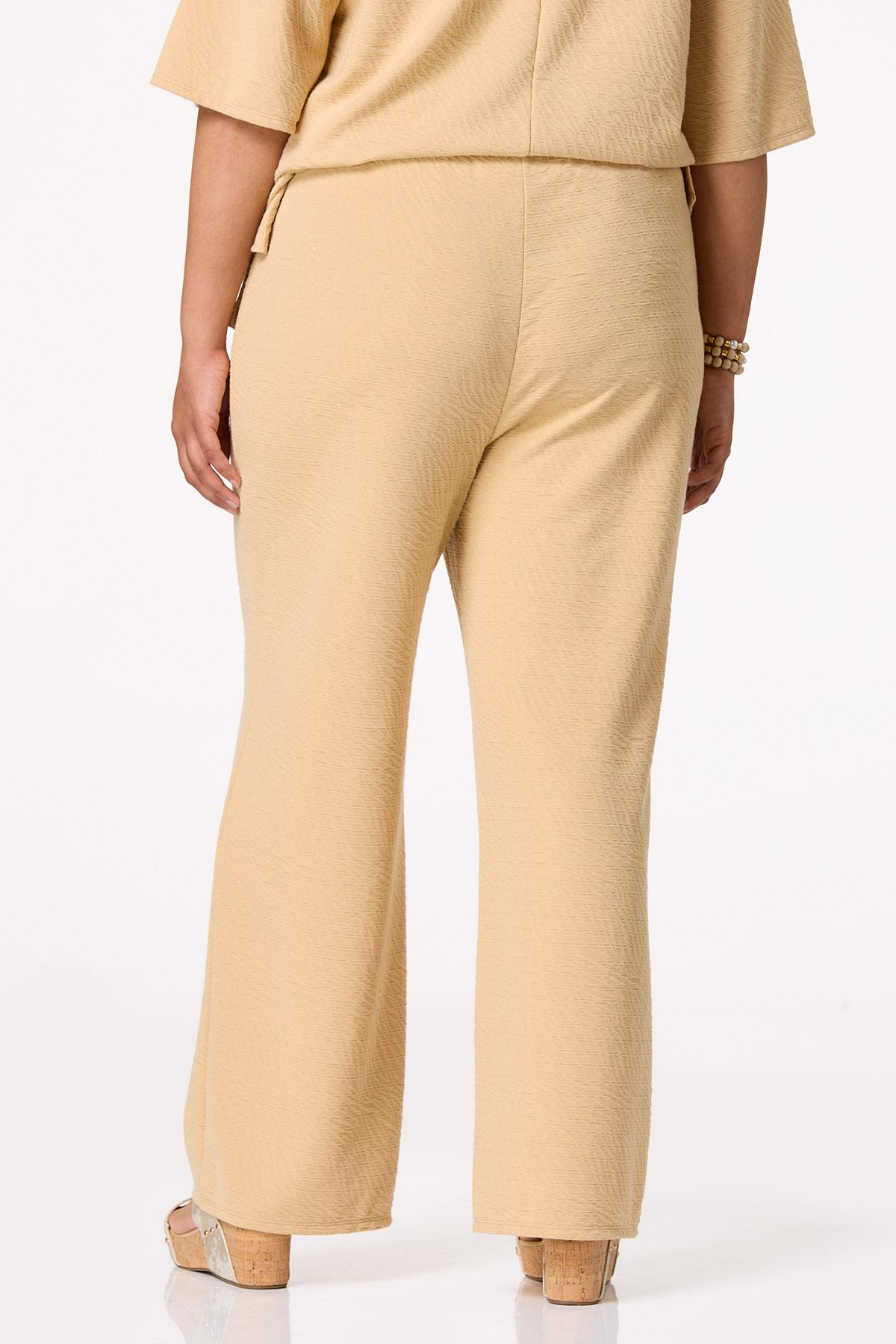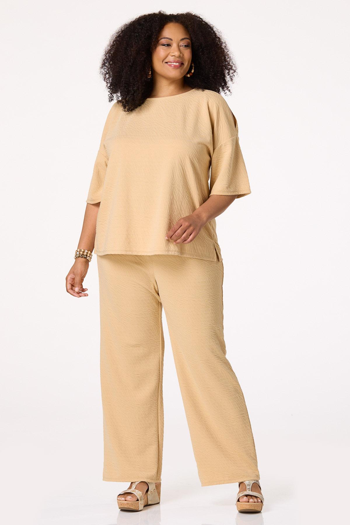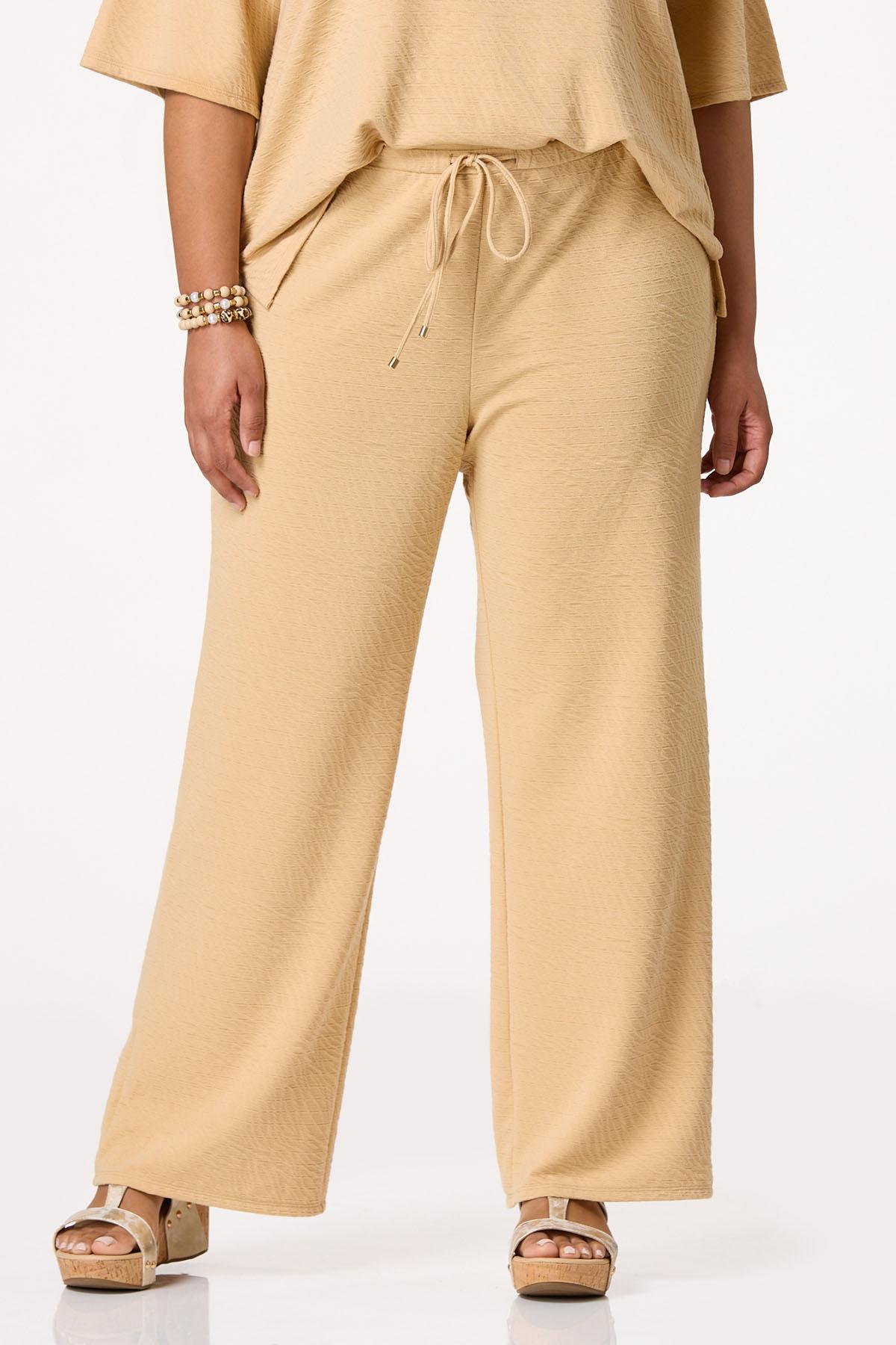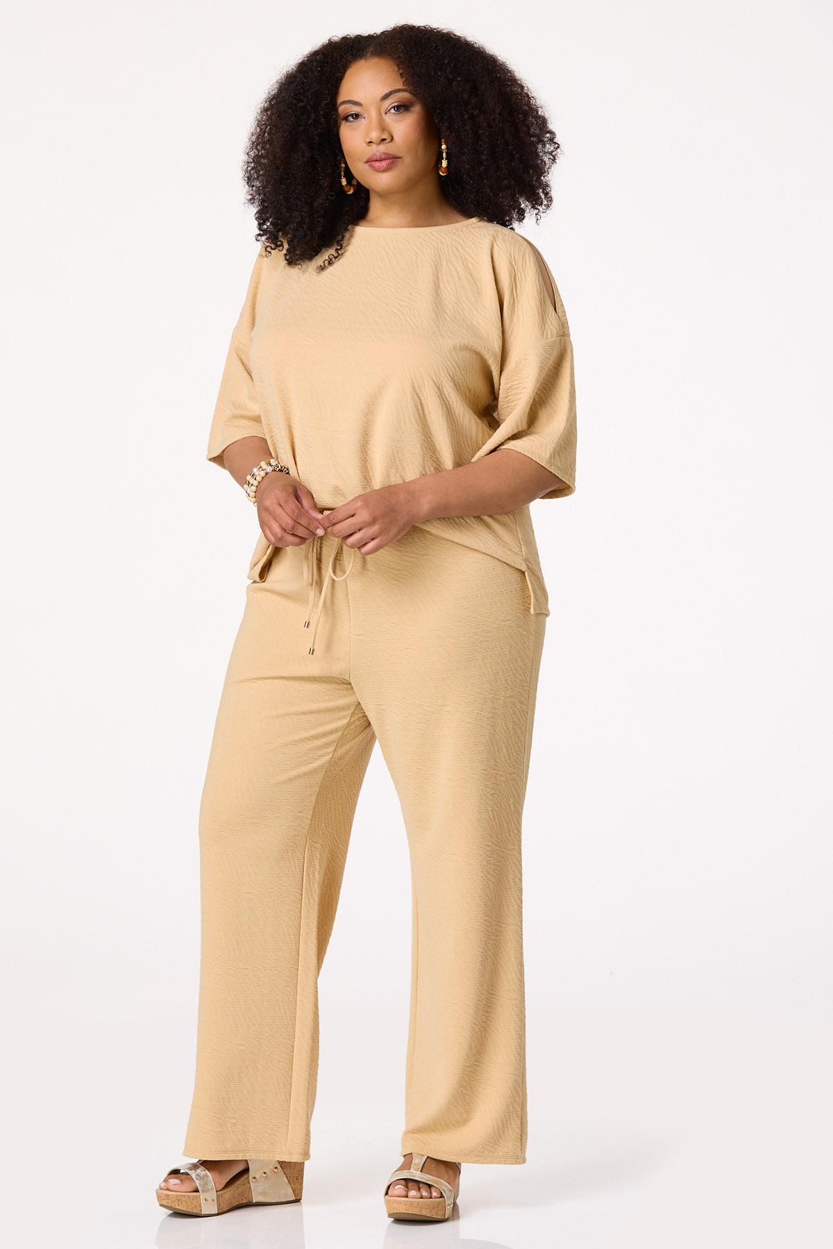 Make a memorable impression when you show up wearing this breezy, wide leg style, featuring a stretchy-drawstring waist, neutral hue and crinkled knit, making it the perfect match to our textured cold shoulder top.