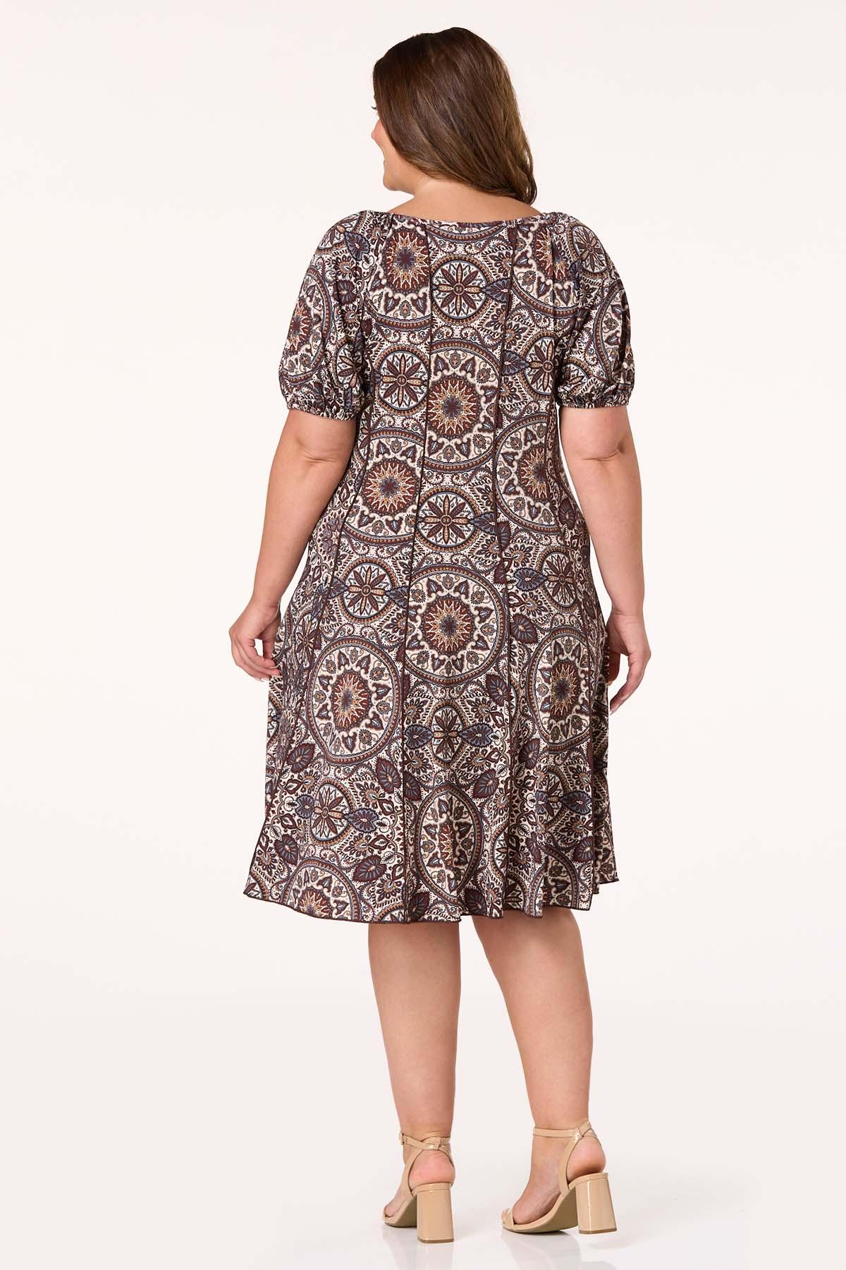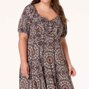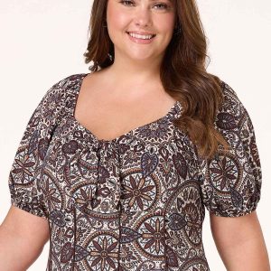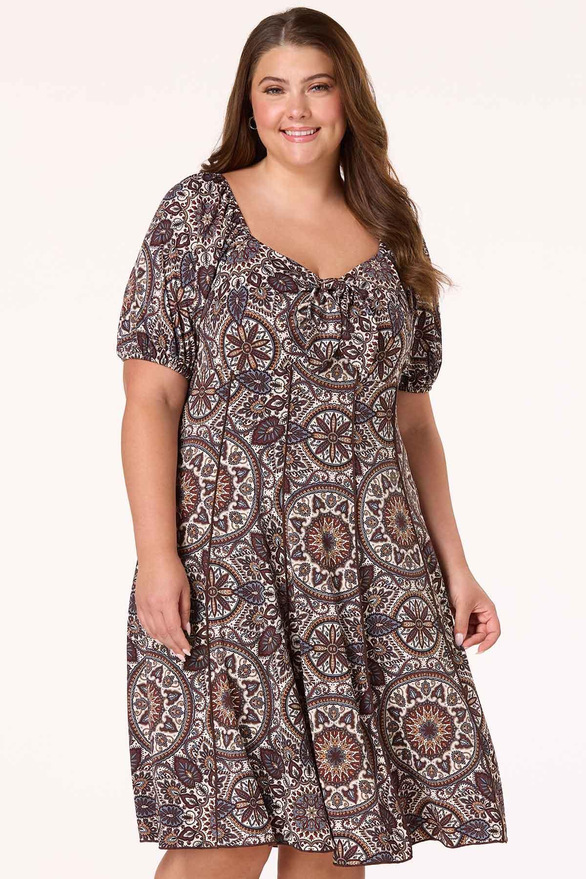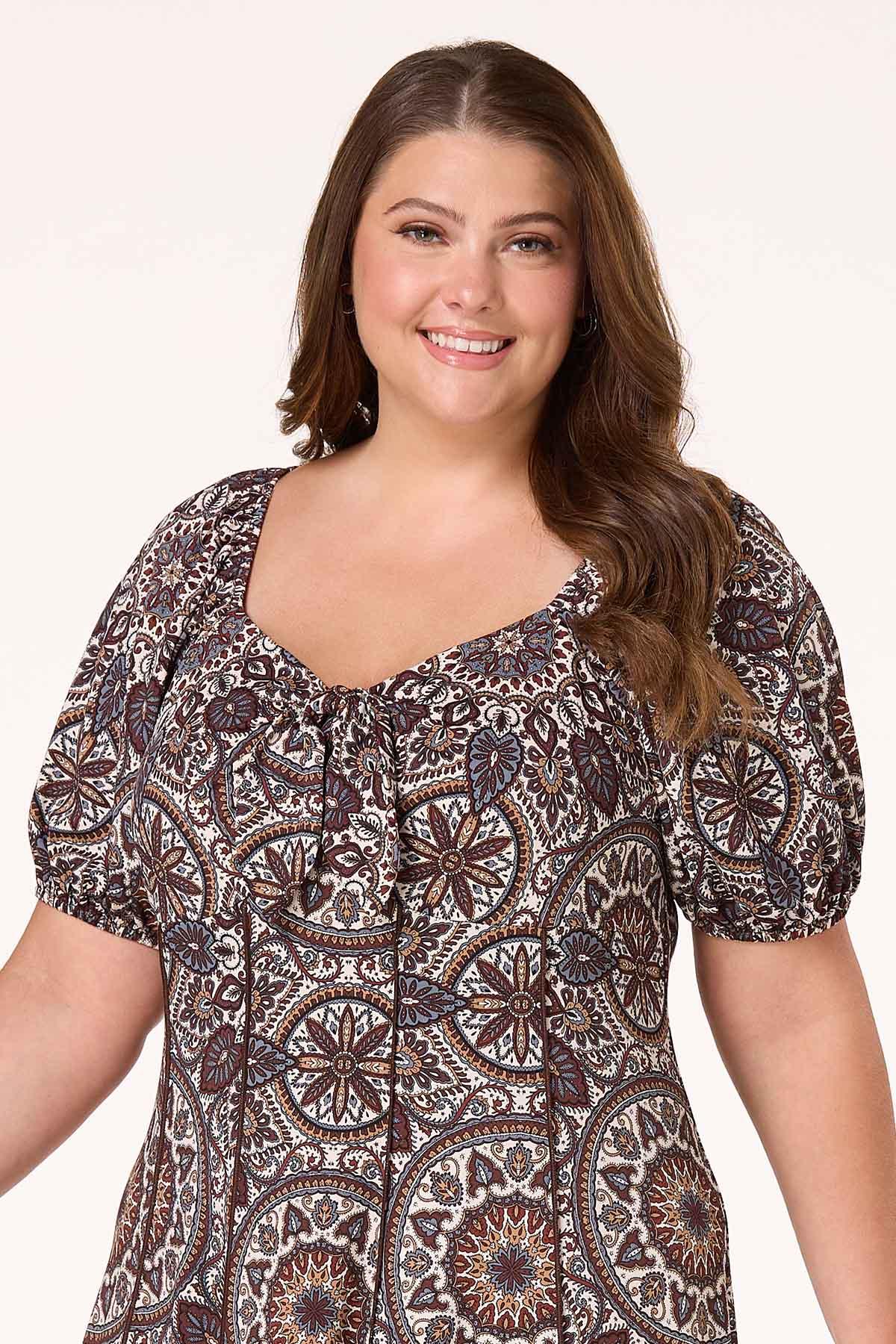 One of our best-selling silhouettes will have you dressing up and showing up looking amazing with its sleek-stretch fabric, seamed design, balloon sleeves and tie front detail topping a floral medallion print.
